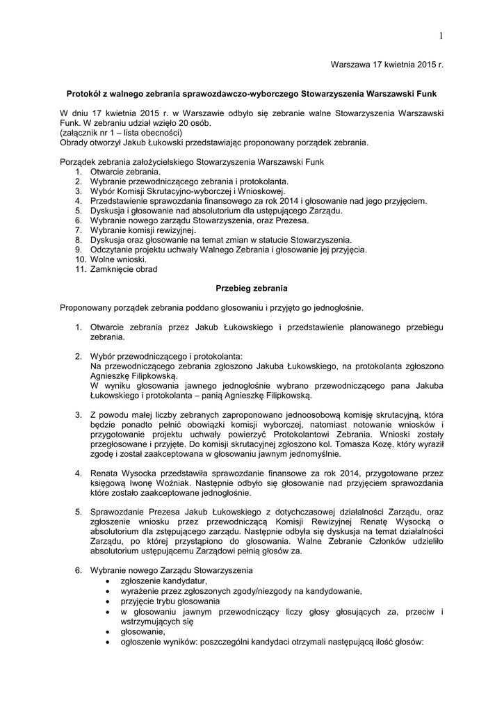 1 Warszawa 17 kwietnia 2015 r. Protokół z walnego zebrania sprawozdawczo-wyborczego Stowarzyszenia Warszawski Funk W dniu 17 kwietnia 2015 r. w Warszawie odbyło się zebranie walne Stowarzyszenia Warszawski Funk. W zebraniu udział wzięło 20 osób. (załącznik nr 1 – lista obecności) Obrady otworzył Jakub Łukowski przedstawiając proponowany porządek zebrania. Porządek zebrania założycielskiego Stowarzyszenia Warszawski Funk 1. Otwarcie zebrania. 2. Wybranie przewodniczącego zebrania i protokolanta. 3. Wybór Komisji Skrutacyjno-wyborczej i Wnioskowej. 4. Przedstawienie sprawozdania finansowego za rok 2014 i głosowanie nad jego przyjęciem. 5. Dyskusja i głosowanie nad absolutorium dla ustępującego Zarządu. 6. Wybranie nowego zarządu Stowarzyszenia, oraz Prezesa. 7. Wybranie komisji rewizyjnej. 8. Dyskusja oraz głosowanie na temat zmian w statucie Stowarzyszenia. 9. Odczytanie projektu uchwały Walnego Zebrania i głosowanie jej przyjęcia. 10. Wolne wnioski. 11. Zamknięcie obrad Przebieg zebrania Proponowany porządek zebrania poddano głosowaniu i przyjęto go jednogłośnie. 1. Otwarcie zebrania przez Jakub Łukowskiego i przedstawienie planowanego przebiegu zebrania. 2. Wybór przewodniczącego i protokolanta: Na przewodniczącego zebrania zgłoszono Jakuba Łukowskiego, na protokolanta zgłoszono Agnieszkę Filipkowską. W wyniku głosowania jawnego jednogłośnie wybrano przewodniczącego pana Jakuba Łukowskiego i protokolanta – panią Agnieszkę Filipkowską. 3. Z powodu małej liczby zebranych zaproponowano jednoosobową komisję skrutacyjną, która będzie ponadto pełnić obowiązki komisji wyborczej, natomiast notowanie wniosków i przygotowanie projektu uchwały powierzyć Protokolantowi Zebrania. Wnioski zostały przegłosowane i przyjęte. Do komisji skrutacyjnej zgłoszono kol. Tomasza Kozę, który wyraził zgodę i został zaakceptowana w głosowaniu jawnym jednomyślnie. 4. Renata Wysocka przedstawiła sprawozdanie finansowe za rok 2014, przygotowane przez księgową Iwonę Woźniak. Następnie odbyło się głosowanie nad przyjęciem sprawozdania które zostało zaakceptowane jednogłośnie. 5. Sprawozdanie Prezesa Jakub Łukowskiego z dotychczasowej działalności Zarządu, oraz zgłoszenie wniosku przez przewodniczącą Komisji Rewizyjnej Renatę Wysocką o absolutorium dla zstępującego zarządu. Następnie odbyła się dyskusja na temat działalności Zarządu, po której przystąpiono do głosowania. Walne Zebranie Członków udzieliło absolutorium ustępującemu Zarządowi pełnią głosów za. 6. Wybranie nowego Zarządu Stowarzyszenia zgłoszenie kandydatur, wyrażenie przez zgłoszonych zgody/niezgody na kandydowanie, przyjęcie trybu głosowania w głosowaniu jawnym przewodniczący liczy głosy głosujących za, przeciw i wstrzymujących się głosowanie, ogłoszenie wyników: poszczególni kandydaci otrzymali następującą ilość głosów: 2 1. Jakub Łukowski – 19 za 2. Konrad Wierzchowski – 19 za 3. Adrianna Wróbel – 19 za 4. Agnieszka Filipkowska – 19 za . Podjęcie uchwały o zmianie Zarządu oraz określenie funkcji pełnionej przez poszczególne osoby wybrane do zarządu. 7. Wybranie nowej Komisji Rewizyjnej zgłoszenie kandydatur, wyrażenie przez zgłoszonych zgody/niezgody na kandydowanie, przyjęcie trybu głosowania w głosowaniu jawnym przewodniczący liczy głosy głosujących za, przeciw i wstrzymujących się głosowanie, ogłoszenie wyników: poszczególni kandydaci otrzymali następującą ilość głosów: 1. Michał Fabijanek – 19 za 2. Tomasz Koza – 19 za 3. Karolina Markowska – 19 za 4. Cezary Prośniak – 19 za . Podjęcie uchwały o powołaniu komisji rewizyjnej oraz określenie funkcji pełnionej przez poszczególne osoby wybrane do komisji rewizyjnej. 8. Następnie przedstawiono propozycje zmian w statucie, mających na celu dodania wpisu o możliwości prowadzenia odpłatnej działalności pożytku publicznego. Propozycje zmian zostały przyjęte jednogłośnie. 9. Po dokonaniu wyborów, nowo wybrany Prezes zgłosił pakiet wniosków do uchwały Walnego Zebrania, które Przewodniczący Zebrania spisał i zaproponował jako treść Uchwały Walnego Zebrania Sprawozdawczo-Wyborczego Stowarzyszenia Warszawski Funk. 10. Wolne wnioski 11. Na tym zebranie zakończono. Załączniki do protokołu: 1. lista obecności, 2. uchwały podjęte na zebraniu założycielskim: ● uchwała nr 1/2015 o przyjęciu sprawozdania finansowego za rok 2014 ● uchwała nr 2/2014 o wyborze nowego zarządu Stowarzyszenia Warszawski Funk, ● uchwała nr 3/2014 o wyborze nowej komisji rewizyjnej Stowarzyszenia Warszawski Funk ● uchwała nr 4/2014 o zmianach w Statucie Stowarzyszenia Warszawski Funk Przewodniczący Protokolant