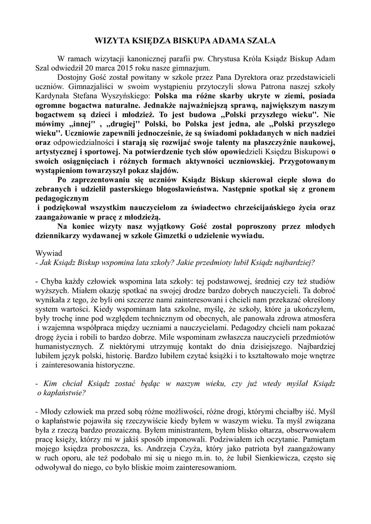 WIZYTA KSIĘDZA BISKUPA ADAMA SZALA W ramach wizytacji kanonicznej parafii pw. Chrystusa Króla Ksiądz Biskup Adam Szal odwiedził 20 marca 2015 roku nasze gimnazjum. Dostojny Gość został powitany w szkole przez Pana Dyrektora oraz przedstawicieli uczniów. Gimnazjaliści w swoim wystąpieniu przytoczyli słowa Patrona naszej szkoły Kardynała Stefana Wyszyńskiego: Polska ma różne skarby ukryte w ziemi, posiada ogromne bogactwa naturalne. Jednakże najważniejszą sprawą, największym naszym bogactwem są dzieci i młodzież. To jest budowa ,,Polski przyszłego wieku''. Nie mówimy ,,innej'' , ,,drugiej'' Polski, bo Polska jest jedna, ale ,,Polski przyszłego wieku''. Uczniowie zapewnili jednocześnie, że są świadomi pokładanych w nich nadziei oraz odpowiedzialności i starają się rozwijać swoje talenty na płaszczyźnie naukowej, artystycznej i sportowej. Na potwierdzenie tych słów opowiedzieli Księdzu Biskupowi o swoich osiągnięciach i różnych formach aktywności uczniowskiej. Przygotowanym wystąpieniom towarzyszył pokaz slajdów. Po zaprezentowaniu się uczniów Ksiądz Biskup skierował ciepłe słowa do zebranych i udzielił pasterskiego błogosławieństwa. Następnie spotkał się z gronem pedagogicznym i podziękował wszystkim nauczycielom za świadectwo chrześcijańskiego życia oraz zaangażowanie w pracę z młodzieżą. Na koniec wizyty nasz wyjątkowy Gość został poproszony przez młodych dziennikarzy wydawanej w szkole Gimzetki o udzielenie wywiadu. Wywiad - Jak Ksiądz Biskup wspomina lata szkoły? Jakie przedmioty lubił Ksiądz najbardziej? - Chyba każdy człowiek wspomina lata szkoły: tej podstawowej, średniej czy też studiów wyższych. Miałem okazję spotkać na swojej drodze bardzo dobrych nauczycieli. Ta dobroć wynikała z tego, że byli oni szczerze nami zainteresowani i chcieli nam przekazać określony system wartości. Kiedy wspominam lata szkolne, myślę, że szkoły, które ja ukończyłem, były trochę inne pod względem technicznym od obecnych, ale panowała zdrowa atmosfera i wzajemna współpraca między uczniami a nauczycielami. Pedagodzy chcieli nam pokazać drogę życia i robili to bardzo dobrze. Mile wspominam zwłaszcza nauczycieli przedmiotów humanistycznych. Z niektórymi utrzymuję kontakt do dnia dzisiejszego. Najbardziej lubiłem język polski, historię. Bardzo lubiłem czytać książki i to kształtowało moje wnętrze i zainteresowania historyczne. - Kim chciał Ksiądz zostać będąc w naszym wieku, czy już wtedy myślał Ksiądz o kapłaństwie? - Młody człowiek ma przed sobą różne możliwości, różne drogi, którymi chciałby iść. Myśl o kapłaństwie pojawiła się rzeczywiście kiedy byłem w waszym wieku. Ta myśl związana była z rzeczą bardzo prozaiczną. Byłem ministrantem, byłem blisko ołtarza, obserwowałem pracę księży, którzy mi w jakiś sposób imponowali. Podziwiałem ich oczytanie. Pamiętam mojego księdza proboszcza, ks. Andrzeja Czyża, który jako patriota był zaangażowany w ruch oporu, ale też podobało mi się u niego m.in. to, że lubił Sienkiewicza, często się odwoływał do niego, co było bliskie moim zainteresowaniom. - Czy miał Ksiądz Biskup okazję spotkania z Patronem naszej szkoły Kardynałem Stefanem Wyszyńskim? - Miałem okazję spotkać się z Patronem waszej szkoły, kiedy jako kleryk przebywałem w Przemyślu, a Kardynał odwiedzał seminarium. Te okazje były stosunkowo rzadkie, ze względu na odległość od Warszawy. Pamiętam jednak, że towarzyszyła Mu taka aura świadka wiary, świadka patriotyzmu. Te spotkania miały miejsce, gdy w Przemyślu odbywały się duże uroczystości kościelne, nie były to jednak spotkania osobiste, kiedy można było porozmawiać. Ja byłem młodym klerykiem, a Prymas przybywał w określonym celu, np. na uroczystość lub załatwiał jakąś sprawę. Zawsze jednak do nas przemawiał, zachęcał. - Jakie są zainteresowania Księdza Biskupa niezwiązane z posługą kapłańską? - Życiu każdego człowieka towarzyszą różne zainteresowania, hobby. Ja mam sporo takich pasji. Oczywiście tą główną jest służba Panu Bogu w kapłaństwie, służba ludziom i spełnianie swoich obowiązków. A oprócz tego pozostało mi zamiłowanie do książek, które z konieczności traktuję inaczej. W szkole średniej pochłaniałem książki historyczne oraz powieści przygodowe, natomiast teraz sięgam po książki, które są dla mnie pomocą w posłudze. Moją pasją jest również biblioteka, rozumiana jako gromadzenie książek dla potomności. Miałem to szczęście, że już jako ksiądz zostałem skierowany do pracy w bibliotece Seminarium Duchownego w Przemyślu, byłem tam kilka ładnych lat, porządkowałem, udostępniałem i komputeryzowałem księgozbiór. Obecnie opiekuję się, może mało znaną, Biblioteką Kapituły Przemyskiej. Kapituła to jest taka organizacja, związek księży, którzy są zebrani w jednym budynku, to ma swoją historyczną tradycję. Nasza kapituła pochodzi z XIV w. i ma kilkudziesięciotysięczne zbiory, które staram się porządkować. Moją szczególną pasją są wędrówki, te dłuższe i te krótsze. Są też inne pasje, jak spotkanie z drugim człowiekiem, w ramach Ruchu Światło Życie, którego jestem opiekunem z ramienia Konferencji Episkopatu. - Słyszeliśmy, że od wielu lat Ksiądz Biskup pielgrzymuje. W jaki sposób zachęciłby Ksiądz nas gimnazjalistów do wzięcia udziału w pielgrzymce? - To prawda, wędruję od wielu lat. Już ponad 30 razy byłem na pielgrzymce na Jasną Górę. Jeśli by zliczyć te dni, to oznacza, że rok życia spędziłem na wędrowaniu na Jasną Górę, nie licząc innych wędrówek. To jest piękna przygoda, która człowieka zafascynowanego pielgrzymką „trzyma” przez cały rok. Przed pielgrzymką czekamy na wyjście, po pielgrzymce wspominamy i myślimy co dalej. Z Przemyśla idzie około 1500 ludzi, w tym około 5