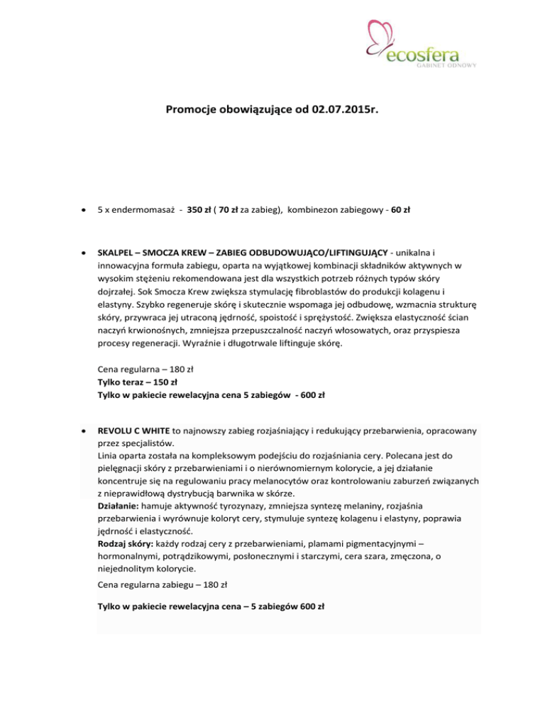 Promocje obowiązujące od 02.07.2015r. 5 x endermomasaż - 350 zł ( 70 zł za zabieg), kombinezon zabiegowy - 60 zł SKALPEL – SMOCZA KREW – ZABIEG ODBUDOWUJĄCO/LIFTINGUJĄCY - unikalna i innowacyjna formuła zabiegu, oparta na wyjątkowej kombinacji składników aktywnych w wysokim stężeniu rekomendowana jest dla wszystkich potrzeb różnych typów skóry dojrzałej. Sok Smocza Krew zwiększa stymulację fibroblastów do produkcji kolagenu i elastyny. Szybko regeneruje skórę i skutecznie wspomaga jej odbudowę, wzmacnia strukturę skóry, przywraca jej utraconą jędrność, spoistość i sprężystość. Zwiększa elastyczność ścian naczyń krwionośnych, zmniejsza przepuszczalność naczyń włosowatych, oraz przyspiesza procesy regeneracji. Wyraźnie i długotrwale liftinguje skórę. Cena regularna – 180 zł Tylko teraz – 150 zł Tylko w pakiecie rewelacyjna cena 5 zabiegów - 600 zł REVOLU C WHITE to najnowszy zabieg rozjaśniający i redukujący przebarwienia, opracowany przez specjalistów. Linia oparta została na kompleksowym podejściu do rozjaśniania cery. Polecana jest do pielęgnacji skóry z przebarwieniami i o nierównomiernym kolorycie, a jej działanie koncentruje się na regulowaniu pracy melanocytów oraz kontrolowaniu zaburzeń związanych z nieprawidłową dystrybucją barwnika w skórze. Działanie: hamuje aktywność tyrozynazy, zmniejsza syntezę melaniny, rozjaśnia przebarwienia i wyrównuje koloryt cery, stymuluje syntezę kolagenu i elastyny, poprawia jędrność i elastyczność. Rodzaj skóry: każdy rodzaj cery z przebarwieniami, plamami pigmentacyjnymi – hormonalnymi, potrądzikowymi, posłonecznymi i starczymi, cera szara, zmęczona, o niejednolitym kolorycie. Cena regularna zabiegu – 180 zł Tylko w pakiecie rewelacyjna cena – 5 zabiegów 600 zł Oxybrazja + RF (fale radiowe) – odświeżenie, peeling i lifting w jednym Cena promocyjna zabiegu: - twarz – 180 zł - twarz + szyja + dekolt – 210 zł W pakiecie zawsze taniej - zadzwoń ( tel. 889 600 650) i zapytaj o cenę pakietu. Mezoterapia bezigłowa z ampułką ACTIVE 4D LIFTING ( zawiera składniki aktywne przeznaczone dla cery dojrzałej, suchej, wrażliwej, z obniżoną elastycznością. Głównym składnikiem jest ACTIVE 4D Express Lifting - polimer cukrowy wywołujący natychmiastowy efekt liftingu oraz kwas hialuronowy . Cena regularna: - twarz – 180 zł - twarz + szyja + dekolt – 250 zł Cena promocyjna: - twarz – 160 zł - twarz + szyja + dekolt – 200 zł W pakiecie zawsze taniej - zadzwoń ( tel. 889 600 650) i zapytaj o cenę pakietu. SPEŁNIONA OBIETNICA – ZABIEG UJĘDRNIAJĄCO - NAWILŻAJACY O CUDOWNYM AROMACIE ŚWIEŻYCH TRUSKAWEK dla spragnionych lata i aksamitnej skóry Cena regularna – 120 zł Cena promocyjna – 100 zł MAGNETYCZNE SPOJRZENIE – ZABIEG NA OKOLICE OCZU Specyficzny zabieg wskazany dla delikatnej i wrażliwej skóry w okolicach oczu. Zabieg pobudza mikrocyrkulację krwi i limfy, oparty jest na formule Nourishing Botamix, na którą składają się odżywcze ekstrakty z kasztanowca, owsa i pszenicy: przeciwdziałające stanom zapalnym i zastojom limfatycznym oraz niwelujące zasinienia i opuchliznę pod oczami. Cena regularna – 110 zł Cena na promocyjna – 80 zł FRYZJERSTWO Keratynowe prostowanie i regeneracja włosów – 200 zł 5 zabiegów regeneracyjnych na włosy z użyciem pielęgnicy i odpowiednio dobranej ampułki – 200 zł