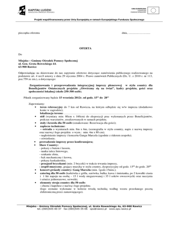 Projekt współfinansowany przez Unię Europejską w ramach Europejskiego Funduszu Społecznego pieczątka oferenta dnia, .............................. OFERTA Do Miejsko – Gminny Ośrodek Pomocy Społecznej ul. Gen. Grota Roweckiego 4A 63-900 Rawicz Odpowiadając na skierowane do nas zapytanie ofertowe dotyczące zamówienia publicznego realizowanego na podstawie art. 4 ust.8 ustawy z dnia 29 stycznia 2004 r. Prawo zamówień Publicznych (Dz. U. z 2010 r. nr 113, poz.759 ze zm.), a dotyczącego: Zorganizowania i przeprowadzenia integracyjnej imprezy plenerowej w stylu country dla Beneficjentów Ostatecznych projektu „Otwórzmy się na świat”, kadry projektu, gości oraz społeczności lokalnej (około 250-300 osób). Piknik zorganizowany będzie 15 września 2012r. od godz. 15ºº do 20ºº Zapewniamy: • teren rekreacyjny do 7 km od Rawicza. na którym odbędzie się w/w impreza (dodatkowo konie w zagrodzie); lokalizacja terenu: …………………………………………………………………………… • stół (wymiary min: 80cm x 160cm) do ekspozycji prac wykonanych przez Beneficjentów, podczas warsztatów, zrealizowanych w ramach projektu; • stoły i krzesła dla 50 osób (oznakowane: Rezerwacja dla gości); • zaplecze techniczne: – estrada o wymiarach min. 8m x 6m, (scenografia w stylu country, napis z nazwą imprezy oraz nazwą i logo projektu o wym.: min: 4m x 80 cm); - nagłośnienie imprezy i koncertu Gangu Marcela (zgodnie z riderem zespołu); - oświetlenie; • prowadzenie imprezy przez konferansjera; • Show Country: - pokazy z batem i lassem, - nauka tańca liniowego, - szukanie złota, - byk mechaniczny i krowa, - pokazy kaskaderskie, - przejazd bryczkami (min. 2 bryczki) w trakcie trwania imprezy, - zespół muzyczny, grający muzykę w stylu country, dyspozycyjny od godz. 15ºº do godz. 20ºº • koncert gwiazdy country: Gang Marcela (min. 1godz.15min.); • catering dla 50 osób (karkówka z grilla, surówka, bułka; kawa i śmietanka, po 2 kawałki ciasta i 1 litr napoju na osobę – 15 l wody niegazowanej i 35 l soków owocowych) oraz naczynia i sztućce jednorazowe, serwetki; • elementy stroju country dla 50 osób: - chusta i kapelusz z nazwą i logo projektu; (logo zostanie wykonane w kolorze trwałą techniką według wzoru przesłanego pocztą elektroniczną przez zamawiającego). Miejsko - Gminny Ośrodek Pomocy Społecznej, ul. Grota Roweckiego 4a, 63-900 Rawicz tel.:(065)545-40-37 fax:(065)545-35-06 [email protected] www.ops.rawicz.pl Projekt współfinansowany przez Unię Europejską w ramach Europejskiego Funduszu Społecznego Akceptujemy dodatkowe warunki współpracy: Forma płatności – przelew po wykonaniu usługi, wystawionej faktury). w terminie do 28 września 2012r. (na podstawie Składamy ofertę następującej treści: Koszt Pikniku Country brutto .................................................... ............................................................ podpis osoby upoważnionej Miejsko - Gminny Ośrodek Pomocy Społecznej, ul. Grota Roweckiego 4a, 63-900 Rawicz tel.:(065)545-40-37 fax:(065)545-35-06 [email protected] www.ops.rawicz.pl