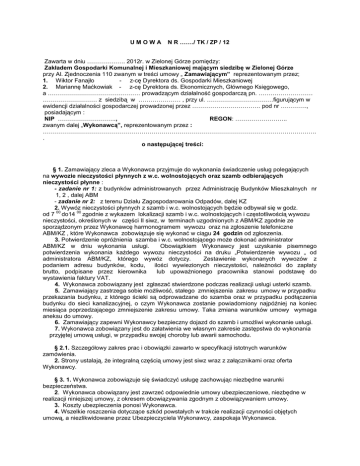 UMOWA N R ……./ TK / ZP / 12 Zawarta w dniu ………………. 2012r. w Zielonej Górze pomiędzy: Zakładem Gospodarki Komunalnej i Mieszkaniowej mającym siedzibę w Zielonej Górze przy Al. Zjednoczenia 110 zwanym w treści umowy „ Zamawiającym” reprezentowanym przez; 1. Wiktor Fanajło - z-cę Dyrektora ds. Gospodarki Mieszkaniowej 2. Mariannę Maćkowiak - z-cę Dyrektora ds. Ekonomicznych, Głównego Księgowego, a ………………………………………. prowadzącym działalność gospodarczą pn. ……………………… ……………………… z siedzibą w ………………… , przy ul. ……………………………figurującym w ewidencji działalności gospodarczej prowadzonej przez ……………………………. pod nr …………., posiadającym : NIP ……………………….., REGON: …………………….. zwanym dalej „Wykonawcą”, reprezentowanym przez : ………………………………………………………………………………………………………………………. . o następującej treści: § 1. Zamawiający zleca a Wykonawca przyjmuje do wykonania świadczenie usług polegających na wywozie nieczystości płynnych z w.c. wolnostojących oraz szamb odbierających nieczystości płynne : - zadanie nr 1: z budynków administrowanych przez Administrację Budynków Mieszkalnych nr 1, 2 , dalej ABM - zadanie nr 2: z terenu Działu Zagospodarowania Odpadów, dalej KZ 2. Wywóz nieczystości płynnych z szamb i w.c. wolnostojących będzie odbywał się w godz. 00 00 od 7 do14 zgodnie z wykazem lokalizacji szamb i w.c. wolnostojących i częstotliwością wywozu nieczystości, określonych w części II siwz, w terminach uzgodnionych z ABM/KZ zgodnie ze sporządzonym przez Wykonawcę harmonogramem wywozu oraz na zgłoszenie telefoniczne ABM/KZ , które Wykonawca zobowiązuje się wykonać w ciągu 24 godzin od zgłoszenia. 3. Potwierdzenie opróżnienia szamba i w.c. wolnostojącego może dokonać administrator ABM/KZ w dniu wykonania usługi. Obowiązkiem Wykonawcy jest uzyskanie pisemnego potwierdzenia wykonania każdego wywozu nieczystości na druku „Potwierdzenie wywozu „ od administratora ABM/KZ, którego wywóz dotyczy. Zestawienie wykonanych wywozów z podaniem adresu budynków, kodu, ilości wywiezionych nieczystości, należności do zapłaty brutto, podpisane przez kierownika lub upoważnionego pracownika stanowi podstawę do wystawienia faktury VAT. 4. Wykonawca zobowiązany jest zgłaszać stwierdzone podczas realizacji usługi usterki szamb. 5. Zamawiający zastrzega sobie możliwość, stałego zmniejszenia zakresu umowy w przypadku przekazania budynku, z którego ścieki są odprowadzane do szamba oraz w przypadku podłączenia budynku do sieci kanalizacyjnej, o czym Wykonawca zostanie powiadomiony najpóźniej na koniec miesiąca poprzedzającego zmniejszenie zakresu umowy. Taka zmiana warunków umowy wymaga aneksu do umowy. 6. Zamawiający zapewni Wykonawcy bezpieczny dojazd do szamb i umożliwi wykonanie usługi. 7. Wykonawca zobowiązany jest do załatwienia we własnym zakresie zastępstwa do wykonania przyjętej umową usługi, w przypadku swojej choroby lub awarii samochodu. § 2.1. Szczegółowy zakres prac i obowiązki zawarto w specyfikacji istotnych warunków zamówienia. 2. Strony ustalają, że integralną częścią umowy jest siwz wraz z załącznikami oraz oferta Wykonawcy. § 3. 1. Wykonawca zobowiązuje się świadczyć usługę zachowując niezbędne warunki bezpieczeństwa. 2. Wykonawca obowiązany jest zawrzeć odpowiednie umowy ubezpieczeniowe, niezbędne w realizacji niniejszej umowy, z okresem obowiązywania zgodnym z obowiązywaniem umowy. 3. Koszty ubezpieczenia ponosi Wykonawca. 4. Wszelkie roszczenia dotyczące szkód powstałych w trakcie realizacji czynności objętych umową, a niezlikwidowane przez Ubezpieczyciela Wykonawcy, zaspokaja Wykonawca. 5. Wykonawca ponosi odpowiedzialność cywilną z tytułu czynu niedozwolonego lub nieumyślnego, skutkującego wyrządzeniem szkody na osobie i mieniu na terenie objętym usługą. § 4. Umowa obowiązuje rok od podpisania umowy. § 5. 1. Strony ustalają że orientacyjne wynagrodzenie ryczałtowo – ilościowe za realizowaną usługę wyniesie do kwoty Zadanie nr 1: …………….. zł brutto, w tym VAT (słownie ………………………………………………………..), zgodnie z przedstawioną ofertą. Zadanie nr 2: …………….. zł brutto, w tym VAT (słownie ………………………………………………………..), zgodnie z przedstawioną ofertą. 2. Ryczałtowe stawki jednostkowe za świadczenie usługi wynoszą: Zadanie nr 1: …………. zł/m3 netto transport i oczyszczanie ścieków gospodarczo bytowych Zadanie nr 2: …………. zł/m3 netto transport i oczyszczanie ścieków gospodarczo bytowych …………. zł/m3 netto transport odcieków pochodzących za składowiska i z kompostowni 3. Ustalone w § 5 ust. 2. stawki nie podlegają przeliczeniom i obejmują wszelkie narzuty i dodatki dla Wykonawcy. § 6.1. Strony ustalają, że płatność za wykonanie robót odbywać się będzie na podstawie faktur częściowych, wystawionych po zakończeniu każdego etapu prac, w terminie 7 dni od daty odbioru usługi, zgodnie z protokołem „Potwierdzenie wywozu”. 2. Do faktury Wykonawca zobowiązany jest dołączyć kosztorys powykonawczy oraz protokół odbioru potwierdzony przez pracownika ABM/KZ. § 7. Faktury będą płatne w terminie 14 dni od daty ich złożenia u Zamawiającego. § 8. 1. Pełnomocnikiem Zamawiającego uprawnionym do nadzoru i podejmowania decyzji w sprawach przedmiotu umowy jest odpowiednio Kierownik ABM 1, ABM 2 lub KZ; 2. Inspektora do nadzoru i kontroli realizacji umowy wyznacza Zamawiający. § 9.1. Strony ustalają, że obowiązującą je formą odszkodowania są kary umowne. 2. Kary umowne mogą być naliczane w przypadkach i wysokościach: 1) 1 % 