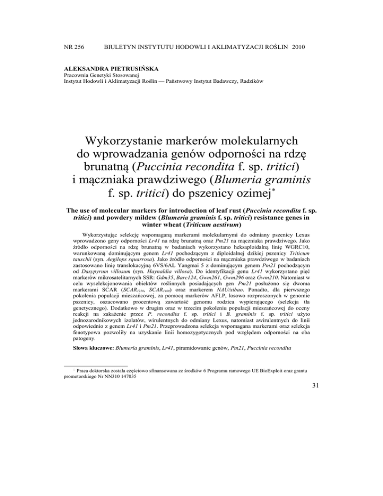 NR 256 BIULETYN INSTYTUTU HODOWLI I AKLIMATYZACJI ROŚLIN 2010 ALEKSANDRA PIETRUSIŃSKA Pracownia Genetyki Stosowanej Instytut Hodowli i Aklimatyzacji Roślin — Państwowy Instytut Badawczy, Radzików Wykorzystanie markerów molekularnych do wprowadzania genów odporności na rdzę brunatną (Puccinia recondita f. sp. tritici) i mączniaka prawdziwego (Blumeria graminis f. sp. tritici) do pszenicy ozimej∗ The use of molecular markers for introduction of leaf rust (Puccinia recondita f. sp. tritici) and powdery mildew (Blumeria graminis f. sp. tritici) resistance genes in winter wheat (Triticum aestivum) Wykorzystując selekcję wspomaganą markerami molekularnymi do odmiany pszenicy Lexus wprowadzono geny odporności Lr41 na rdzę brunatną oraz Pm21 na mączniaka prawdziwego. Jako źródło odporności na rdzę brunatną w badaniach wykorzystano heksaploidalną linię WGRC10, warunkowaną dominującym genem Lr41 pochodzącym z diploidalnej dzikiej pszenicy Triticum tauschii (syn. Aegilops squarrosa). Jako źródło odporności na mączniaka prawdziwego w badaniach zastosowano linię translokacyjną 6VS/6AL Yangmai 5 z dominującym genem Pm21 pochodzącym od Dasypyrum villosum (syn. Haynaldia villosa). Do identyfikacji genu Lr41 wykorzystano pięć markerów mikrosatelitarnych SSR: Gdm35, Barc124, Gwm261, Gwm296 oraz Gwm210. Natomiast w celu wyselekcjonowania obiektów roślinnych posiadających gen Pm21 posłużono się dwoma markerami SCAR (SCAR1250, SCAR1400) oraz markerem NAU/xibao. Ponadto, dla pierwszego pokolenia populacji mieszańcowej, za pomocą markerów AFLP, losowo rozproszonych w genomie pszenicy, oszacowano procentową zawartość genomu rodzica wypierającego (selekcja tła genetycznego). Dodatkowo w drugim oraz w trzecim pokoleniu populacji mieszańcowej do oceny reakcji na zakażenie przez P. recondita f. sp. tritici i B. graminis f. sp. tritici użyto jednozarodnikowych izolatów, wirulentnych do odmiany Lexus, natomiast awirulentnych do linii odpowiednio z genem Lr41 i Pm21. Przeprowadzona selekcja wspomagana markerami oraz selekcja fenotypowa pozwoliły na uzyskanie linii homozygotycznych pod względem odporności na oba patogeny. Słowa kluczowe: Blumeria graminis, Lr41, piramidowanie genów, Pm21, Puccinia recondita Praca doktorska została częściowo sfinansowana ze środków 6 Programu ramowego UE BioExploit oraz grantu promotorskiego Nr NN310 147035 31 Aleksandra Piertusińska The aim of the presented research was to use genetic markers in process of introduction of effective resistance genes to the wheat. A leaf rust resistance gene Lr41 derived from Triticum tauschii (syn. Aegilops squarrosa) and powdery mildew resistance gene Pm21 derived from Dasypyrum villosum (syn. Haynaldia villosa) were introgressed into the best German variety. Line WGRC10 was used as the resistance source of Lr41 for leaf rust, whereas the 6VS/6AL translocation line Yangmai 5 was used as the resistance source of Pm21 for powdery mildew. In foreground selection several molecular markers for Lr41 and Pm21 were applied. For the detection of gene Lr41 in breeding materials with leaf rust resistance five SSR markers: Gdm35, Barc124, Gwm261, Gwm296 and Gwm210 were used. To detect the Pm21 gene three molecular markers: SCAR1250, SCAR1400 and NAU/xibao were development. After the first backcrosses background selection was conducted using the AFLP markers. For the greenhouse screening of the second and the third generations of plants for leaf rust and powdery mildew resistance, plants of selected lines were inoculated at the three-leaf stage with natural pathogen populations of B. graminis and P. recondita. The marker-assisted selection and pathology test allowed to obtain homozygous lines carrying the genes resistance to leaf rust and powdery mildew of winter wheat. Key words: Blumeria graminis, Lr41, Pm21, Puccinia recondita, pyramiding breeding WSTĘP Do jednych z istotniejszych czynników wpływających na wielkość uzyskanego plonu pszenicy należą powszechnie występujące choroby zbóż, z których najważniejsze to: rdza brunatna (Puccinia recondita f. sp. tritici), mączniak prawdziwy traw (Blumeria graminis f. sp. tritici), septorioza (Stagonospora nodorum syn. Septoria nodorum) i fuzarioza (Fusarium spp.). W zależności od warunków pogodowych, choroby te z różnym nasileniem występują zarówno na pszenicy jarej jak i ozimej, we wszystkich rejonach Polski. Odmiany pszenicy ozimej dopuszczone do uprawy w Polsce oraz nowe, będące w badaniach rejestrowych, pod względem odporności na porażenie przez grzyby Blumeria graminis i Puccinia recondita oceniane są jako średnio podatne i podatne w stadium siewek, a w warunkach polowych, w zależności od roku jako mniej lub bardziej wrażliwe. W celu zwiększenia odporności na choroby grzybowe pszenic, hodowla nowych odmian skierowana jest na pozyskiwanie nowych, efektywnych źródeł odporności i wprowadzaniu ich do programów hodowlanych. Najważniejszym i najcenniejszym źródłem genów odporności na rdzę brunatną oraz mączniaka prawdziwego pszenicy są przede wszystkim gatunki dzikie pszenic oraz gatunki im pokrewne, tj.: T. monococcum, T. spelta, T. dicoccum, T. dicoccoides, T. timopheevii, T. durum, T. carthlicum, T. sphaerococcum, T. tauschii (syn. Aegilops squarrosa), Ae. speltoides, Ae. longissima, Ae. ovata, H. villosa (syn. Dasypyrum villosum L. Candargy) oraz żyto (Secale cereale) (McIntosh, 1998; Górny, 2004; Chełkowski i in., 2005 b). W ogólnie przyjętej nomenklaturze wszystkim genom odporności na rdzę brunatną przypisano symbol Lr (ang. Leaf rust – Lr genes). Aktualnie zidentyfikowano około 70 genów warunkujących odporność na populację Puccinia recondita. Natomiast genom odporności na mączniaka prawdziwego pszenicy przyporządkowano symbol Pm (ang. Powdery mildew — Pm genes). Z literaturowych doniesień wynika, że obecnie poznanych jest 57 genów Pm (Xue i in., 2009). Większość z gen
