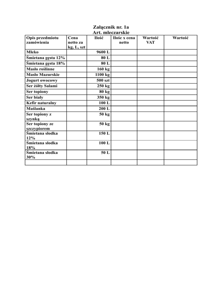 Załącznik nr. 1a Art. mleczarskie Opis przedmiotu zamówienia Mleko Śmietana gęsta 12% Śmietana gęsta 18% Masło roślinne Masło Mazurskie Jogurt owocowy Ser żółty Salami Ser topiony Ser biały Kefir naturalny Maślanka Ser topiony z szynką Ser topiony ze szczypiorem Śmietana słodka 12% Śmietana słodka 18% Śmietana słodka 30% Cena netto za kg, L, szt Ilość 9600 L 80 L 80 L 160 kg 1100 kg 500 szt 250 kg 80 kg 350 kg 100 L 200 L 50 kg 50 kg 150 L 100 L 50 L Ilośc x cena netto Wartość VAT Wartość