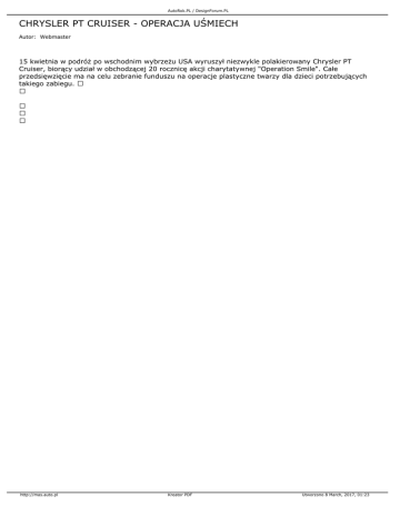 AutoRok.PL / DesignForum.PL CHRYSLER PT CRUISER - OPERACJA UŚMIECH Autor: Webmaster 15 kwietnia w podróż po wschodnim wybrzeżu USA wyruszył niezwykle polakierowany Chrysler PT Cruiser, biorący udział w obchodzącej 20 rocznicę akcji charytatywnej "Operation Smile". Całe przedsięwzięcie ma na celu zebranie funduszu na operacje plastyczne twarzy dla dzieci potrzebujących takiego zabiegu. http://mas.auto.pl Kreator PDF Utworzono 8 March, 2017, 01:23