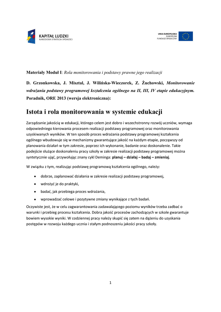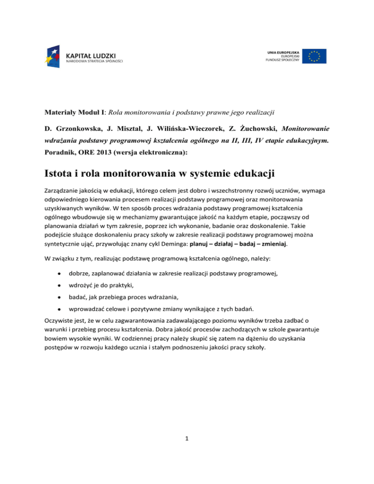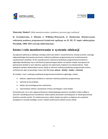 Materiały Moduł I: Rola monitorowania i podstawy prawne jego realizacji D. Grzonkowska, J. Misztal, J. Wilińska-Wieczorek, Z. Żuchowski, Monitorowanie wdrażania podstawy programowej kształcenia ogólnego na II, III, IV etapie edukacyjnym. Poradnik, ORE 2013 (wersja elektroniczna): Istota i rola monitorowania w systemie edukacji Zarządzanie jakością w edukacji, którego celem jest dobro i wszechstronny rozwój uczniów, wymaga odpowiedniego kierowania procesem realizacji podstawy programowej oraz monitorowania uzyskiwanych wyników. W ten sposób proces wdrażania podstawy programowej kształcenia ogólnego wbudowuje się w mechanizmy gwarantujące jakość na każdym etapie, począwszy od planowania działań w tym zakresie, poprzez ich wykonanie, badanie oraz doskonalenie. Takie podejście służące doskonaleniu pracy szkoły w zakresie realizacji podstawy programowej można syntetycznie ująć, przywołując znany cykl Deminga: planuj – działaj – badaj – zmieniaj. W związku z tym, realizując podstawę programową kształcenia ogólnego, należy: dobrze, zaplanować działania w zakresie realizacji podstawy programowej, wdrożyć je do praktyki, badać, jak przebiega proces wdrażania, wprowadzać celowe i pozytywne zmiany wynikające z tych badań. Oczywiste jest, że w celu zagwarantowania zadawalającego poziomu wyników trzeba zadbać o warunki i przebieg procesu kształcenia. Dobra jakość procesów zachodzących w szkole gwarantuje bowiem wysokie wyniki. W codziennej pracy należy skupić się zatem na dążeniu do uzyskania postępów w rozwoju każdego ucznia i stałym podnoszeniu jakości pracy szkoły. 1 Schemat 1. Realizacja podstawy programowej 2.Planowanie kierunkowe dopuszczanie programów do użytku w szkole 1.Planowanie kierunkowe wybór zgodnych z podstawą programów nauczania 7.Badanie efektów kształcenia Realizacja podstawy programowej w szkole 6.Monitorowanie realizacji podstawy programowej 3.Planowanie operacyjne opracowanie nauczycielskich planów edukacyjnych 4.Planowanie metodyczne poszczególnych zajęć edukacyjnych 5.Realizacja zajęć wynikających z ramowych planów nauczania Źródło: opracowanie własne. Z powyższych rozważań wynika, że zapewnienie jakości działań szkoły w zakresie realizacji podstawy programowej wymaga odpowiedniego kierowania procesem pracy w tym zakresie i monitorowania uzyskiwanych wyników. Podstawowymi narzędziami tak pojmowanego zarządzania jakością są plany – konkretne, racjonalne, wykonalne, czytelnie określające wyniki oraz procedury dokonywania bieżących przeglądów i ocen, czyli dotyczące monitorowania. Ważne jest, aby powyższe ustalenia wpisywały się przede wszystkim w praktykę codziennych działań. Dlatego niezbędne jest wdrożenie systemu zawierającego mechanizmy gwarantujące jakość. 2 Monitorowanie-definicje: Monitorowanie – to nieustanne obserwowanie i zbieranie informacji o przebiegu pracy w szkole i uzyskiwanych efektach cząstkowych. Ograniczanie jednakże monitorowania wyłącznie do pozyskiwania i analizowania informacji nie oddaje istoty tego działania, gdyż dobre monitorowanie zakłada również wykorzystanie zgromadzonych informacji w celu bieżącej modyfikacji obserwowanych procesów poprzez usuwanie niepożądanych zjawisk natychmiast po ich stwierdzeniu. Tak więc monitorowanie zawiadamia o grożącym niebezpieczeństwie, jednocześnie wymaga natychmiastowego podjęcia działań naprawczych i doskonalących. Przypomina zatem sztycę wbitą w dno rzeki z zaznaczonym czerwoną kreską poziomem alarmowego stanu wody w rzece. Kiedy poziom wody przekracza czerwoną linię alarmową, natychmiast ewakuuje się ludzi z terenów zagrożonych zalaniem. Monitorowanie jest regularną obserwacją lub pomiarem określonego zjawiska poprzez określony czas. To systematyczne pozyskiwanie informacji w celu zarządzania i podejmowania decyzji. Dostarcza informacji, na podstawie których zarządzający mogą identyfikować i rozwiązywać problemy związane z realizacją codziennych działań, a także ocenić postęp w realizacji planów i założeń. Pozwala zatem zmierzyć się z problemami, które pojawiają się z trakcie realizacji działań, zdiagnozować ich przyczyny oraz określić sposoby ich rozwiązywania i przeciwdziałania im. W trakcie monitoringu bada się i analizuje przebieg działań pod względem ich zgodności z wcześniej ustalonymi planami. Istotą tej czynności jest fakt, że prowadzona jest ona w sposób ciągły w celu zidentyfikowania zagrożeń, które mogą zakłócić realizację działań. W związku z tym dane zgromadzone w wyniku monitorowania winny zostać opracowane w określonej formie i upowszechnione wśród zainteresowanych. Proces monitorowania wymaga więc również ustalenia mechanizmów i sposobów komunikacji gwarantujących powstanie precyzyjnych informacji, które zostaną wykorzystane w sposób terminowy i skuteczny. Jako proces systematycznego zbierania, opracowania i upowszechniania informacji opisuje postęp w realizacji działań i ma na celu zapewnienie zgodności wykonywania działań, projektu, programu, podstawy programowej z wcześniejszymi założeniami i planami. Zatem dyrektor monitorujący dyżury nauczycieli podczas przerw nie tylko sprawdza, czy wszyscy są na wyznaczonych miejscach i efektywnie pełnią swoją funkcję, ale w przypadku nieobecności nauczyciela dyżurującego ustala jej przyczynę oraz niezwłocznie podejmuje działania mające na celu zapewnienie opieki uczniom. Monitorowanie z punktu widzenia dyrektora dostarcza zatem szkole wielu informacji niezbędnych do organizowania zachodzących procesów. Stanowi zawsze ukierunkowaną obserwację przebiegu procesów edukacyjnych i jest wykorzystywane w sytuacjach wymagających natychmiastowego podejmowania decyzji. Z kolei nauczyciel monitorujący osiągnięcia edukacyjne swoich uczniów, gdy zauważa, że jeden z nich osiąga wyniki poniżej swoic