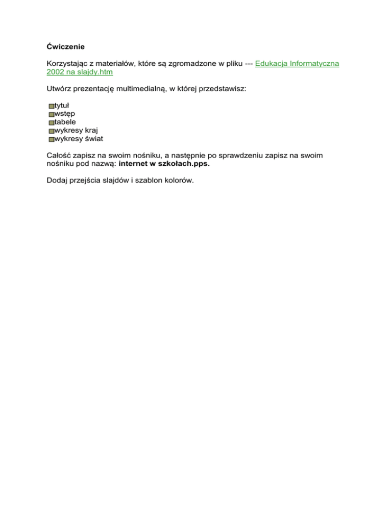 Ćwiczenie Korzystając z materiałów, które są zgromadzone w pliku --- Edukacja Informatyczna 2002 na slajdy.htm Utwórz prezentację multimedialną, w której przedstawisz: tytuł wstęp tabele wykresy kraj wykresy świat Całość zapisz na swoim nośniku, a następnie po sprawdzeniu zapisz na swoim nośniku pod nazwą: internet w szkołach.pps. Dodaj przejścia slajdów i szablon kolorów.