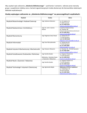 Aby uzyskać wpis zaliczenia „Szkolenia bibliotecznego” – pod koniec I semestru zebrane przez starostę grupy i uzupełnione indeksy wraz z kartami egzaminacyjnymi trzeba dostarczyć do kierowników właściwych bibliotek wydziałowych. Osoby wpisujące zaliczenie ze „Szkolenia bibliotecznego” na poszczególnych wydziałach: Wydział Osoba Wydział Biotechnologii i Hodowli Zwierząt mgr Julianna Kiziewicz Wydział Budownictwa i Architektury mgr inż. arch. Joanna Rudna Adres ul. dr Judyma 12 71-466 Szczecin tel. 91 449 6116 [email protected] Czytelnia Budownictwa Al. Piastów 48 Budynek Jednostek Międzywydziałowych Wydział Ekonomiczny mgr Dagmara Sztul-Smyk Wydział Informatyki mgr Ewa Wyrzykowska Wydział Inżynierii Mechanicznej i Mechatroniki mgr Grażyna Wojsznis Wydział Kształtowania Środowiska i Rolnictwa mgr Kamila Gudan Biblioteka Wydziału Nauk o Żywności i Rybactwa Wydział Nauk o Żywności i Rybactwa Wydział Technologii i Inżynierii Chemicznej mgr Kamila Gudan mgr Agnieszka Bajda tel. 91 449 4513 [email protected] ul. Żołnierska 47 71-210 Szczecin tel. 91 449 6120 [email protected] ul. Żołnierska 49 71-210 Szczecin tel. 91 449 5605 [email protected] al. Piastów 19, 70-310 Szczecin tel. 91 449 4297 [email protected] ul. Papieża Pawła VI 3 71-374 Szczecin tel. 91 449 6119 [email protected] ul. Papieża Pawła VI 3 71-374 Szczecin tel. 91 449 6119 [email protected] Biblioteka WTiICh, Czytelnia I ul. Pułaskiego 10 70-322 Szczecin tel. 91 449 4533 [email protected]