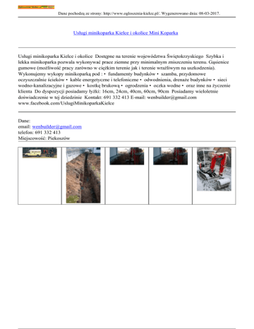 Dane pochodzą ze strony: http://www.ogloszenia-kielce.pl/. Wygenerowano dnia: 08-03-2017. Usługi minikoparka Kielce i okolice Mini Koparka Usługi minikoparka Kielce i okolice Dostępne na terenie województwa Świętokrzyskiego Szybka i lekka minikoparka pozwala wykonywać prace ziemne przy minimalnym zniszczeniu terenu. Gąsienice gumowe (możliwość pracy zarówno w ciężkim terenie jak i terenie wrażliwym na uszkodzenia). Wykonujemy wykopy minikoparką pod : • fundamenty budynków • szamba, przydomowe oczyszczalnie ścieków • kable energetyczne i telefoniczne • odwodnienia, drenaże budynków • sieci wodno-kanalizacyjne i gazowe • kostkę brukową • ogrodzenia • oczka wodne • oraz inne na życzenie klienta Do dyspozycji posiadamy łyżki: 16cm, 24cm, 40cm, 60cm, 90cm Posiadamy wieloletnie doświadczenie w tej dziedzinie Kontakt: 691 332 413 E-mail: [email protected] www.facebook.com/UslugiMinikoparkaKielce Dane: email: [email protected] telefon: 691 332 413 Miejscowość: Piekoszów