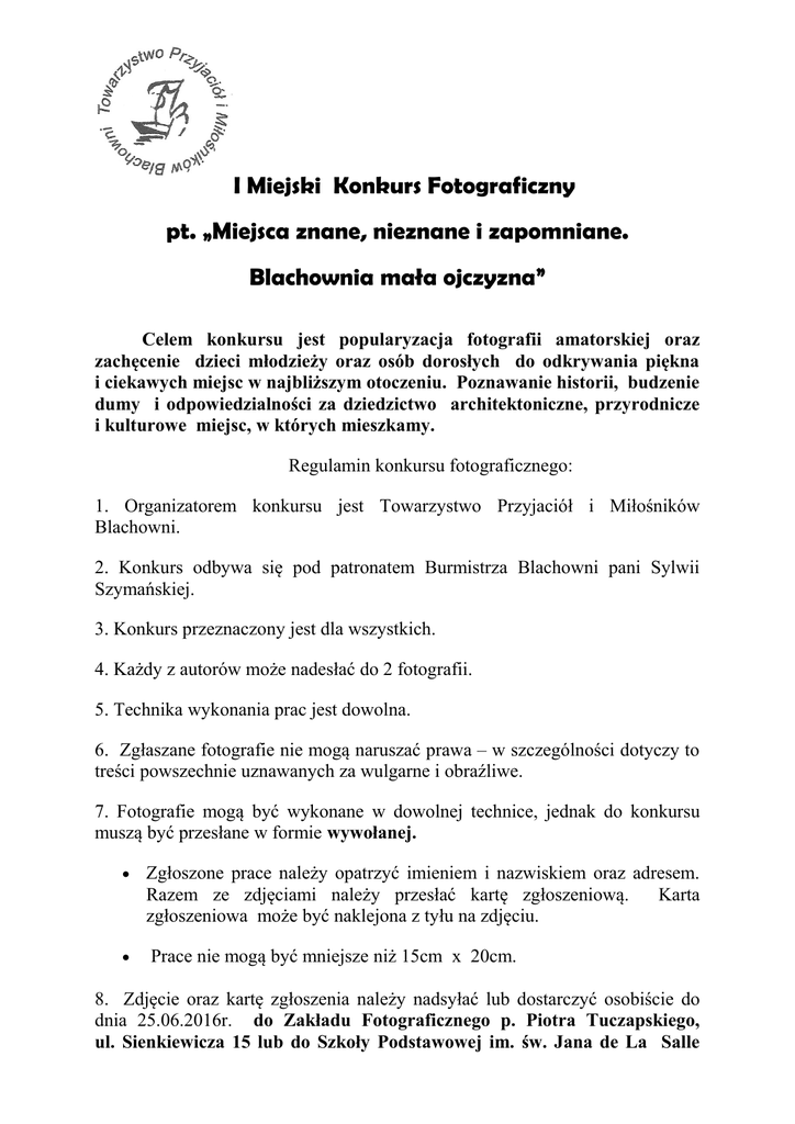 I Miejski Konkurs Fotograficzny pt. „Miejsca znane, nieznane i zapomniane. Blachownia mała ojczyzna” Celem konkursu jest popularyzacja fotografii amatorskiej oraz zachęcenie dzieci młodzieży oraz osób dorosłych do odkrywania piękna i ciekawych miejsc w najbliższym otoczeniu. Poznawanie historii, budzenie dumy i odpowiedzialności za dziedzictwo architektoniczne, przyrodnicze i kulturowe miejsc, w których mieszkamy. Regulamin konkursu fotograficznego: 1. Organizatorem konkursu jest Towarzystwo Przyjaciół i Miłośników Blachowni. 2. Konkurs odbywa się pod patronatem Burmistrza Blachowni pani Sylwii Szymańskiej. 3. Konkurs przeznaczony jest dla wszystkich. 4. Każdy z autorów może nadesłać do 2 fotografii. 5. Technika wykonania prac jest dowolna. 6. Zgłaszane fotografie nie mogą naruszać prawa – w szczególności dotyczy to treści powszechnie uznawanych za wulgarne i obraźliwe. 7. Fotografie mogą być wykonane w dowolnej technice, jednak do konkursu muszą być przesłane w formie wywołanej. Zgłoszone prace należy opatrzyć imieniem i nazwiskiem oraz adresem. Razem ze zdjęciami należy przesłać kartę zgłoszeniową. Karta zgłoszeniowa może być naklejona z tyłu na zdjęciu. Prace nie mogą być mniejsze niż 15cm x 20cm. 8. Zdjęcie oraz kartę zgłoszenia należy nadsyłać lub dostarczyć osobiście do dnia 25.06.2016r. do Zakładu Fotograficznego p. Piotra Tuczapskiego, ul. Sienkiewicza 15 lub do Szkoły Podstawowej im. św. Jana de La Salle w Częstochowie, ul . Pułaskiego 71, 42-200 Blachownia z dopiskiem „Blachownia - konkurs fotograficzny”. 9. Prace fotograficzne niespełniające warunków Regulaminu, a także nadesłane po terminie nie będą brały udziału w Konkursie (nie będą rozpatrywane). 10. Uczestnik konkursu poprzez wysłanie formularza zgłoszeniowego oświadcza, iż a) przysługują mu wyłączne i nieograniczone prawa autorskie do nadesłanych fotografii oraz, że uczestnik przyjmuje na siebie odpowiedzialność wobec Organizatora za wady prawne zgłoszonych fotografii, a w szczególności za to, że osoby trzecie nie będą kierować przeciwko Organizatorowi roszczeń związanych z naruszeniem ich praw autorskich; b) wszystkie osoby widniejące na fotografiach wyrażają zgodę na ich publiczne udostępnienie c) wyraża zgodę na przetwarzanie przez Organizatora danych osobowych uczestnika wyłącznie na potrzeby Konkursu; 11. Do dnia 17 lipca 2016r. Jury, złożone z przedstawicieli organizatora, dokona oceny prac i przyznania nagród. Jury wyłoni zwycięzców w każdej kategorii (I kategoria – szkoła podstawowa, II kategoria – gimnazjum, III kategoria szkoły ponadgimnazjalne i osoby dorosłe), którzy zostaną nagrodzeni oraz przyzna wyróżnienia. O terminie rozstrzygnięcia konkursu i wręczania nagród uczestnicy konkursu zostaną powiadomieni korespondencyjnie. 12. Osoby nagrodzone zostaną powiadomione przez organizatorów konkursu. 13. Wszystkie prace zostaną zaprezentowane na wystawie pokonkursowej, która odbędzie się w Blachowni. 14. Uczestnicy wyrażają zgodę na wystawienie ich prac, a osoby nagrodzone na prezentacje zdjęć na stronie internetowej miasta Blachownia. 15. Wszyscy uczestnicy zostaną powiadomieni o wystawie pokonkursowej i zaproszeni na uroczyste ogłoszenie wyników. Karta zgłoszeniowa do Konkursu Fotograficznego „Miejsca znane, nieznane i zapomniane. Blachownia mała ojczyzna” . Imię i nazwisko uczestnika ………………………………………………………………. Wiek uczestnika …………………………………….......................................... Adres zamieszkania ……………………………………………………….............. nr telefonu uczestnika …………..…………………………………………………… adres e-mail ………………………………………………………………… tytuł fotografii nr 1 …………………………………………………………………. tytuł fotografii nr 2 …………………………………………………………………. Oświadczam o zapoznaniu się z regulaminem Konkursu Fotograficznego: „Miejsca znane, nieznane i zapomniane. Blachownia mała ojczyzna” ………………………………………… data i podpis uczestnika konkursu. Zgoda uczestnika konkursu lub jego rodzica/prawnego opiekuna na przetwarzanie danych osobowych dziecka (osoby niepełnoletniej) przez organizatorów Konkursu Wyrażam zgodę na przetwarzanie moich danych osobowych i wizerunku lub mojego syna/córki ……………………………………………………………………………………………… ( imię i nazwisko syna/córki) przez Towarzystwo Przyjaciół i Miłośników Blachowni, w celu zrealizowania I Miejskiego Konkursu Fotograficznego „Blachownia mała ojczyzna. Miejsca znane nieznane zapomniane, ” zgodnie z ustawą z dnia 29 sierpnia 1997 r. o ochronie danych osobowych (tj. Dz. U. z 2002 r., Nr 101, poz. 926 ze zm.). ………………………………………………………………………………………………….. data, czytelny podpis uczestnika konkursu/rodzica/prawnego opiekuna Wyrażam zgodę na publikację zdjęć mojej pracy w wydawnictwie pokonkursowym oraz wykorzystanie ich w celu upowszechnienia rezultatów konkursu oraz popularyzacji jego idei. ………………………………………………………………………………………………….. data, czytelny podpis uczestnika konkursu/rodzica/prawnego opiekuna