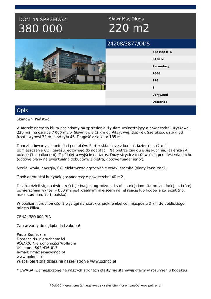 DOM na SPRZEDAŻ 380 000 Sławniów, Długa 220 m2 24208/3877/ODS 380 000 PLN 54 PLN Secondary 7000 220 5 VeryGood Detached Opis Szanowni Państwo, w ofercie naszego biura posiadamy na sprzedaż duży dom wolnostojący o powierzchni użytkowej 220 m2, na działce 7 000 m2 w Sławniowie (3 km od Pilicy, woj. śląskie). Szerokość działki od frontu wynosi 32 m, a od tyłu 45. Długość działki to 185 m. Dom zbudowany z kamienia i pustaków. Parter składa się z kuchni, łazienki, spiżarni, pomieszczenia CO i garażu, gotowego do adaptacji. Na piętrze znajduje się kuchnia, łazienka i 4 pokoje (1 z balkonem). Z półpiętra wyjście na taras. Duży strych z możliwością podniesienia dachu (gotowe plany na ewentualną dobudowę 2 piętra, gotowe fundamenty). Media: woda, energia, CO, elektryczne ogrzewanie wody, szambo (plany kanalizacji). Obok domu stoi budynek gospodarczy o powierzchni 40 m2. Działka dzieli się na dwie części. Jedna jest ogrodzona i stoi na niej dom. Natomiast kolejna, której powierzchnia wynosi 4 800 m2 jest idealnym miejscem na rekreację lub hodowlę zwierząt (np. mała stadnina, kort, boisko). W pobliżu nieruchomości 2 wyciągi narciarskie, piękne okolice i niespełna 3 km do pobliskiego miasta Pilica. CENA: 380 000 PLN Zapraszamy do oglądania i zakupu! Paula Konieczna Doradca ds. nieruchomości PÓŁNOC Nieruchomości Wolbrom tel. kom.: 502-416-017 e-mail: [email protected] www.polnoc.pl Więcej ofert znajdziesz na naszej stronie www.polnoc.pl * UWAGA! Zamieszczone na naszych stronach oferty nie stanowią oferty w rozumieniu Kodeksu PÓŁNOC Nieruchomości - ogólnopolska sieć biur nieruchomości www.polnoc.pl Cywilnego, a dane w nich zawarte mają jedynie charakter informacyjny. Klaudia Sikorska-Maciąg tel. 516-025-585 email: [email protected] PÓŁNOC Nieruchomości - ogólnopolska sieć biur nieruchomości www.polnoc.pl Powered by TCPDF (www.tcpdf.org)