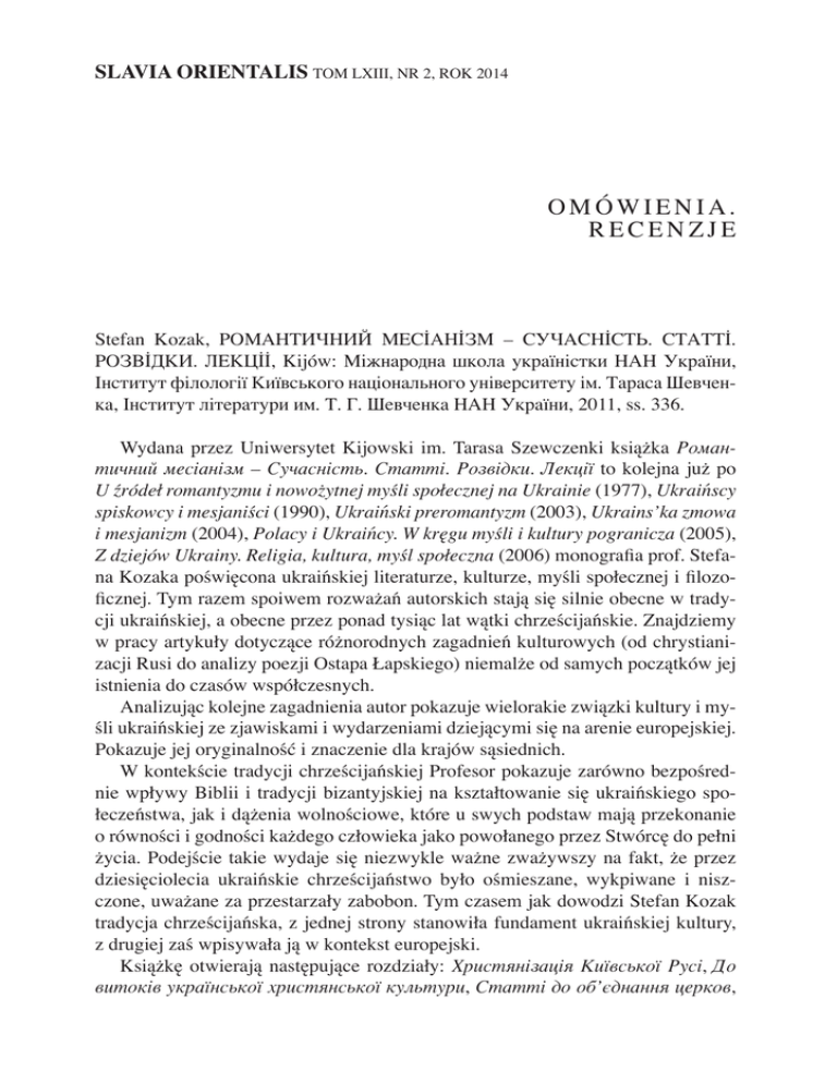 SLAVIA ORIENTALIS tom lxIII, nr 2, rok 2014 omówienia. recenzje Stefan Kozak, РОМАНТИЧНИЙ МЕСİАНİЗМ – СУЧАСНİСТЬ. СТАТТİ. РОЗВİДКИ. ЛЕКЦİİ, Kijów: Мiжнародна школа украïнiстки НАН Украïни, Iнститут фiлологiï Киïвського нацiонального унiверситету iм. Тараса Шевченка, Iнститут лiтератури им. Т. Г. Шевченка НАН Украïни, 2011, ss. 336. Wydana przez Uniwersytet Kijowski im. Tarasa Szewczenki książka Романтичний месіанізм – Сучасність. Статті. Розвідки. Лекції to kolejna już po U źródeł romantyzmu i nowożytnej myśli społecznej na Ukrainie (1977), Ukraińscy spiskowcy i mesjaniści (1990), Ukraiński preromantyzm (2003), Ukrains’ka zmowa i mesjanizm (2004), Polacy i Ukraińcy. W kręgu myśli i kultury pogranicza (2005), Z dziejów Ukrainy. Religia, kultura, myśl społeczna (2006) monografia prof. Stefana Kozaka poświęcona ukraińskiej literaturze, kulturze, myśli społecznej i filozoficznej. Tym razem spoiwem rozważań autorskich stają się silnie obecne w tradycji ukraińskiej, a obecne przez ponad tysiąc lat wątki chrześcijańskie. Znajdziemy w pracy artykuły dotyczące różnorodnych zagadnień kulturowych (od chrystianizacji Rusi do analizy poezji Ostapa Łapskiego) niemalże od samych początków jej istnienia do czasów współczesnych. Analizując kolejne zagadnienia autor pokazuje wielorakie związki kultury i myśli ukraińskiej ze zjawiskami i wydarzeniami dziejącymi się na arenie europejskiej. Pokazuje jej oryginalność i znaczenie dla krajów sąsiednich. W kontekście tradycji chrześcijańskiej Profesor pokazuje zarówno bezpośrednie wpływy Biblii i tradycji bizantyjskiej na kształtowanie się ukraińskiego społeczeństwa, jak i dążenia wolnościowe, które u swych podstaw mają przekonanie o równości i godności każdego człowieka jako powołanego przez Stwórcę do pełni życia. Podejście takie wydaje się niezwykle ważne zważywszy na fakt, że przez dziesięciolecia ukraińskie chrześcijaństwo było ośmieszane, wykpiwane i niszczone, uważane za przestarzały zabobon. Tym czasem jak dowodzi Stefan Kozak tradycja chrześcijańska, z jednej strony stanowiła fundament ukraińskiej kultury, z drugiej zaś wpisywała ją w kontekst europejski. Książkę otwierają następujące rozdziały: Христянізація Київської Русі, До витоків української христянської культури, Статті до об’єднання церков, 318 omówienia. recenzje Берестейська унія з погляду переспективи, w których autor pokazuje znaczenie i konsekwencje przyjęcia chrztu przez Włodzimierza Wielkiego nie tylko dla Ukrainy, ale i tej części Europy. Wydarzenie to wpłynęło na wieloletni proces integracji Słowian wschodnich, łącząc ich na stulecia ze spuścizną kultury bizantyjskiej, pozostawiając jednak szeroką odrębność m.in poprzez obecność w liturgii języka słowiańskiego i tym samym nadanie mu statusu zarezerwowanego do tej pory dla łaciny, greki i hebrajskiego. Stworzyło to nowe możliwości dla rozwoju kultur terenów wschodniej Słowiańszczyzny. Jak pisze autor trudno przecenić rolę, jaką odegrało ono dla tych obszarów в суспільній, політичній і культурно-історичній дійсності середньовіччя христянство становило чинник, організуючий діяльність окремих людей і цілих сиспільно-етнічних груп в усіх площинах і аспектах їхньої активності. Воно було також мірилом і виразом культурної тотожності тодішніх суспільностей, найвагомішим елементом, що мав вирішальний вплив на самосвідомість середньовічної Європи1. Kolejnym ważnym momentem pokazującym rozwój chrześcijaństwa na Ukrainie, jego tożsamość i tradycję, nad którym Stefan Kozak pochyla się w swojej monografii jest rok 1595. Autor bada nie tylko przyczyny Unii Brzeskiej, ale i jej wpływ, sięgający czasów współczesnych, na szeroko pojętą kulturę, a więc nie tylko życie duchowe, cerkiewne ale również społeczne, polityczne. Unię brzeską autor porównuje do zaślubin świata łacińsko-katolickiego z grecko-bizantyjskim. Kolejny ważny blok tematyczny to teksty poświęcone kształtowaniu się i rozwojowi ukraińskiej tożsamości narodowej (Нарoдотворчий аспект козацького eposu oraz Від гердеризму до сучасної національної свідомості). Nie mogło więc zabraknąć badań poświęconych Historii Rusów, a także folklorowi i latopisom kozackim, które stoją u jej źródeł. Autor pokazuje jak mity i legendy historyczne budowały jedność, a w konsekwencji pomagały tworzyć wspólnotę narodową. Badacz podkreśla kluczową rolę jaką w tych procesach odgrywał mit Kozaczyzny z jej umiłowaniem wolności, patriotyzmem, bezkompromisowością, podporządkowaniem uznanym normom oraz obroną wiary chrześcijańskiej. Autor pisze: Ця свідомість спільної віри та історичної долі народу є провідним мотивом українського героїчного епосу. Не сумніваємось, що ці прояви релігійної та історичної свідомості виконували велику інтеграційну функцію: будили почуття солідарнсті, мобілізували громадську енергію, пі