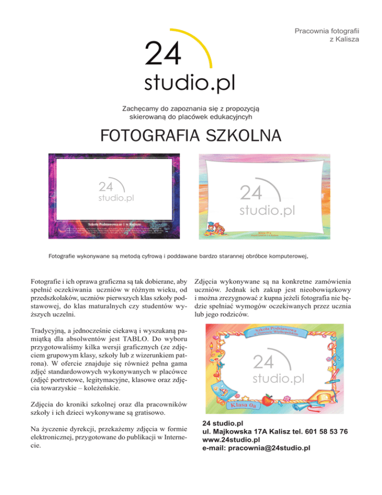 Pracownia fotografii z Kalisza Zachęcamy do zapoznania się z propozycją skierowaną do placówek edukacyjncyh FOTOGRAFIA SZKOLNA Fotografie wykonywane są metodą cyfrową i poddawane bardzo starannej obróbce komputerowej, Fotografie i ich oprawa graficzna są tak dobierane, aby spełnić oczekiwania uczniów w różnym wieku, od przedszkolaków, uczniów pierwszych klas szkoły podstawowej, do klas maturalnych czy studentów wyższych uczelni. Tradycyjną, a jednocześnie ciekawą i wyszukaną pamiątką dla absolwentów jest TABLO. Do wyboru przygotowaliśmy kilka wersji graficznych (ze zdjęciem grupowym klasy, szkoły lub z wizerunkiem patrona). W ofercie znajduje się również pełna gama zdjęć standardowowych wykonywanych w placówce (zdjęć portretowe, legitymacyjne, klasowe oraz zdjęcia towarzyskie – koleżeńskie. Zdjęcia do kroniki szkolnej oraz dla pracowników szkoły i ich dzieci wykonywane są gratisowo. Na życzenie dyrekcji, przekażemy zdjęcia w formie elektronicznej, przygotowane do publikacji w Internecie. Zdjęcia wykonywane są na konkretne zamówienia uczniów. Jednak ich zakup jest nieobowiązkowy i można zrezygnować z kupna jeżeli fotografia nie będzie spełniać wymogów oczekiwanych przez ucznia lub jego rodziców. 24 studio.pl ul. Majkowska 17A Kalisz tel. 601 58 53 76 www.24studio.pl e-mail: [email protected] Oferta FOTOGRAFIA GRUPOWA format 15x21 cm, w ozdobnej szacie graficznej, ramka, motywy graficzne etc. (gratis pamiątkowa odbitka dla wychowawcy) TABLO JEDNOKARTKOWE format 20x30 cm. format 15x21 cm. FOTOGRAFIA PORTRETOWA: format 15x21 cm, w ozdobnej szacie graficznej, ramka, motywy graficzne etc. TABLO WIELKOFORMATOWE: Wydruk z plotera z motywem graficznym, nazwiskami uczniów, napisem tytułowym. Papier plakatowy matowy -100x61 cm Papier foto perła - 100x61 cm FOTOGRAFIA LEGITYMACYJNA: 6/8 zdjęć (3,5x4,5cm - legitymacyjne/dowodowe) Fotoobraz na płótnie canvas: 20x30 cm 30x40cm 50x40 cm 50x70 cm Zapraszamy do sklepu online w którym zamówisz duże powiększenia zdjęć oraz fotobrazy na płótnie. www.24studio.pl