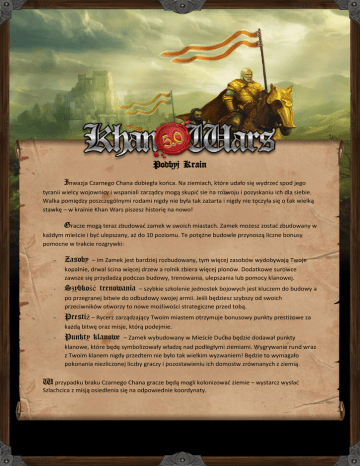 Podbój Krain Inwazja Czarnego Chana dobiegła końca. Na ziemiach, które udało się wydrzeć spod jego tyranii wielcy wojownicy i wspaniali zarządcy mogą skupić sie na rozwoju i pozyskaniu ich dla siebie. Walka pomiędzy poszczególnymi rodami nigdy nie była tak zażarta i nigdy nie toczyła się o tak wielką stawkę – w krainie Khan Wars piszesz historię na nowo! Gracze mogą teraz zbudować zamek w swoich miastach. Zamek możesz zostać zbudowany w każdym mieście i być ulepszany, aż do 10 poziomu. Te potężne budowle przynoszą liczne bonusy pomocne w trakcie rozgrywki: - Zasoby – im Zamek jest bardziej rozbudowany, tym więcej zasobów wydobywają Twoje kopalnie, drwal ścina więcej drzew a rolnik zbiera więcej plonów. Dodatkowe surowce zawsze się przydadzą podczas budowy, trenowania, ulepszania lub pomocy klanowej. - Szybkość trenowania – szybkie szkolenie jednostek bojowych jest kluczem do budowy a po przegranej bitwie do odbudowy swojej armii. Jeśli będziesz szybszy od swoich przeciwników otworzy to nowe możliwości strategiczne przed tobą. - Prestiż – Rycerz zarządzający Twoim miastem otrzymuje bonusowy punkty prestiżowe za każdą bitwę oraz misje, którą podejmie. - Punkty klanowe – Zamek wybudowany w Mieście Ducha będzie dodawał punkty klanowe, które będę symbolizowały władzę nad podległymi ziemiami. Wygrywanie rund wraz z Twoim klanem nigdy przedtem nie było tak wielkim wyzwaniem! Będzie to wymagało pokonania niezliczonej liczby graczy i pozostawieniu ich domostw zrównanych z ziemią. W przypadku braku Czarnego Chana gracze będą mogli kolonizować ziemie – wystarcz wysłać Szlachcica z misją osiedlenia się na odpowiednie koordynaty.