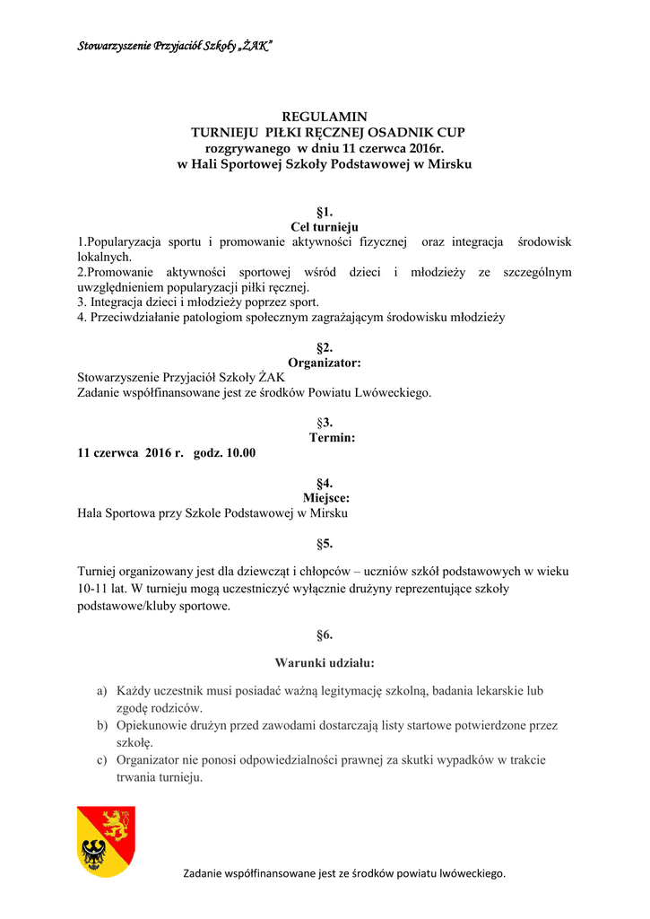 Stowarzyszenie Przyjaciół Szkoły „ŻAK” REGULAMIN TURNIEJU PIŁKI RĘCZNEJ OSADNIK CUP rozgrywanego w dniu 11 czerwca 2016r. w Hali Sportowej Szkoły Podstawowej w Mirsku §1. Cel turnieju 1.Popularyzacja sportu i promowanie aktywności fizycznej oraz integracja środowisk lokalnych. 2.Promowanie aktywności sportowej wśród dzieci i młodzieży ze szczególnym uwzględnieniem popularyzacji piłki ręcznej. 3. Integracja dzieci i młodzieży poprzez sport. 4. Przeciwdziałanie patologiom społecznym zagrażającym środowisku młodzieży §2. Organizator: Stowarzyszenie Przyjaciół Szkoły ŻAK Zadanie współfinansowane jest ze środków Powiatu Lwóweckiego. §3. Termin: 11 czerwca 2016 r. godz. 10.00 §4. Miejsce: Hala Sportowa przy Szkole Podstawowej w Mirsku §5. Turniej organizowany jest dla dziewcząt i chłopców – uczniów szkół podstawowych w wieku 10-11 lat. W turnieju mogą uczestniczyć wyłącznie drużyny reprezentujące szkoły podstawowe/kluby sportowe. §6. Warunki udziału: a) Każdy uczestnik musi posiadać ważną legitymację szkolną, badania lekarskie lub zgodę rodziców. b) Opiekunowie drużyn przed zawodami dostarczają listy startowe potwierdzone przez szkołę. c) Organizator nie ponosi odpowiedzialności prawnej za skutki wypadków w trakcie trwania turnieju. Zadanie współfinansowane jest ze środków powiatu lwóweckiego. Stowarzyszenie Przyjaciół Szkoły „ŻAK” d) Organizator nie zapewnia uczestnikom ubezpieczenia od następstw nieszczęśliwych wypadków. e) Organizator nie pokrywa zwrotu kosztów podróży. f) Drużynę stanowią uczniowie jednej szkoły/klubu. Zespół liczy 14 zawodników. g) Zgłoszenie drużyny do rozgrywek jest jednoznaczne z przyjęciem zasad i reguł zawartych w Regulaminie Hali Sportowej. h) Zgłoszenia do turnieju należy dokonać na Formularzu zgłoszeniowym do dnia 20.05.2016r. na adres: [email protected] . i) O zakwalifikowaniu się do turnieju decyduje pierwszeństwo zgłoszeń. j) Każda drużyna musi mieć jednego Opiekuna, który odpowiada za zawodników podczas całego turnieju. a) b) c) d) §7. Przeprowadzenie rozgrywek Turniej będzie rozegrany systemem „każdy z każdym” lub systemem pucharowym w zależności od ilości drużyn. Organizator zastrzega sobie prawo zmiany systemu rozgrywek oraz czasu trwania meczów w trakcie turnieju. Dopuszczalna jest gra tylko w miękkim obuwiu (trampki, adidasy, halówki). Nie można grać w obuwiu o czarnej podeszwie zostawiającej ślady na powierzchni hali sportowej. W czasie trwania zawodów prawo do zwracanie się do sędziego ma tylko i wyłącznie kapitan drużyny. §8. Zasady gry a) Zawody rozgrywane będą zgodnie z przepisami i wytycznymi ZPRP dla kategorii junior młodszy. b) Czas trwania gry 2X10 min, 5 min przerwy (czas gry może ulec zmianie w zależności od tego ile drużyn zgłosi się do turnieju) c) Każdej drużynie przysługuje 5 minutowa rozgrzewka przed każdym spotkaniem. d) Wprowadza się zakaz dokonywania zmian zawodników w okresie gdy zespół przeciwnika jest w posiadaniu piłki. Zadanie współfinansowane jest ze środków powiatu lwóweckiego. Stowarzyszenie Przyjaciół Szkoły „ŻAK” §9. Punktacja i system rozgrywek a) Zwycięstwo 2 pkt b) Remis 1 pkt c) Porażka 0 pkt W przypadku równej liczby dużych punktów o wyższym miejscu w tabeli decyduje: - większa liczba zdobytych punktów pomiędzy zainteresowanymi -lepsza różnica bramek pomiędzy zainteresowanymi - lepsza różnica bramek w rozgrywkach -większa liczba zdobytych bramek §10 Ubezpieczenie i bezpieczeństwo. a) Do zawodów mogą przystąpić tylko zawodnicy, których stan zdrowia pozwala na udział w zawodach. b) Organizator nie ponosi odpowiedzialności materialnej za rzeczy zawodników zaginione w trakcie trwania zawodów. c) Nieznajomość niniejszego regulaminu nie będzie uznawana przez Organizatora za argument w ewentualnych kwestiach spornych. d) Organizator nie ponosi odpowiedzialności prawnej za skutki wypadków w trakcie trwania turnieju. e)Organizator nie zapewnia uczestnikom ubezpieczenia od następstw nieszczęśliwych wypadków §11. Uwagi końcowe a) W trakcie trwania rozgrywek obowiązuje zasada „fair- play” b) Sędziów powołuje Organizator. c) W przypadku nie przestrzegania regulaminu i przepisów gry oraz niesportowego zachowania Organizator zawodów w porozumieniu z Sędzią ma prawo do weryfikacji wyniku meczu bądź dyskwalifikacji zawodnika/ drużyny z zawodów. d) Udział w zawodach jest równoznaczny z akceptacją regulaminu oraz wyrażeniem zgody na przetwarzanie swoich danych osobowych (ustawa z 29.08.1997r. o ochronie danych osobowych Dz.. U. Nr 133 z 1997) przez organizatora w celach związanych z zawodami. e)W trakcie zawodów będą wykonywane zdjęcia uczestnikom zawodów, które będą publikowane na stronie internetowej Szkoły Podstawowej w Mirsku , Powiatu Lwóweckiego. Zadanie współfinansowane jest ze środków powiatu lwóweckiego.