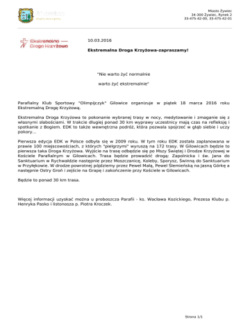 Miasto Żywiec 34-300 Żywiec, Rynek 2 33-475-42-00, 33-475-42-01 10.03.2016 Ekstremalna Droga Krzyżowa-zapraszamy! "Nie warto żyć normalnie warto żyć ekstremalnie" Parafialny Klub Sportowy "Olimpijczyk" Gilowice organizuje w piątek 18 marca 2016 roku Ekstremalną Drogę Krzyżową. Ekstremalna Droga Krzyżowa to pokonanie wybranej trasy w nocy, medytowanie i zmaganie się z własnymi słabościami. W trakcie długiej ponad 30 km wyprawy uczestnicy mają czas na refleksję i spotkanie z Bogiem. EDK to także wewnętrzna podróż, która pozwala spojrzeć w głąb siebie i uczy pokory... Pierwsza edycja EDK w Polsce odbyła się w 2009 roku. W tym roku EDK została zaplanowana w prawie 100 miejscowościach, z których "pielgrzymi" wyruszą na 172 trasy. W Gilowicach będzie to pierwsza taka Droga Krzyżowa. Wyjście na trasę odbędzie się po Mszy Świętej i Drodze Krzyżowej w Kościele Parafialnym w Gilowicach. Trasa będzie prowadzić drogą: Zapolnicka i św. Jana do Sanktuarium w Rychwałdzie następnie przez Moszczanicę, Koleby, Sporysz, Świnną do Sanktuarium w Przyłękowie. W drodze powrotnej pójdziemy przez Pewel Małą, Pewel Ślemieńską na Jasną Górkę a następnie Ostry Groń i zejście na Grapę i zakończenie przy Kościele w Gilowicach. Będzie to ponad 30 km trasa. Więcej informacji uzyskać można u proboszcza Parafii - ks. Wacława Kozickiego, Prezesa Klubu p. Henryka Pasko i listonosza p. Piotra Kroczek. Strona 1/1 Powered by TCPDF (www.tcpdf.org)