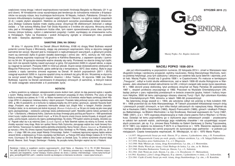 częściowo nową drogą i rekord wspinaczkowo-narciarski Andrzeja Bargiela na Manaslu (21 h up and down). W himalaizmie coraz wyraźniejsza jest tendencja do schodzenia mistrzów z 8-tysięczników na szczyty niższe, lecz trudniejsze technicznie. W Nepalu, Indiach, Pakistanie, Chinach dokonano kilkudziesięciu budzących respekt wejść ścianami i filarami, na ogół w małych zespołach (2–4) i często stylem alpejskim. Niektóre ze zdobytych szczytów pozostawały dotąd dziewicze. Jury Złotego Czekana będzie miało ciężką pracę: otrzymuje 65 efektownych dokonań z całego świata – z Tatr solową Wielką Grań Tatr Doda Kopolda w 3 krótkie dni stycznia. Mroczną stroną roku jest w Himalajach i Karakorum liczba ofiar, tym razem spowodowana przez dwa czynniki: losowy (obryw lodowy, cyklon z załamaniem pogody) i ludzki, wynikający ze zmasowania ruchu w Himalajach. Tylko na Evereście i wokół Annapurny zginęło w omawianym roku przeszło 60 osób – Szerpów, alpinistów i turystów. STYCZEŃ 2015 (1) SAMOTNIE ZIMĄ NA DENALI W dniu 11 stycznia 2015 na Denali (Mount McKinley, 6168 m) drogą West Buttress wszedł polarnik Lonnie Dupre z Minnesoty, stając się pierwszym wspinaczem, który w styczniu osiągnął samotnie ten szczyt. Styczeń jest tu miesiącem o najtrudniejszych warunkach, a głównymi problemami są ciemność (tylko 6 godzin światła dziennego) i zimno (do –40°C, wichury do 100 mph). Swoją solową wyprawę rozpoczął 18 grudnia w Kahiltna Basecamp, z zapasem sprzętu i żywności na 34 dni. W sprzęcie niezwykle ważne okazały się narty. Ponieważ na starcie śnieg był ciężki, bez nich nie sposób byłoby nawet wyruszyć w górę. Od wysokości 3400 m używał raków, a zapasy ciągnął na saniach. Powyżej 4300 m niósł już plecak. Dupre swoje doświadczenie zdobywał na Biegunie Północnym i Grenlandii, gdzie zetknął się z temperaturą –50°C (bez wiatru). Była to jego czwarta z rzędu samotna zimowa wyprawa na Denali. W dwóch poprzednich (2011 i 2013) osiągnął wysokość 5250 m. Łącznie spędził zimą na stokach tej góry 90 dni. Wcześniej w styczniu na szczyt weszli tylko Rosjanie Władimir Ananicz i Artiur Testow, 16 stycznia 1998 (via West Buttress). Łącznie na Denali zanotowano 9 ekspedycji zimowych (4 samotne), w których trakcie 16 osób osiągnęło wierzchołek a 6 postradało życie. Rudaw Janowic NOTATKI Balony powietrzne s¹ najlepszym zabezpieczeniem przeciw skutkom lawin, jednak nie daj¹ gwarancji wyjœcia z wypadku z ¿yciem. Wed³ug œwie¿ych obliczeñ, na 100 wypadków lawinowych przypadaj¹ 22 ofiary œmiertelne. Przy u¿yciu air bagu liczba ta zmniejsza siê o po³owê: do 11/100. ● Wobec masowoœci ruchu na Evereœcie, w³adze Nepalu zamierzaj¹ Uskok Hillary’ego (8760 m) ubezpieczyæ metalow¹ drabin¹ i sta³ymi porêczami. Przeciwko takiej profanacji szczytu ostro zaprotestowa³a UIAA. ● Mi³o mi powiadomiæ, ¿e w konkursie na najlepsz¹ ksi¹¿kê roku 2014 portalu <granice.pl>, opowieœæ Ryszarda Szafirskiego „Prze¿y³em, wiêc wiem” w g³osowaniu internautów zdoby³a tytu³ „Ksi¹¿ki Roku” w kategorii „Podró¿e Literackie”. Chcia³bym dodaæ, ¿e na ukoñczeniu jest dodruk tej pozycji. (Roman Gołędowski) ● Od paru lat rozwija siê jako nowa ga³¹Ÿ sportu glaciospeleologia – zwiedzanie cudownego œwiata podlodowcowych jaskiñ. Niewielkie jaskinie lodowe pamiêtamy te¿ z Tatr – z Bañdziocha, z Miedzianej Kotliny. Za³amanie siê stropu firnowego groty pod Bul¹ pod Rysami w r. 1958 spowodowa³o œmieræ turysty i ciê¿kie obra¿eniami dwóch innych. ● W dniu 25 stycznia zmar³a Urszula Janicka-Krzywda, dr etnografii, publicystka, autorka ksi¹¿ek, zas³u¿ona dla regionu podbabiogórskiego. Na stoisku TPN kupi³em ostatnio jej ksi¹¿kê „Góralskie czary”. Pogrzeb odby³ siê w jej rodzinnej Zawoi. (Leszek Ogórek) ● Rafa³ S³awiñski wybiera siê wiosn¹ na Everest, na który chcia³by wyszukaæ now¹ drogê. Mo¿e tam spotkaæ Niemca Ralfa Dujmovitsa, planuj¹cego wejœcie bez maski tlenowej Kuluarem Nortona. Towarzyszyæ mu bêdzie wybitna alpinistka amerykañska, Nancy Hansen. (Rudaw Janowic) ● W po³owie lutego wyrusza z A³ma Aty zimowa wyprawa Kazachstañskiego Klubu Górskiego na Pik Pobiedy, zdobyty zim¹ tylko raz, 25 lat temu – 2 lutego 1990 roku przez zespó³ Walerija Chriszczatego. Szefem 11-osobowej tegorocznej wyprawy bêdzie weteran Jerwand Iljiñski, a dedykowano j¹ 70-leciu zwyciêstwa nad Niemcami. ● Podczas XXIII edycji Z³otego Czekana (9–12 IV Chamonix, Courmayeur) Sir Chris Bonington odbierze Z³oty Czekan za Dorobek ¯ycia. To cenione wyró¿nienie otrzymali dot¹d Bonatti, Messner, Scott, Paragot, Diemberger i Roskeley. Na pocz¹tku kariery Bonington wspina³ siê te¿ z Polakami. ● Maciej Popko. Fot. Bogdan Jankowski MACIEJ POPKO 1936–2014 Jak już informowaliśmy w poprzednim numerze, 22 listopada 2014 r. zmarł w Warszawie nasz długoletni kolega i serdeczny przyjaciel, wybitny naukowiec, filolog Starożytnego Wschodu, twórca polskiej hetytologii, przy tym zasłużony i aktywny po ostatnie lata życia taternik i alpinista, prof. dr hab. Maciej Popko. Urodził się 3 grudnia 1936 r. w Częstochowie. Po maturze w tamtejszym „Traugucie”, odbył w Łodzi studia włókiennicze, zaś w latach 1958–63 studia filologiczne w Warszawie. Jako absolwent znalazł zatrudnienie na UW, z którym związał całe swoje życie zawodowe. W r. 1968 obronił pracę doktorską, tytuł profesora otrzymał od Rady Państwa 30 października 1987 r., stopień profesora zwyczajnego w 1992. Pracował na Wydziale Orientalistycznym UW, będąc jednym z paru najbardziej poważanych w świecie znawców języka, historii i kultury imperium Hetytów, 3500 lat temu zajmującego obszary obecnej Turcji i Syrii. Był członkiem Komitetu Nauk Orientalistycznych PAN, któremu w latach 1990–92 przewodniczył. Na taternicką drogę wszed