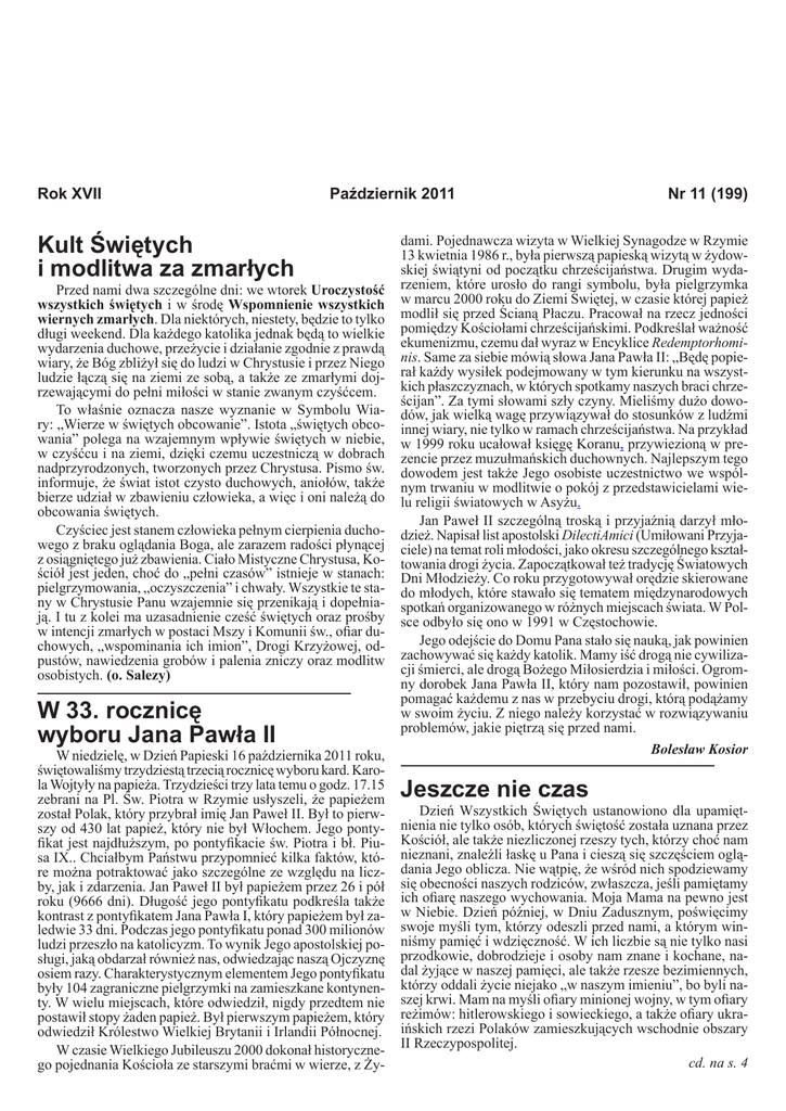 Nasza Wspólnota, Nr 11 (199), październik 2011 Rok XVII Październik 2011 Kult Świętych i modlitwa za zmarłych Przed nami dwa szczególne dni: we wtorek Uroczystość wszystkich świętych i w środę Wspomnienie wszystkich wiernych zmarłych. Dla niektórych, niestety, będzie to tylko długi weekend. Dla każdego katolika jednak będą to wielkie wydarzenia duchowe, przeżycie i działanie zgodnie z prawdą wiary, że Bóg zbliżył się do ludzi w Chrystusie i przez Niego ludzie łączą się na ziemi ze sobą, a także ze zmarłymi dojrzewającymi do pełni miłości w stanie zwanym czyśćcem. To właśnie oznacza nasze wyznanie w Symbolu Wiary: „Wierze w świętych obcowanie”. Istota „świętych obcowania” polega na wzajemnym wpływie świętych w niebie, w czyśćcu i na ziemi, dzięki czemu uczestniczą w dobrach nadprzyrodzonych, tworzonych przez Chrystusa. Pismo św. informuje, że świat istot czysto duchowych, aniołów, także bierze udział w zbawieniu człowieka, a więc i oni należą do obcowania świętych. Czyściec jest stanem człowieka pełnym cierpienia duchowego z braku oglądania Boga, ale zarazem radości płynącej z osiągniętego już zbawienia. Ciało Mistyczne Chrystusa, Kościół jest jeden, choć do „pełni czasów” istnieje w stanach: pielgrzymowania, „oczyszczenia” i chwały. Wszystkie te stany w Chrystusie Panu wzajemnie się przenikają i dopełniają. I tu z kolei ma uzasadnienie cześć świętych oraz prośby w intencji zmarłych w postaci Mszy i Komunii św., ofiar duchowych, „wspominania ich imion”, Drogi Krzyżowej, odpustów, nawiedzenia grobów i palenia zniczy oraz modlitw osobistych. (o. Salezy) W 33. rocznicę wyboru Jana Pawła II 1 W niedzielę, w Dzień Papieski 16 października 2011 roku, świętowaliśmy trzydziestą trzecią rocznicę wyboru kard. Karola Wojtyły na papieża. Trzydzieści trzy lata temu o godz. 17.15 zebrani na Pl. Św. Piotra w Rzymie usłyszeli, że papieżem został Polak, który przybrał imię Jan Paweł II. Był to pierwszy od 430 lat papież, który nie był Włochem. Jego pontyfikat jest najdłuższym, po pontyfikacie św. Piotra i bł. Piusa IX.. Chciałbym Państwu przypomnieć kilka faktów, które można potraktować jako szczególne ze względu na liczby, jak i zdarzenia. Jan Paweł II był papieżem przez 26 i pół roku (9666 dni). Długość jego pontyfikatu podkreśla także kontrast z pontyfikatem Jana Pawła I, który papieżem był zaledwie 33 dni. Podczas jego pontyfikatu ponad 300 milionów ludzi przeszło na katolicyzm. To wynik Jego apostolskiej posługi, jaką obdarzał również nas, odwiedzając naszą Ojczyznę osiem razy. Charakterystycznym elementem Jego pontyfikatu były 104 zagraniczne pielgrzymki na zamieszkane kontynenty. W wielu miejscach, które odwiedził, nigdy przedtem nie postawił stopy żaden papież. Był pierwszym papieżem, który odwiedził Królestwo Wielkiej Brytanii i Irlandii Północnej. W czasie Wielkiego Jubileuszu 2000 dokonał historycznego pojednania Kościoła ze starszymi braćmi w wierze, z Ży- Nr 11 (199) dami. Pojednawcza wizyta w Wielkiej Synagodze w Rzymie 13 kwietnia 1986 r., była pierwszą papieską wizytą w żydowskiej świątyni od początku chrześcijaństwa. Drugim wydarzeniem, które urosło do rangi symbolu, była pielgrzymka w marcu 2000 roku do Ziemi Świętej, w czasie której papież modlił się przed Ścianą Płaczu. Pracował na rzecz jedności pomiędzy Kościołami chrześcijańskimi. Podkreślał ważność ekumenizmu, czemu dał wyraz w Encyklice Redemptorhominis. Same za siebie mówią słowa Jana Pawła II: „Będę popierał każdy wysiłek podejmowany w tym kierunku na wszystkich płaszczyznach, w których spotkamy naszych braci chrześcijan”. Za tymi słowami szły czyny. Mieliśmy dużo dowodów, jak wielką wagę przywiązywał do stosunków z ludźmi innej wiary, nie tylko w ramach chrześcijaństwa. Na przykład w 1999 roku ucałował księgę Koranu, przywiezioną w prezencie przez muzułmańskich duchownych. Najlepszym tego dowodem jest także Jego osobiste uczestnictwo we wspólnym trwaniu w modlitwie o pokój z przedstawicielami wielu religii światowych w Asyżu. Jan Paweł II szczególną troską i przyjaźnią darzył młodzież. Napisał list apostolski DilectiAmici (Umiłowani Przyjaciele) na temat roli młodości, jako okresu szczególnego kształtowania drogi życia. Zapoczątkował też tradycję Światowych Dni Młodzieży. Co roku przygotowywał orędzie skierowane do młodych, które stawało się tematem międzynarodowych spotkań organizowanego w różnych miejscach świata. W Polsce odbyło się ono w 1991 w Częstochowie. Jego odejście do Domu Pana stało się nauką, jak powinien zachowywać się każdy katolik. Mamy iść drogą nie cywilizacji śmierci, ale drogą Bożego Miłosierdzia i miłości. Ogromny dorobek Jana Pawła II, który nam pozostawił, powinien pomagać każdemu z nas w przebyciu drogi, którą podążamy w swoim życiu. Z niego należy korzystać w rozwiązywaniu problemów, jakie piętrzą się przed nami. Bolesław Kosior Jeszcze nie czas Dzień Wszystkich Świętych ustanowiono dla upamiętnienia nie tylko osób, których świętość została uznana przez Kościół, ale także niezliczonej rzeszy tych, którzy choć nam nieznani, znaleźli łaskę u Pana i cieszą się szczęściem oglądania Jego oblicza. Nie wątpię, że wśród nich spodziewamy się obecności naszych rodziców, zwłaszcza, jeśli pamiętamy ich ofiarę naszego wychowania. Moja Mama na pewno jest w Niebie. Dzień później, w Dniu Zadusznym, poświęcimy swoje myśli tym, którzy odeszli przed nami, a którym winniśmy pamięć i wdzięczność. W ich liczbie są nie tylko nasi przodkowie, dobrodzieje i osoby nam znane i kochane, nadal żyjące w naszej pamięci, ale także rzesze bezimiennych, którzy oddali życie niejako „w naszym imieniu”, bo byli naszej krwi. Mam na myś