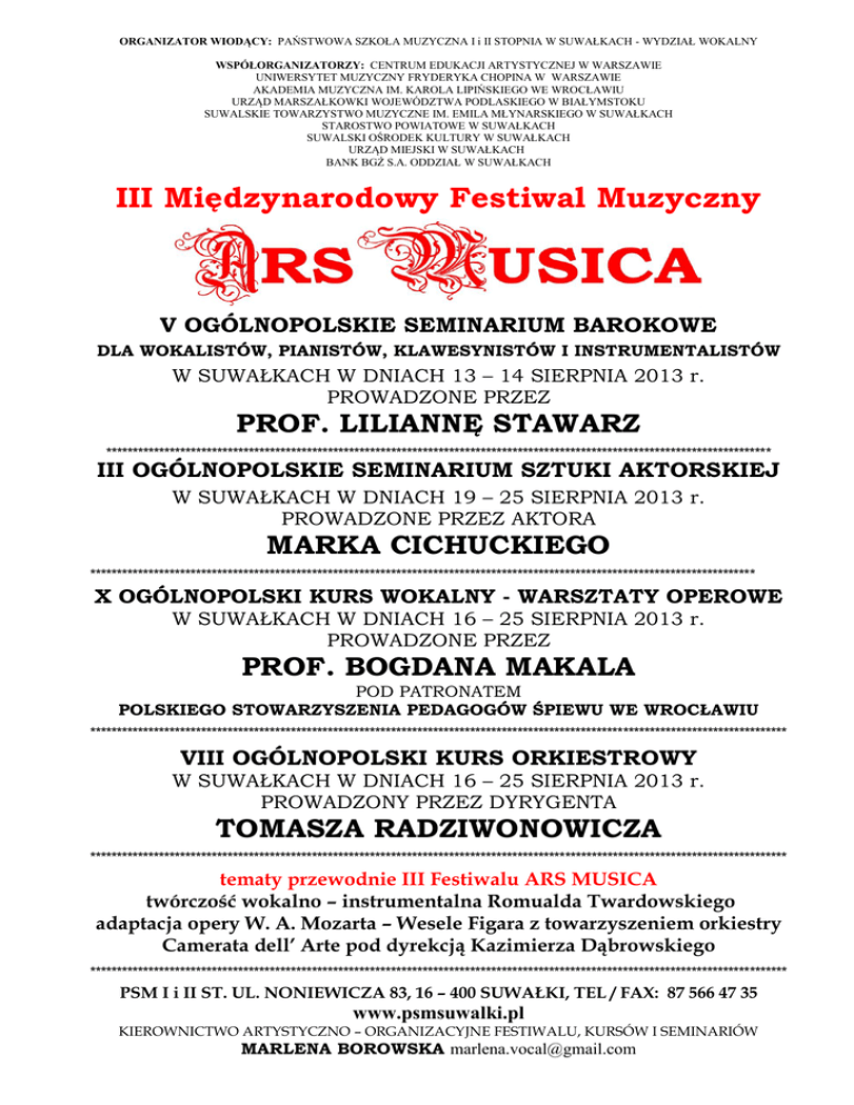 ORGANIZATOR WIODĄCY: PAŃSTWOWA SZKOŁA MUZYCZNA I i II STOPNIA W SUWAŁKACH - WYDZIAŁ WOKALNY WSPÓŁORGANIZATORZY: CENTRUM EDUKACJI ARTYSTYCZNEJ W WARSZAWIE UNIWERSYTET MUZYCZNY FRYDERYKA CHOPINA W WARSZAWIE AKADEMIA MUZYCZNA IM. KAROLA LIPIŃSKIEGO WE WROCŁAWIU URZĄD MARSZAŁKOWKI WOJEWÓDZTWA PODLASKIEGO W BIAŁYMSTOKU SUWALSKIE TOWARZYSTWO MUZYCZNE IM. EMILA MŁYNARSKIEGO W SUWAŁKACH STAROSTWO POWIATOWE W SUWAŁKACH SUWALSKI OŚRODEK KULTURY W SUWAŁKACH URZĄD MIEJSKI W SUWAŁKACH BANK BGŻ S.A. ODDZIAŁ W SUWAŁKACH III Międzynarodowy Festiwal Muzyczny V OGÓLNOPOLSKIE SEMINARIUM BAROKOWE DLA WOKALISTÓW, PIANISTÓW, KLAWESYNISTÓW I INSTRUMENTALISTÓW W SUWAŁKACH W DNIACH 13 – 14 SIERPNIA 2013 r. PROWADZONE PRZEZ PROF. LILIANNĘ STAWARZ ****************************************************************************************************************************** III OGÓLNOPOLSKIE SEMINARIUM SZTUKI AKTORSKIEJ W SUWAŁKACH W DNIACH 19 – 25 SIERPNIA 2013 r. PROWADZONE PRZEZ AKTORA MARKA CICHUCKIEGO ****************************************************************************************************************************** X OGÓLNOPOLSKI KURS WOKALNY - WARSZTATY OPEROWE W SUWAŁKACH W DNIACH 16 – 25 SIERPNIA 2013 r. PROWADZONE PRZEZ PROF. BOGDANA MAKALA POD PATRONATEM POLSKIEGO STOWARZYSZENIA PEDAGOGÓW ŚPIEWU WE WROCŁAWIU ************************************************************************************************************************************ VIII OGÓLNOPOLSKI KURS ORKIESTROWY W SUWAŁKACH W DNIACH 16 – 25 SIERPNIA 2013 r. PROWADZONY PRZEZ DYRYGENTA TOMASZA RADZIWONOWICZA ************************************************************************************************************************************ tematy przewodnie III Festiwalu ARS MUSICA twórczość wokalno – instrumentalna Romualda Twardowskiego adaptacja opery W. A. Mozarta – Wesele Figara z towarzyszeniem orkiestry Camerata dell’ Arte pod dyrekcją Kazimierza Dąbrowskiego ************************************************************************************************************************************ PSM I i II ST. UL. NONIEWICZA 83, 16 – 400 SUWAŁKI, TEL / FAX: 87 566 47 35 www.psmsuwalki.pl KIEROWNICTWO ARTYSTYCZNO – ORGANIZACYJNE FESTIWALU, KURSÓW I SEMINARIÓW MARLENA BOROWSKA [email protected]