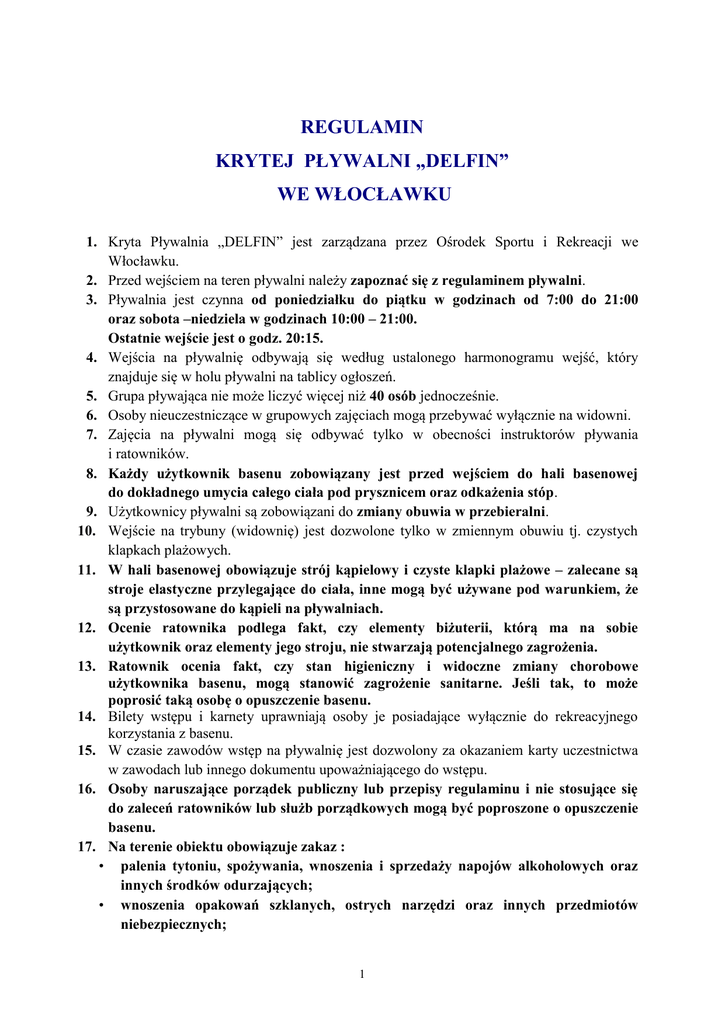 REGULAMIN KRYTEJ PŁYWALNI „DELFIN” WE WŁOCŁAWKU 1. Kryta Pływalnia „DELFIN” jest zarządzana przez Ośrodek Sportu i Rekreacji we Włocławku. 2. Przed wejściem na teren pływalni należy zapoznać się z regulaminem pływalni. 3. Pływalnia jest czynna od poniedziałku do piątku w godzinach od 7:00 do 21:00 oraz sobota –niedziela w godzinach 10:00 – 21:00. Ostatnie wejście jest o godz. 20:15. 4. Wejścia na pływalnię odbywają się według ustalonego harmonogramu wejść, który znajduje się w holu pływalni na tablicy ogłoszeń. 5. Grupa pływająca nie może liczyć więcej niż 40 osób jednocześnie. 6. Osoby nieuczestniczące w grupowych zajęciach mogą przebywać wyłącznie na widowni. 7. Zajęcia na pływalni mogą się odbywać tylko w obecności instruktorów pływania i ratowników. 8. Każdy użytkownik basenu zobowiązany jest przed wejściem do hali basenowej do dokładnego umycia całego ciała pod prysznicem oraz odkażenia stóp. 9. Użytkownicy pływalni są zobowiązani do zmiany obuwia w przebieralni. 10. Wejście na trybuny (widownię) jest dozwolone tylko w zmiennym obuwiu tj. czystych klapkach plażowych. 11. W hali basenowej obowiązuje strój kąpielowy i czyste klapki plażowe – zalecane są stroje elastyczne przylegające do ciała, inne mogą być używane pod warunkiem, że są przystosowane do kąpieli na pływalniach. 12. Ocenie ratownika podlega fakt, czy elementy biżuterii, którą ma na sobie użytkownik oraz elementy jego stroju, nie stwarzają potencjalnego zagrożenia. 13. Ratownik ocenia fakt, czy stan higieniczny i widoczne zmiany chorobowe użytkownika basenu, mogą stanowić zagrożenie sanitarne. Jeśli tak, to może poprosić taką osobę o opuszczenie basenu. 14. Bilety wstępu i karnety uprawniają osoby je posiadające wyłącznie do rekreacyjnego korzystania z basenu. 15. W czasie zawodów wstęp na pływalnię jest dozwolony za okazaniem karty uczestnictwa w zawodach lub innego dokumentu upoważniającego do wstępu. 16. Osoby naruszające porządek publiczny lub przepisy regulaminu i nie stosujące się do zaleceń ratowników lub służb porządkowych mogą być poproszone o opuszczenie basenu. 17. Na terenie obiektu obowiązuje zakaz : • palenia tytoniu, spożywania, wnoszenia i sprzedaży napojów alkoholowych oraz innych środków odurzających; • wnoszenia opakowań szklanych, ostrych narzędzi oraz innych przedmiotów niebezpiecznych; 1 • wstępu osobom, których stan wskazuje na spożycie alkoholu lub innych środków odurzających; • wprowadzania i przebywania zwierząt; • niszczenia wyposażenia. 18. Prowadzenie nauki pływania może odbywać się jedynie na zewnętrznym torze oraz w sposób nie utrudniający korzystania z basenu innym osobom. 19. Dzieci do lat 10 mogą przebywać na terenie pływalni wyłącznie pod opieką osoby pełnoletniej. 20. Na pływalni obowiązuje zachowanie porządku, czystości, spokoju i bezwzględnego podporządkowania się poleceniom prowadzącego zajęcia lub dyżurujących ratowników. 21. Ratownik ma obowiązek sprawdzić zgodność ilości osób wchodzących i wychodzących. 22. Grupy zorganizowane muszą posiadać co najmniej jednego instruktora odpowiedzialnego za swoich podopiecznych przez cały czas przebywania na terenie pływalni. 23. Instruktor-opiekun grupy przed wejściem na halę basenową musi omówić zasady kąpieli z dyżurnym ratownikiem. 24. Korzystanie ze zjeżdżalni musi odbywać się pod ciągłym nadzorem ratownika i zgodnie z instrukcją znajdującą się przy wejściu na zjeżdżalnię. Należy bezwzględnie stosować się do poleceń ratownika. 25. Na terenie hali basenowej zabrania się: • biegania po obejściach, dojściach i spychania innych użytkowników do wody; • skakania do wody z rozbiegu; • wskakiwania do rury zjeżdżalni; • wnoszenia i konsumpcji artykułów żywnościowych na halę basenową; • niszczenia wyposażenia i zanieczyszczania wody basenowej; • stwarzania swoim zachowaniem, zagrożenia dla bezpieczeństwa innych użytkowników; • wchodzić na wieżę i skakać z niej do wody bez zachowania szczególnej ostrożności i zgody ratowników. 26. Wszelkie skaleczenia, urazy oraz nieprawidłowości należy niezwłocznie zgłaszać dyżurnemu ratownikowi do oględzin i do odnotowania w Książce Ambulatoryjnej. 27. Grupy i osoby korzystające z basenu mogą wejść do szatni na 10 minut przed wyznaczoną godziną wejścia. 28. Osoby spóźnione mogą być nie wpuszczone na halę basenową. 29. Po sygnale dźwiękowym korzystający z basenu powinni niezwłocznie opuścić halę basenową. 30. Za bezpieczeństwo i przestrzeganie „Regulaminu” odpowiadają dyżurni ratownicy. Wszystkie osoby korzystające z basenu zobowiązane są do podporządkowania się ich poleceniom. 31. W czasie zawodów lub innych imprez sportowo rekreacyjnych Organizator wynajmujący basen odpowiada i zapewnia bezpieczeństwo wszystkim uczestnikom imprezy-zawodów. Obowiązuje wówczas regulamin zawodów oraz zalecenia organizatorów. 32. Ratownicy, instruktorzy i pracownicy OSiR, którzy nie pełnią dyżuru na pływalni, traktowani są jak osoby korzystające z basenu i podlegają tym samym prawom i obowiązkom – muszą posiadać ważny bilet wstępu. 2 33. Za zniszczenie lub uszkodzenie wyposażenia pływalni obowiązuje odpłatność w wysokości 100% wartości szkody na podstawie spisanego protokołu zniszczenia lub uszkodzenia. 34. Ośrodek Sportu i Rekreacji nie ponosi odpowiedzialności za przedmioty wartościowe zgubione, pozostawione lub skradzione na terenie pływalni. 35. Ośrodek Sportu i Rekreacji nie odpowiada za wypadki spowodowane nieprzestrzeganiem Regulaminu. DYREKTOR OŚRODKA SPORTU I REKREACJI 3