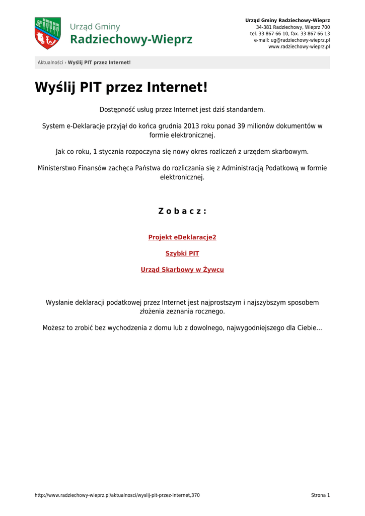 Urząd Gminy Radziechowy-Wieprz 34-381 Radziechowy, Wieprz 700 tel. 33 867 66 10, fax. 33 867 66 13 e-mail: [email protected] www.radziechowy-wieprz.pl Aktualności › Wyślij PIT przez Internet! Wyślij PIT przez Internet! Dostępność usług przez Internet jest dziś standardem. System e-Deklaracje przyjął do końca grudnia 2013 roku ponad 39 milionów dokumentów w formie elektronicznej. Jak co roku, 1 stycznia rozpoczyna się nowy okres rozliczeń z urzędem skarbowym. Ministerstwo Finansów zachęca Państwa do rozliczania się z Administracją Podatkową w formie elektronicznej. Zobacz: Projekt eDeklaracje2 Szybki PIT Urząd Skarbowy w Żywcu Wysłanie deklaracji podatkowej przez Internet jest najprostszym i najszybszym sposobem złożenia zeznania rocznego. Możesz to zrobić bez wychodzenia z domu lub z dowolnego, najwygodniejszego dla Ciebie... http://www.radziechowy-wieprz.pl/aktualnosci/wyslij-pit-przez-internet,370 Strona 1