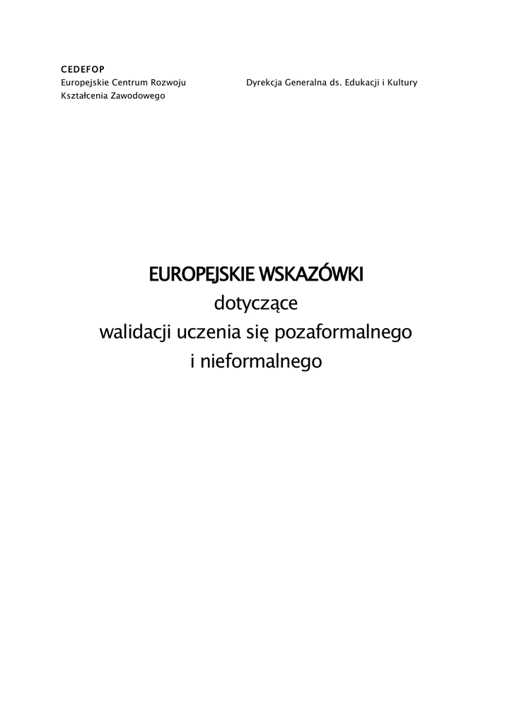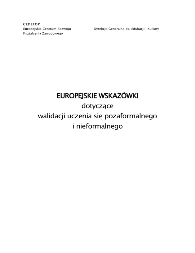 C E D EF O P Europejskie Centrum Rozwoju Dyrekcja Generalna ds. Edukacji i Kultury Kształcenia Zawodowego EUROPEJSKIE WSKAZÓWKI dotyczące walidacji uczenia się pozaformalnego i nieformalnego Luksemburg: Biuro Urzędowych Publikacji Wspólnot Europejskich, 2009 ISBN 978-92-896-0602-8 ©European Centre for the Development of Vocational Training, 2009 Wszelkie prawa zastrzeżone. Cedefop Europe 123, 570 01 Thessaloniki (Pylea), GREECE PO Box 22427, 551 02 Thessaloniki, GREECE Tel. +30 2310490111, Faks +30 2310490020 E-mail: [email protected] www.cedefop.europa.eu 2 Przedmowa Niniejsza publikacja przedstawia wnioski z ponad dwuletniej, intensywnej wymiany doświadczeń – z udziałem przedstawicieli ponad 20 krajów europejskich – w zakresie walidacji uczenia się pozaformalnego i nieformalnego. Głównym jej celem jest udostępnienie efektów tego procesu wspólnego uczenia się szerszym kręgom odbiorców i wspieranie w ten sposób dalszego rozwoju walidacji uczenia się pozaformalnego i nieformalnego na poziomie europejskim, krajowym i lokalnym. Niniejsze wskazówki – choć zostały zainspirowane europejskimi zasadami identyfikacji i walidacji uczenia się pozaformalnego i nieformalnego, które Rada Europejska przyjęła w 2004 r. – nie wyznaczają ram polityki zatwierdzonych przez organ ustawodawczy: stanowią one praktyczne narzędzie oferujące fachowe porady, które mogą być stosowane jedynie na czysto dobrowolnej zasadzie. Ich oddziaływanie zależy wyłącznie od tego, czy okażą się adekwatne i będą stanowić wartość dodaną na poziomie krajowym i lokalnym. Wskazówki są adresowane do szerokiego grona decydentów i praktyków zajmujących się opracowywaniem i wdrażaniem rozwiązań w zakresie walidacji na różnych poziomach. Należy zauważyć, że walidacja nie jest jedynie przedmiotem zainteresowania placówek edukacyjnych i szkoleniowych; dotyczy ona także przedsiębiorstw, sektorów gospodarki, organizacji pozarządowych itp. W tekście starano się uwzględnić istnienie bardzo różnych interesariuszy, szczególnie w „liście pytań kontrolnych” dla praktyków, oferując zaangażowanym instytucjom i osobom praktyczne narzędzie do oceny postępów. Niniejsze wskazówki są w dużej mierze efektem międzynarodowej współpracy i wspólnego uczenia się w ramach tzw. klastra ds. uznawania efektów uczenia się, utworzonego w 2006 r. w kontekście programu pracy „Edukacja i szkolenia 2010”. W klastrze tym – wspieranym finansowo, organizacyjnie i na płaszczyźnie analitycznej przez Komisję Europejską i Cedefop – znaleźli się przedstawiciele krajów szczególnie zainteresowanych problematyką walidacji. O znaczeniu tej problematyki świadczy to, że liczba uczestniczących krajów wzrosła z 21 w 2006 r. do 26 w 2009 r. Prace klastra nad walidacją ilustrują potencjał wymiany polegającej na wzajemnym uczeniu się od siebie uczestników (ang. peer learning). Trzy spotkania typu peer learning poświęcone walidacji, które zostały zorganizowane przez klaster od 2006 r. (w Belgii, Francji i Islandii), umożliwiły zidentyfikowanie najważniejszych problemów i omówienie ewentualnych rozwiązań z udziałem ekspertów i decydentów. Najważniejsze jest to, że publikacja niniejszych wskazówek świadczy o tym, iż walidację uczenia się pozaformalnego i nieformalnego postrzega się coraz częściej jako sposób ulepszania uczenia się przez całe życie i uczenia się w różnych miejscach i formach. Szybko wzrasta liczba krajów, w których podkreśla się, jak istotne znaczenie ma uwidacznianie i docenianie uczenia się odbywającego się poza placówkami prowadzącymi kształcenie i szkolenie formalne, w pracy, w domu i w ramach zajęć w czasie wolnym. Niniejszy tekst należy traktować jako pierwszy wkład w zbiór europejskich wskazówek w zakresie walidacji. W nadchodzących latach konieczne są oczywiście dalsze prace nad jego rozszerzeniem i pogłębieniem, które powinny być prowadzone poprzez kontynuowanie współpracy i wspólnego uczenia się, jakie wspomniany wyżej klaster umożliwia od 2006 r. Europejskie wskazówki w zakresie walidacji uczenia się pozaformalnego i nieformalnego odzwierciedlają konstruktywną współpracę pomiędzy Dyrekcją Generalną ds. Edukacji i Kultury Komisji Europejskiej a Cedefop w zakresie koordynacji prac klastra i zajęć typu peer learning w tej dziedzinie. Tę współpracę chcemy dalej rozwijać i wzmacniać w nadchodzących latach. Aviana Bulgarelli Gordon Clark Dyrektor Cedefop Kierownik Wydziału Uczenie się przez całe życie: wkład w Proces Lizboński Dyrekcja Generalna ds. Edukacji i Kultury Komisja Europejska 4 Spis treści Przedmowa Podziękowania 1. Wprowadzenie i metodologia 1.1. 1.2. 1.3. 1.4. 1.5. 1.6. 1.7. Czemu mają służyć wskazówki europejskie? Wskazówki – dane jako podstawa Wyzwania terminologiczne Znaczenie walidacji uczenia się pozaformalnego i nieformalnego Ścieżki prowadzące od uczenia się do certyfikacji Role interesariuszy Podsumowanie dotychczasowych doświadczeń 2. Efektywne praktyki w zakresie walidacji – perspektywa europejska 2.1. 2.2. 2.3. Zapewnienie porównywalności procesów walidacji Instrumenty zapewniania jakości Inne europejskie narzędzia polityki 3. Efektywne praktyki w zakresie walidacji – perspektywa krajowa 3.1. 3.2. 3.3. 3.4. 3.5. 3.6. Społeczne i ekonomiczne przesłanki krajowych strategii walidacji Związek z krajowymi systemami walidacji Status prawny walidacji Krajowe ramy kwalifikacji Krajowe standardy efektów uczenia się Systemy walidacji – trwałość i efektywne wykorzystanie środków 4. Efektywne praktyki w zakresie walidacji – perspektywa organizacji 4.1. 4.2. 4.3. Edukacja formalna Firmy sektora prywatnego Edukacja dorosłych i trzeci sektor 4.3.1. Kształcenie i uczenie się dorosłych 4.3.2. Trzeci sektor 4.4. Instytucje uczestniczące w walidacji 5. Efektywne praktyki w zakresie walidacji – indywidual