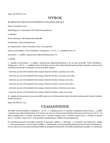 Sygn. akt VIII GC 1/13 WYROK WIMIENIURZECZYPOSPOLITEJPOLSKIEJ Dnia 16 kwietnia 2015 r. Sąd Okręgowy w Szczecinie VIII Wydział Gospodarczy w składzie: Przewodniczący: SSO Agnieszka Kądziołka Protokolant : Eliza Sandomierska po rozpoznaniu w dniu 2 kwietnia 2015 r. na rozprawie sprawy z powództwa Firmy Handlowo-Usługowej (...) D. D., (...) spółki jawnej w S. przeciwko (...) spółki z ograniczoną odpowiedzialnością w B. o zapłatę I. zasądza od pozwanej (...) spółki z ograniczoną odpowiedzialnością w B. na rzecz powódki Firmy HandlowoUsługowej (...) D. D., (...) spółki jawnej w S. kwotę 192.000 zł (sto dziewięćdziesiąt dwa tysiące złotych) z ustawowymi odsetkami liczonymi w stosunku rocznym do dnia zapłaty: - od kwoty 32.000 zł (trzydzieści dwa tysiące złotych) od dnia 1 grudnia 2011 roku, - od kwoty 32.000 zł (trzydzieści dwa tysiące złotych) od dnia 1 stycznia 2012 roku, - od kwoty 32.000 zł (trzydzieści dwa tysiące złotych) od dnia 1 lutego 2012 roku, - od kwoty 32.000 zł (trzydzieści dwa tysiące złotych) od dnia 1 marca 2012 roku, - od kwoty 32.000 zł (trzydzieści dwa tysiące złotych) od dnia 1 kwietnia 2012 roku, - od kwoty 32.000 zł (trzydzieści dwa tysiące złotych) od dnia 1 maja 2012 roku, II. zasądza od pozwanej na rzecz powódki kwotę 13.217 zł (trzynaście tysięcy dwieście siedemnaście złotych) tytułem kosztów procesu. Sygn. akt VIII GC 1/13 UZASADNIENIE Powódka Firma Handlowo-Usługowa (...) D. D., (...) spółka jawna w S. wniosła o zasądzenie od pozwanej (...) spółki z ograniczoną odpowiedzialnością w B. kwoty 192.000 zł z ustawowymi odsetkami liczonymi od kwot 32.000 zł : od dnia 1 grudnia 2011 r., od dnia 1 stycznia 2012 r., od dnia 1 lutego 2012 r., od dnia 1 marca 2012 r., od dnia 1 kwietnia 2012 r., od dnia 1 maja 2012 r. oraz kosztami postępowania według norm przepisanych. W uzasadnieniu pozwu powódka wskazała, że pozwana spółka (...) (dawniej (...)) zawarła z powódką oraz spółką (...) umowę przekazu, na mocy której spółka (...) przekazała na rzecz powódki należne jej od pozwanej świadczenie w kwocie 384.000 zł oraz upoważniła powódkę do przyjęcia świadczenia. Powódka świadczenie przyjęła. W wykonaniu umowy pozwana w okresie od maja do października 2011 roku dokonała łącznie spłaty w kwocie 192.000 zł, pomimo wezwania do zapłaty pozostałej kwoty 192.000 zł nie uiściła. W odpowiedzi na pozew pozwana wniosła o oddalenie powództwa w całości oraz zasądzenie na jej rzecz kosztów postępowania według norm przepisanych. Pozwana zakwestionowała istnienie swojego zobowiązania wynikającego z umowy przekazu w całości. Potwierdzając sam fakt zawarcia tej umowy pozwana wskazała na określenie przez strony celu umowy, zgodnie z którym przyjęto, że przekaz ma służyć zaspokojeniu nie tylko wierzytelności powódki wobec spółki (...), ale również dokonaniu zapłaty wierzytelności, która przysługiwać będzie spółce (...) wobec pozwanej. Ponieważ jednak wierzytelność spółki (...) wobec pozwanej nie powstała, cel zobowiązania nie mógł zostać przez pozwaną zrealizowany. Pozwana wskazała bowiem, że nigdy nie zostały wykonane usługi, za wykonanie których miała powstać wierzytelność spółki (...) wobec pozwanej, zatem pozwana nie stała się zobowiązana wobec spółki (...). W piśmie procesowym z dnia 6 lutego 2013 roku powódka powołując się na stanowisko doktryny i orzecznictwo sądów podkreśliła, że przyjęcie przekazu, podobnie jak sam przekaz, jest czynnością abstrakcyjną, która powoduje powstanie zobowiązania oderwanego od przyczyny uzasadniającej powstanie stosunków między stronami i dokonanie w ich ramach świadczenia. Powódka podkreśliła taki właśnie charakter objętego sporem przekazu wskazując, że w umowie wyraźnie zapisano, iż spółka (...) (przekazujący) przekazuje odbiorcy ((...)) świadczenie należne jej od (...), natomiast (...) (obecnie (...)) wyraźnie oświadczyła, iż przekaz przyjmuje. Dalej powódka wskazała, że w oparciu o art. 921 2 k.c. przy czynności przekazu wyłączona zostaje możliwość powoływania się na zarzuty wynikające ze stosunku pokrycia oraz zaznaczyła, że powyższe obala twierdzenia o kauzalnym charakterze zawartej między stronami umowy i jednocześnie bezzasadnymi czyni zarzuty pozwanej dotyczące stosunku pokrycia - niewywiązania się spółki (...) z umowy nr (...). Sąd ustalił następujący stan faktyczny: W dniu 29 lutego 2002 roku w Krajowym Rejestrze Sądowym Rejestrze Przedsiębiorców pod numerem (...) została zarejestrowana Firma Handlowo-Usługowa (...) D. D., (...) spółka jawna z siedzibą w S.. Wspólnikami spółki są: D. D. i J. Ś.. W dniu 18 stycznia 2007 roku w Krajowym Rejestrze Sądowym Rejestrze Przedsiębiorców pod numerem (...) została zarejestrowana (...) spółka z ograniczona odpowiedzialnością z siedzibą w P.. W dniu 3 grudnia 2009 roku w Krajowym Rejestrze Sądowym Rejestrze Przedsiębiorców pod numerem (...) została zarejestrowana (...) spółka z ograniczoną odpowiedzialnością z siedzibą w P.. W 2010 roku nazwa spółki została zmieniona na (...). dowód: odpis KRS nr (...) – karta 31-34 odpis KRS nr (...) – karta 35-41 odpis KRS nr (...) – karta 23-30 wydruki z (...) karta 44 W okresie od 17 maja do 16 września 2010 roku spółka jawna działająca pod nazwą Firma Handlowo-Usługowa (...) D. D., J. Ś. zawierała z (...) spółką z ograniczoną odpowiedzialnością umowy sprzedaży materiałów elektroinstalacyjnych. W związku z tymi transakcjami spółka (...) obciążała spółkę (...) fakturami VAT, których łączna wartość wyniosła ostatecznie 743.055,46 zł. Wszelkie należności przysługujące spółce (...), wynikające z umów sprzedaży materiałów elektroinstalacyjnych, zostały uznane przez prezesa zarządu spółki (...)T. P. B. (1), uprawnionego jednoosobowo do jej repr
