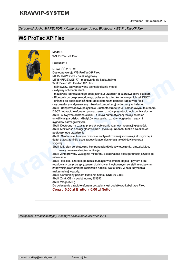 Utworzono : 08 marzec 2017 Ochronniki słuchu 3M PELTOR > Komunikacyjne- do poł. Bluetooth > WS ProTac XP Flex WS ProTac XP Flex Model : WS ProTac XP Flex Producent : NOWOŚĆ 2013 !!! Dostępne wersje WS ProTac XP Flex: MT15H7AWS5-77 - pałąk nagłowny MT15H7P3EWS5-77 - mocowanie do kasku/hełmu W skrócie o WS ProTac XP Flex: - najnowszy, zaawansowany technologicznie model - aktywny ochronnik słuchu - możliwość jednoczesnego podłączenia 2 urządzeń (bezprzewodowo i kablem) - Bluetooth do bezprzewodowego połączenia z tel. komórkowym lub tel. DECT - gniazdo do podłączenia radiotelefonu za pomocą kabla typu Flex - wyposażony w dynamiczny mikrofon komunikacyjny do pracy w hałasie • Bezprzewodowe połączenie Bluetooth™ z tel. komórkowym, telefonem DECT lub radiotelefonem i prowadzenie rozmów przy użyciu ochronnika słuchu • Aktwywna ochrona słuchu - funkcja automatycznej reakcji na hałas umożliwiająca odsłuch dźwięków otoczenia: rozmów, odgłosów maszyn i sygnałów ostrzegawczych. • Dostępny na czaszy przycisk odbierania rozmów i regulacji głośności. • Możliwość obsługi głosowej bez użycia rąk – funkcje zależne od podłączonego urządzenia • Skutecznie tłumiące czasze o zoptymalizowanej konstrukcji akustycznej i dużej przestrzeni dla uszu zapewniającej doskonałą jakość dźwięku oraz wygodę. • Mikrofon ze skuteczną kompensacją dźwięków otoczenia, umożliwiający zrozumiałą i niezawodną komunikację. • Zintegrowany wysięgnik mikrofonu z ułatwiającą obsługę funkcją szybkiego ustawiania. • Miękkie, szerokie poduszki tłumiące wypełnione gąbką i płynem oraz regulowany pałąk ze sprężynami dociskowymi wykonanymi ze stali nierdzewnej zapewniają równomierne rozłożenie nacisku wokół uszu w celu uzyskania maksymalnej wygody. • Uśredniony poziom tłumienia hałasu SNR 30-31dB • Znak CE na podst. normy EN352 • Waga 370 g Do połączenia z radiotelefonem potrzebny jest dodatkowo kabel typu Flex. s y m te V v a r K S IP Cena : 0,00 zł Brutto ( 0,00 zł Netto) Dostępność: Produkt dostępny w naszym sklepie od 05 czerwiec 2014 kontakt : - [email protected] Strona 1/{nb}