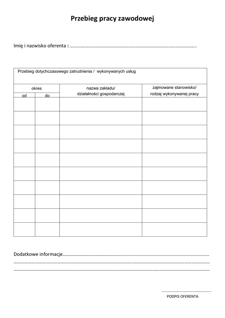 Przebieg pracy zawodowej Imię i nazwisko oferenta : ………………………………………………………………………………………….. Przebieg dotychczasowego zatrudnienia / wykonywanych usług okres od do nazwa zakładu/ działalności gospodarczej zajmowane stanowisko/ rodzaj wykonywanej pracy Dodatkowe informacje………………………………………..................................................................... ……………………………………………………………………………………..……………………………………………………… …………………………………………………………………………………………………………………………………………….. ……………………………………………. PODPIS OFERENTA
