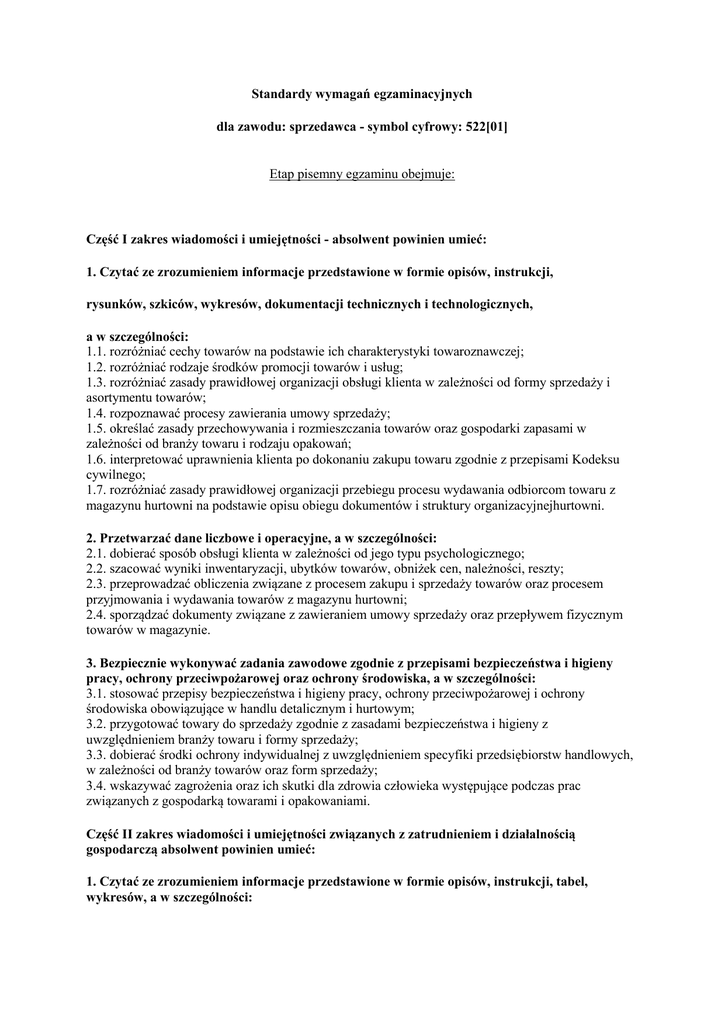 Standardy wymagań egzaminacyjnych dla zawodu: sprzedawca - symbol cyfrowy: 522[01] Etap pisemny egzaminu obejmuje: Część I zakres wiadomości i umiejętności - absolwent powinien umieć: 1. Czytać ze zrozumieniem informacje przedstawione w formie opisów, instrukcji, rysunków, szkiców, wykresów, dokumentacji technicznych i technologicznych, a w szczególności: 1.1. rozróżniać cechy towarów na podstawie ich charakterystyki towaroznawczej; 1.2. rozróżniać rodzaje środków promocji towarów i usług; 1.3. rozróżniać zasady prawidłowej organizacji obsługi klienta w zależności od formy sprzedaży i asortymentu towarów; 1.4. rozpoznawać procesy zawierania umowy sprzedaży; 1.5. określać zasady przechowywania i rozmieszczania towarów oraz gospodarki zapasami w zależności od branży towaru i rodzaju opakowań; 1.6. interpretować uprawnienia klienta po dokonaniu zakupu towaru zgodnie z przepisami Kodeksu cywilnego; 1.7. rozróżniać zasady prawidłowej organizacji przebiegu procesu wydawania odbiorcom towaru z magazynu hurtowni na podstawie opisu obiegu dokumentów i struktury organizacyjnejhurtowni. 2. Przetwarzać dane liczbowe i operacyjne, a w szczególności: 2.1. dobierać sposób obsługi klienta w zależności od jego typu psychologicznego; 2.2. szacować wyniki inwentaryzacji, ubytków towarów, obniżek cen, należności, reszty; 2.3. przeprowadzać obliczenia związane z procesem zakupu i sprzedaży towarów oraz procesem przyjmowania i wydawania towarów z magazynu hurtowni; 2.4. sporządzać dokumenty związane z zawieraniem umowy sprzedaży oraz przepływem fizycznym towarów w magazynie. 3. Bezpiecznie wykonywać zadania zawodowe zgodnie z przepisami bezpieczeństwa i higieny pracy, ochrony przeciwpożarowej oraz ochrony środowiska, a w szczególności: 3.1. stosować przepisy bezpieczeństwa i higieny pracy, ochrony przeciwpożarowej i ochrony środowiska obowiązujące w handlu detalicznym i hurtowym; 3.2. przygotować towary do sprzedaży zgodnie z zasadami bezpieczeństwa i higieny z uwzględnieniem branży towaru i formy sprzedaży; 3.3. dobierać środki ochrony indywidualnej z uwzględnieniem specyfiki przedsiębiorstw handlowych, w zależności od branży towarów oraz form sprzedaży; 3.4. wskazywać zagrożenia oraz ich skutki dla zdrowia człowieka występujące podczas prac związanych z gospodarką towarami i opakowaniami. Część II zakres wiadomości i umiejętności związanych z zatrudnieniem i działalnością gospodarczą absolwent powinien umieć: 1. Czytać ze zrozumieniem informacje przedstawione w formie opisów, instrukcji, tabel, wykresów, a w szczególności: 1.1. rozróżniać podstawowe pojęcia i terminy z obszaru funkcjonowania gospodarki oraz prawa pracy, prawa podatkowego i przepisów regulujących podejmowanie i wykonywanie działalności gospodarczej; 1.2. rozróżniać dokumenty związane z zatrudnieniem oraz podejmowaniem i wykonywaniem działalności gospodarczej; 1.3. identyfikować i analizować informacje dotyczące wymagań i uprawnień pracownika, pracodawcy, bezrobotnego i klienta. 2. Przetwarzać dane liczbowe i operacyjne, a w szczególności: 2.1. analizować informacje związane z podnoszeniem kwalifikacji, poszukiwaniem pracy i zatrudnieniem oraz podejmowaniem i wykonywaniem działalności gospodarczej; 2.2. sporządzać dokumenty związane z poszukiwaniem pracy i zatrudnieniem oraz podejmowaniem i wykonywaniem działalności gospodarczej; 2. rozróżniać skutki wynikające z nawiązania i rozwiązania stosunku pracy. Etap praktyczny egzaminu obejmuje: 1. Obsługa wskazanego typu klienta przy stoisku określonej branży z zastosowaniem ustalonej formy sprzedaży. 2. Obsługa wskazanego typu klienta w hurtowni określonej branży i stopniu zorganizowania pracy. Absolwent powinien umieć: 1. Planować czynności związane z wykonaniem zadania: 1.1. sporządzić plan działania; 1.2. sporządzić wykaz niezbędnych surowców, materiałów, sprzętu kontrolno-pomiarowego, narzędzi; 1.3. wykonać niezbędne obliczenia, rysunki lub szkice pomocnicze. 2. Organizować stanowisko pracy: 2.1. zgromadzić i rozmieścić na stanowisku pracy materiały, narzędzia, urządzenia i sprzęt zgodnie z zasadami bezpieczeństwa i higieny pracy oraz ochrony przeciwpożarowej; 2.2. sprawdzić stan techniczny maszyn, urządzeń i sprzętu; 2.3. dobrać odzież roboczą i środki ochrony indywidualnej. 3. Wykonać zadanie egzaminacyjne z zachowaniem przepisów bezpieczeństwa i higieny pracy, ochrony przeciwpożarowej oraz ochrony środowiska i wykazać się umiejętnościami objętymi tematami: 3.1. Obsługa wskazanego typu klienta przy stoisku określonej branży z zastosowaniem ustalonej formy sprzedaży: 3.1.1. przeprowadzić rozmowę sprzedażową z uwzględnieniem typu psychologicznego klienta; 3.1.2. zaprezentować towar klientowi i udzielić poradnictwa sprzedażowego na stanowisku obsługi klienta; 3.1.3. obsługiwać urządzenia i sprzęt techniczny na stanowisku obsługi klienta; 3.1.4. wykonać operacje rachunkowo-kasowe i sporządzić dokumenty sprzedaży; 3.1.5. sporządzić dokumenty dotyczące uprawnień klientów po dokonaniu zakupu towarów; 3.1.6. postępować zgodnie z etyką zawodu; 3.1.7. stosować przepisy sanitarno-epidemiologiczne; 3.1.8. kontrolować na bieżąco jakość prac i usuwać usterki; 3.1.9. utrzymywać ład i porządek na stanowisku pracy; 3.1.10. wykonać zadanie w przewidzianym czasie; 3.1.11. uporządkować stanowisko pracy, oczyścić narzędzia i sprzęt, rozliczyć materiały, 3.2. Obsługa wskazanego typu klienta w hurtowni określonej branży i stopniu zorganizowania pracy: 3.2.1. przeprowadzić rozmowę sprzedażową z określonym typem klienta; 3.2.2. wydać towar z magazynu dla klienta hurtowni; 3.2.3. posługiwać się podstawową dokumentacją magazynową i sprzedaży towarów obowiązującą w hurtowni; 3.2.4. obsługiwać podstawowe urządzenia magazynowe i transporto