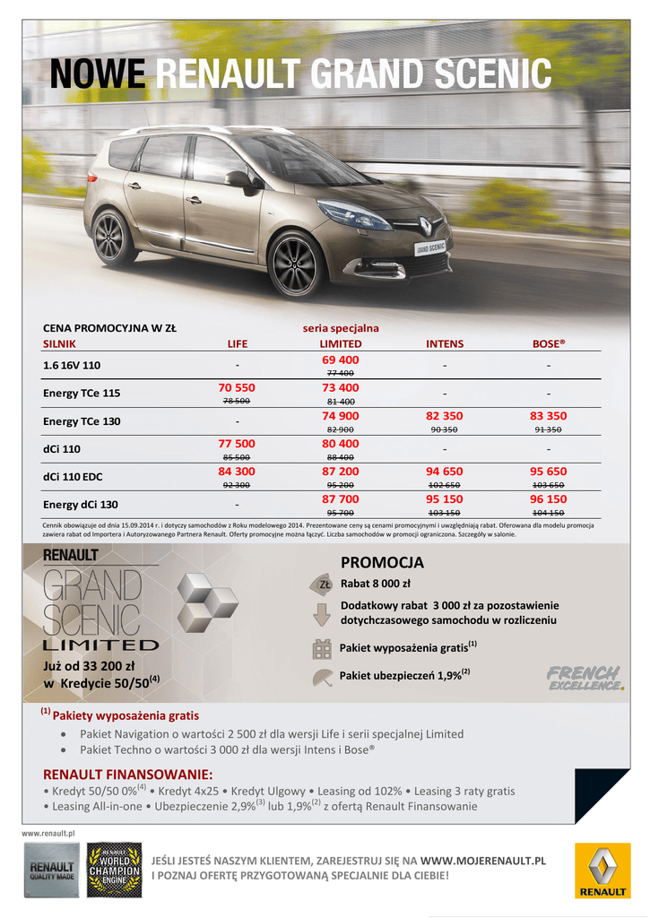 CENA PROMOCYJNA W ZŁ SILNIK LIFE seria specjalna LIMITED INTENS BOSE® - 69 400 - - 70 550 73 400 78 500 81 400 - - - 74 900 82 350 83 350 82 900 90 350 91 350 dCi 110 77 500 80 400 85 500 88 400 - - dCi 110 EDC 84 300 87 200 94 650 95 650 92 300 95 200 102 650 103 650 87 700 95 150 96 150 95 700 103 150 104 150 1.6 16V 110 Energy TCe 115 Energy TCe 130 - Energy dCi 130 77 400 Cennik obowiązuje od dnia 15.09.2014 r. i dotyczy samochodów z Roku modelowego 2014. Prezentowane ceny są cenami promocyjnymi i uwzględniają rabat. Oferowana dla modelu promocja zawiera rabat od Importera i Autoryzowanego Partnera Renault. Oferty promocyjne można łączyć. Liczba samochodów w promocji ograniczona. Szczegóły w salonie. PROMOCJA Rabat 8 000 zł Dodatkowy rabat 3 000 zł za pozostawienie dotychczasowego samochodu w rozliczeniu Pakiet wyposażenia gratis(1) Już od 33 200 zł w Kredycie 50/50(4) (1) Pakiet ubezpieczeń 1,9%(2) Pakiety wyposażenia gratis Pakiet Navigation o wartości 2 500 zł dla wersji Life i serii specjalnej Limited Pakiet Techno o wartości 3 000 zł dla wersji Intens i Bose® RENAULT FINANSOWANIE: • Kredyt 50/50 0%(4) • Kredyt 4x25 • Kredyt Ulgowy • Leasing od 102% • Leasing 3 raty gratis • Leasing All-in-one • Ubezpieczenie 2,9%(3) lub 1,9%(2) z ofertą Renault Finansowanie JEŚLI JESTEŚ NASZYM KLIENTEM, ZAREJESTRUJ SIĘ NA WWW.MOJERENAULT.PL I POZNAJ OFERTĘ PRZYGOTOWANĄ SPECJALNIE DLA CIEBIE! 1.6 16V 110 69 400 zł Energy TCe 115 73 400 zł Energy TCe 130 74 900 zł dCi 110 80 400 zł dCi 110 EDC 87 200 zł Energy dCi 130 87 700 zł Ceny uwzględniające rabat GŁÓWNE WYPOSAŻENIE SERII SPECJALNEJ LIMITED Klimatyzacja automatyczna, dwustrefowa Wycieraczki przedniej szyby o zmiennej częstotliwości pracy, z czujnikiem deszczu Przesuwana, środkowa konsola z podłokietnikiem Automatyczny hamulec postojowy Szyby przednie i tylne elektrycznie podnoszone Lusterka boczne elektrycznie sterowane i składane System wspomagania parkowania tyłem Szyby tylne przyciemniane Relingi dachowe Obręcze kół ze stopu metali lekkich 16’’ Specyficzne elementy designu zewnętrznego i wewnętrznego WYPOSAŻENIE Life seria specjalna LIMITED Intens Bose® ABS z s ys teme m ws poma ga ni a na głe go ha mowa ni a (AFU) ● ● ● ● Sys tem dyna mi czne j kontrol i toru ja zdy (ESC) ● ● ● ● Sys tem ws poma ga ni a przy rus za ni u pod górę (HSA) ● ● ● ● ● (5) ● (5) ● (5) ● (5) BEZPIECZEŃSTWO CZYNNE I BIERNE Sys tem kontrol i ci ś ni e ni a w opona ch Vi s i o Sys tem® - - GRATIS GRATIS Re gul a tor-ogra ni czni k prędkoś ci ● ● ● ● Automa tyczni e włącza ne ś wi a tła a wa ryjne w przypa dku gwa łtowne go ha mowa ni a ● ● ● ● Czołowe podus zki powi e trzne ki e rowcy i pa s a że ra dos tos owujące s i ę do s i ły zde rze ni a ● ● ● ● Możl i woś ć ręczne j de za ktywa cji podus zki powi e trzne j pa s a że ra z przodu ● ● ● ● Boczne podus zki powi e trzne chroni ące kl a tkę pi e rs i ową i mi e dni cę os ób s i e dzących na prze dni ch mi e js ca ch ● ● ● ● Podus zki kurtynowe ● ● ● ● ● ● ● ● ● ● ● ● 3-punktowe pa s y be zpi e cze ńs twa w 2. i 3.rzędzi e ● ● ● ● Za główki na prze dni ch mi e js ca ch, w 2. i 3.rzędzi e ● ● ● ● 5 za główków typu Re l a x - - P P Sys tem mocowa ni a fotel i ka dl a dzi e cka Is ofi x na 3 fotel a ch w 2.rzędzi e ● ● ● ● El e ktryczne , zmi e nne ws poma ga ni e ukła du ki e rowni cze go ● ● ● ● Ręczny ha mul e c pos tojowy ● - - - Automa tyczny ha mul e c pos tojowy, e l e ktrome cha ni czny De s ka rozdzi e l cza z kol orowym, wi e l ofunkcyjnym e kra ne m LCD wykona nym w technol ogi i TFT, z możl i woś ci ą i ndywi dua l nych us ta wi e ń Komputer pokła dowy P ● ● ● ● ● ● ● ● ● ● ● Ka rta Re na ul t ze zda l nym s terowa ni e m ce ntra l ne go za mka drzwi ● ● - - Ka rta Re na ul t Ha nds Fre e - 1 060 ● ● Sys tem ws poma ga ni a pa rkowa ni a tyłe m - ● ● ● Sys tem ws poma ga ni a pa rkowa ni a przode m i tyłe m P - - - Sys tem ws poma ga ni a pa rkowa ni a przode m i tyłe m z ka me rą cofa ni a - - GRATIS GRATIS Świ a tła prze ci wmgłowe ● ● ● ● Świ a tła do ja zdy dzi e nne j LED ● ● ● ● Re fl e ktory bi -ks e nonowe - - P P Sprys ki wa cze re fl e ktorów - - P P Funkcja oś wi e tl e ni a drogi do domu ● ● ● ● Wyci e ra czki prze dni e j s zyby o zmi e nne j częs totl i woś ci pra cy, z czujni ki e m de s zczu P ● ● ● Lus terko we wnętrzne o 2 położe ni a ch (dzi e ń/noc) ● ● - - El e ktrochroma tyczne l us terko we wnętrzne - - ● ● Podś wi e tl a ne l us terka w os łona ch prze ci ws łone cznych Ce ntra l ne l us terko umożl i wi a jące konta kt wzrokowy z dzi e ćmi s i e dzącymi na tyl nych mi e js ca ch La mpki do czyta ni a dl a ki e rowcy i pa s a że ra z przodu - - ● ● P (6) P P ● ● La mpki do czyta ni a w 2. i 3.rzędzi e P P ● ● Sygna l i za cja dźwi ękowa i wi zua l na ni e za pi ęci a pa s a be zpi e cze ńs twa ki e rowcy i pa s a że ra z przodu 3-punktowe pa s y be zpi e cze ńs twa , z ogra ni czni ka mi na pi ęci a i na pi na cza mi dos tos owującymi s i ę do zi ły zda rze ni a , na prze dni ch mi e js ca ch PROWADZENIE POJAZDU - URZĄDZENIA KONTROLNE WIDOCZNOŚĆ – OŚWIETLENIE P ● (6) ● (6) KOMFORT Kl i ma tyza cja ma nua l na ● - - - Kl i ma tyza cja a utoma tyczna , dwus tre fowa , z bocznymi na wi e wa mi w 2.rzędzi e P ● ● ● El e ktryczni e s terowa ne , s kła da ne ręczni e i podgrze wa ne l us terka boczne ● - - - El e ktryczni e s terowa ne i s kła da ne ora z podgrze wa ne l us terka boczne P ● ● ● El e ktryczni e podnos zone s zyby prze dni e i tyl ne ● ● ● ● Ki e rowni ca z re gul a cją wys okoś ci i głębokoś ci , pokryta s kórą ● ● ● ● Ża l uzje prze ci ws łone czne na bo