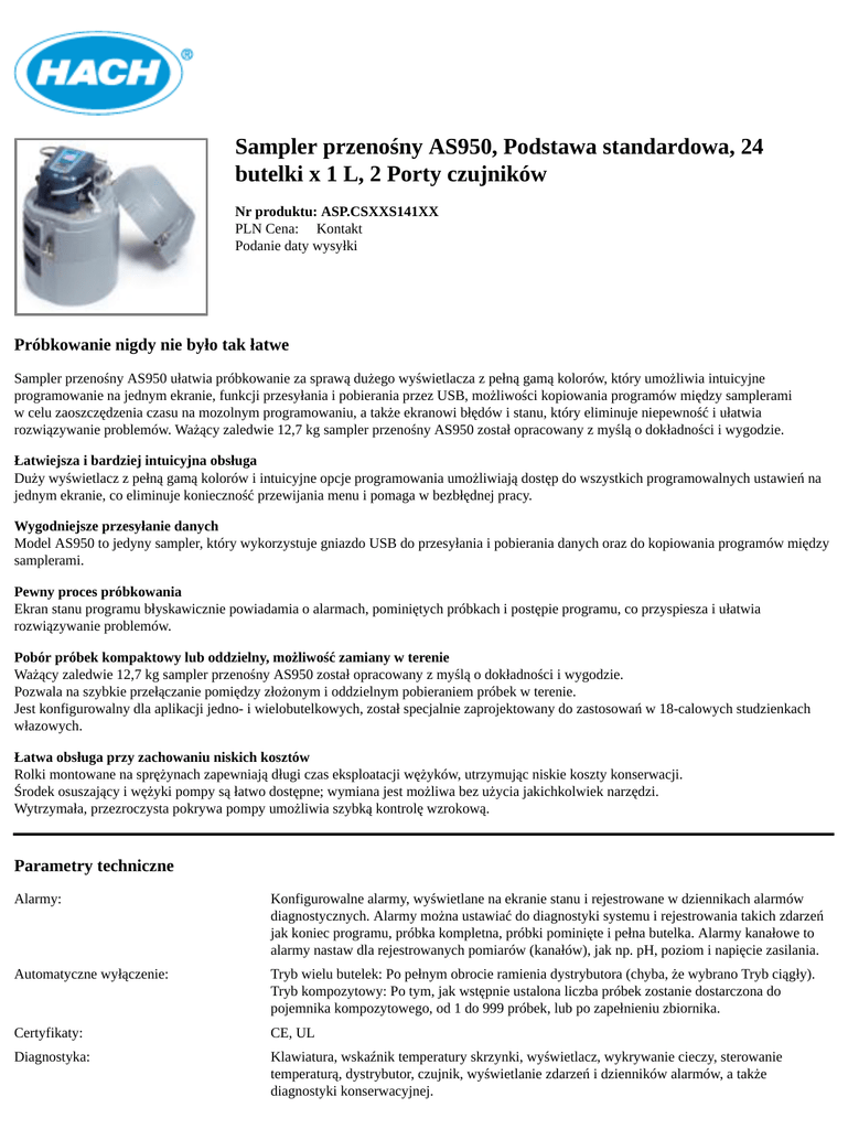 Sampler przenośny AS950, Podstawa standardowa, 24 butelki x 1 L, 2 Porty czujników Nr produktu: ASP.CSXXS141XX PLN Cena: Kontakt Podanie daty wysyłki Próbkowanie nigdy nie było tak łatwe Sampler przenośny AS950 ułatwia próbkowanie za sprawą dużego wyświetlacza z pełną gamą kolorów, który umożliwia intuicyjne programowanie na jednym ekranie, funkcji przesyłania i pobierania przez USB, możliwości kopiowania programów między samplerami w celu zaoszczędzenia czasu na mozolnym programowaniu, a także ekranowi błędów i stanu, który eliminuje niepewność i ułatwia rozwiązywanie problemów. Ważący zaledwie 12,7 kg sampler przenośny AS950 został opracowany z myślą o dokładności i wygodzie. Łatwiejsza i bardziej intuicyjna obsługa Duży wyświetlacz z pełną gamą kolorów i intuicyjne opcje programowania umożliwiają dostęp do wszystkich programowalnych ustawień na jednym ekranie, co eliminuje konieczność przewijania menu i pomaga w bezbłędnej pracy. Wygodniejsze przesyłanie danych Model AS950 to jedyny sampler, który wykorzystuje gniazdo USB do przesyłania i pobierania danych oraz do kopiowania programów między samplerami. Pewny proces próbkowania Ekran stanu programu błyskawicznie powiadamia o alarmach, pominiętych próbkach i postępie programu, co przyspiesza i ułatwia rozwiązywanie problemów. Pobór próbek kompaktowy lub oddzielny, możliwość zamiany w terenie Ważący zaledwie 12,7 kg sampler przenośny AS950 został opracowany z myślą o dokładności i wygodzie. Pozwala na szybkie przełączanie pomiędzy złożonym i oddzielnym pobieraniem próbek w terenie. Jest konfigurowalny dla aplikacji jedno- i wielobutelkowych, został specjalnie zaprojektowany do zastosowań w 18-calowych studzienkach włazowych. Łatwa obsługa przy zachowaniu niskich kosztów Rolki montowane na sprężynach zapewniają długi czas eksploatacji wężyków, utrzymując niskie koszty konserwacji. Środek osuszający i wężyki pompy są łatwo dostępne; wymiana jest możliwa bez użycia jakichkolwiek narzędzi. Wytrzymała, przezroczysta pokrywa pompy umożliwia szybką kontrolę wzrokową. Parametry techniczne Alarmy: Konfigurowalne alarmy, wyświetlane na ekranie stanu i rejestrowane w dziennikach alarmów diagnostycznych. Alarmy można ustawiać do diagnostyki systemu i rejestrowania takich zdarzeń jak koniec programu, próbka kompletna, próbki pominięte i pełna butelka. Alarmy kanałowe to alarmy nastaw dla rejestrowanych pomiarów (kanałów), jak np. pH, poziom i napięcie zasilania. Automatyczne wyłączenie: Tryb wielu butelek: Po pełnym obrocie ramienia dystrybutora (chyba, że wybrano Tryb ciągły). Tryb kompozytowy: Po tym, jak wstępnie ustalona liczba próbek zostanie dostarczona do pojemnika kompozytowego, od 1 do 999 próbek, lub po zapełnieniu zbiornika. Certyfikaty: CE, UL Diagnostyka: Klawiatura, wskaźnik temperatury skrzynki, wyświetlacz, wykrywanie cieczy, sterowanie temperaturą, dystrybutor, czujnik, wyświetlanie zdarzeń i dzienników alarmów, a także diagnostyki konserwacyjnej. Dokładność objętości: Typowa: ±5% próbki o objętości 200 mL: wysokość zasysania 4,6 m, przewód doprowadzający winylowy 3/8 cala 4,9 m, pojedyncza butelka, system wyłącznika pełnej butelki w temperaturze pokojowej i 1524 m nad poziomem morza. Dopływ: Filtry siatkowe: materiał do wyboru z PTFEu i ze stali nierdzewnej 316, lub wszystkie ze stali nierdzewnej 316 w standardowych wymiarach, duża prędkość i niski profil do aplikacji przy małych głębokościach. Czyszczenie: przedmuchiwanie powietrzem przed i po każdej próbce; automatyczna kompensacja czasu trwania dla przewodów doprowadzających o różnej długości. Przepłukiwanie: Przewód doprowadzający jest automatycznie płukany badaną cieczą przed każdą próbką, od 1 do 3 płukań. Powtórzenia i usterki: Cykl pobierania próbek jest automatycznie powtarzany od 1 do 3 razy, jeśli próbka nie została pobrana podczas pierwszej próby. Ekran stanu: Komunikuje, który program jest uruchomiony, czy zarejestrowano pominięte próbki, kiedy zostanie pobrana następna próbka, jak wiele próbek pozostało do pobrania, liczbę zarejestrowanych kanałów, czas ostatniego pomiaru, dostępność wolnej pamięci, liczbę aktywnych kanałów, czy zostały uaktywnione alarmy, kiedy zostały wyzwolone uaktywnione alarmy, aktywne czujniki i temperaturę szafy Funkcja zabezpieczenia wyświetlacza: Kod dostępu zapobiega nieuprawnionemu dostępowi Interfejs użytkownika: Klawiatura z przełącznikami membranowymi z dwoma wielofunkcyjnymi przyciskami programowymi Interwał rejestracji: Ustawialny w krokach co jeden impuls w zakresie od 1 do 9999 impulsów przepływu, lub w krokach co jedną minutę w zakresie od 1 do 9999 minut. Języki: Chiński, angielski, francuski, niemiecki, włoski, hiszpański, portugalski Języki interfejsu użytkownika: Chiński, angielski, francuski, niemiecki, włoski, hiszpański, portugalski Konfiguracje butelek: 24 x 1 L Materiał obudowy: Odporne na uderzenia tworzywo sztuczne ABS, 3-częściowa konstrukcja, dwuścienna podstawa z 2,54 cm izolacją, bezpośredni kontakt lodu z butelkami (sampler). Objętość próbki: Programowalna w krokach co 10 mL od 10 do 10000 mL. Opcje komunikacji: USB oraz opcjonalnie RS485 (Modbus) Opcje wbudowane fabrycznie: Aby uzyskać więcej szczegółowych informacji, należy skontaktować się z lokalnym przedstawicielem firmy Hach. Pamięć: Historia próbkowania: 4000 zapisów; Dziennik danych: 325,000 zapisów; Dziennik zdarzeń: 2000 zapisów Pompa: Pompa perystaltyczna wysokiej prędkości, z dwoma rolkami, z wężykiem o wymiarach 0,95 cm śr. wewn. x 0,16 cm śr. zewn. (3/8-cala śr. wewn. x 5/8-cala śr. zewn.), obudowa pompy IP37, pokrywa poliwęglanowa. Port czujnika: 2 Powtarzalność objętości próbki: Typowy: ±5% dla próbki o objętości 200 mL: wysokość zasysania 4,6 m, wąż doprowadzający w