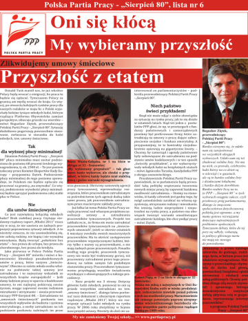 Polska Partia Pracy - „Sierpień 80”, lista nr 6 Oni się kłócą My wybieramy przyszłość Zlikwidujemy umowy śmieciowe Przyszłość z etatem Donald Tusk mamił nas, że już wkrótce Polacy będą wracać z emigracji, bo praca tu będzie się opłacać. Tymczasem Polacy za granicą ani myślą wracać do kraju. Co więcej, po otwarciu kolejnych rynków pracy dla naszych rodaków w maju br. z Polski wyjechały kolejne tysiące młodych ludzi, którym rządząca Platforma Obywatelska zamiast perspektyw, obiecuje gruszki na wierzbie – mówi Bogusław Ziętek, przewodniczący Polskiej Partii Pracy - „Sierpień 80”. Sytuację dodatkowo pogarszają powszechnie stosowane, zwłaszcza w stosunku do ludzi młodych, tzw. umowy śmieciowe. interesował on parlamentarzystów – podkreśla przewodniczący Polskiej Partii Pracy -„Sierpień 80”. Niech państwo świeci przykładem! Tak dla wyższej płacy minimalnej! Zdaniem Polskiej Partii Pracy - „Sierpień 80” płaca minimalna musi zostać podniesiona do poziomu 68 procent średniego wynagrodzenia, tj. ok. 2300 zł. – To jest poziom zalecany przez Komitet Ekspertów Rady Europy – przypomina Ziętek. Podniesienie płacy minimalnej do tego poziomu spowoduje, że Polakom nie będzie opłacało się pracować za granicą „na zmywaku”. Co więcej, podniesienie wysokości płacy minimalnej będzie sprzyjać podniesieniu całej siatki płac w Polsce. Nie dla umów śmieciowych! Co jest największą bolączką młodych ludzi? Brak stabilnej pracy. Czytając niedawny rządowy raport „Młodzi 2011” rzuca się w oczy, że nie zawiera on żadnych propozycji poprawienia sytuacji młodych. A to niestety oznacza, że nie usamodzielnią się, nie założą rodziny, nie kupią i nie wynajmą mieszkania. Będą tworzyć „pokolenie bez etatu” – bez prawa do urlopu, bez prawa do chorobowego, bez prawa do kredytu. Jako pierwsza w Polsce Polska Partia Pracy - „Sierpień 80” mówiła i mówi o konieczności likwidacji pozakodeksowych umów o pracę, które nazywa „śmieciowymi”. Obecnie co szósta młoda osoba właśnie na podstawie takiej umowy jest zatrudniana i to najwyższy wskaźnik ze wszystkich krajów europejskich! – Jeśli damy ludziom pracę w oparciu o kodeksowe umowy, to oni najlepiej pokierują swoim życiem, mogąc zapewnić swoim rodzinom mieszkanie i utrzymanie – uważa przewodniczący PPP-Sierpień 80. – Zatrudnianie na „umowach śmieciowych” pozbawia nas wszystkich wpływów do budżetu i systemu emerytalnego, a osoby zatrudniane na ich podstawie pozbawia należnych im praw Beata Wajda-Gałązka, nr 1 na liście w okręgu nr 32 - Sosnowiec: „My wybieramy przyszłość" – tak głosi nasze hasło wyborcze, ale chodzi o przyszłość, w której każdy będzie miał stabilną pracę i godne warunki wynagradzania. oraz gwarancji. Ukrócimy samowolę agencji pracy tymczasowej, wprowadzając rozwiązania, które pracownikom zatrudnianym za pośrednictwem tych agencji dadzą takie same prawa, jak pracownikom zatrudnianym przez macierzyste zakłady pracy. Już kilka lat temu Polska Partia Pracy zaczęła pracować nad własnym projektem nowelizacji ustawy o zatrudnianiu pracowników tymczasowych. Projekt ten zakłada m.in., że firma nie może zatrudniać pracowników tymczasowych na „śmieciowych umowach”, jeżeli w okresie ostatnich 6 miesięcy zwolniła swoich macierzystych pracowników. Ma to ukrócić zastępowanie pracowników wypożyczonymi ludźmi, którzy tylko z nazwy są pracownikami, a nie mają żadnych praw pracowniczych. Ponadto według tego projekt, pracownik tymczasowy nie może być traktowany gorzej, niż pracownicy zatrudnieni przez tego pracodawcę na takim samym lub podobnym stanowisku pracy. Pracownikowi tymczasowemu przysługują wszelkie świadczenia wynikające z obowiązujących u takiego pracodawcy. – Nasz projekt ma 3 strony. Dotyczy głównie ludzi młodych, ponieważ to oni są przede wszystkim zatrudniani na tzw. „umowy śmieciowe”, dlatego łatwo porównać nasz dokument z obszernym raportem rządowym „Młodzi 2011”, który nie rozwiązuje sytuacji ludzi młodych na rynku pracy. W 2006 roku złożyliśmy w Sejmie nasz projekt ustawy. Niestety do dziś nie za- Rząd nie może zdjąć z siebie obowiązku za sytuację na rynku pracy, jak to się działo w ostatnich latach. Stąd też jeden z postulatów PPP głosi, że np. w przetargach z funduszy państwowych i samorządowych powinny być preferowane firmy, które zatrudniają na umowy o pracę dające zabezpieczenie socjalne i fundusz emerytalny. A przypomnijmy, że te kontrakty niejednokrotnie opiewają na gigantyczne kwoty. – Chcemy, by samorząd i agendy państwowe były zobowiązane do zatrudniania na podstawie umów kodeksowych i w ten sposób „świeciły przykładem”, a nie wykorzystywały młodych ludzi na bezpłatnych stażach – mówi Agnieszka Taraska, kandydatka PPP z okręgu sosnowieckiego. Przedstawiciele Polskiej Partii Pracy zapowiedzieli, że w parlamencie będą prowadzić taką politykę wspierania tworzenia nowych miejsc pracy, by zapewnić każdemu możliwość zatrudnienia. – Stoimy na stanowisku, iż każdy człowiek jest godny tego, by mógł samodzielnie zarabiać na własną egzystencję, utrzymanie rodziny i mieszkania. Nie istnieją ludzie nieprzydatni i niepotrzebni na rynku pracy, a państwo ma obowiązek tworzyć warunki umożliwiające zatrudnienie każdego, kto chce podjąć pracę – mówi Ziętek. Robert Piąty, nr 2 na liście w okręgu nr 32 Sosnowiec: Polska ma jedną z najwyższych w Unii Europejskiej liczbę osób w wieku produkcyjnym. Jednocześnie niewiele ponad połowa z nich ma możliwości pracy. Marnotrawienie tak cennego potencjału poprzez utrzymywanie wielomilionowego bezrobocia obciąża wszystkie partie polityczne rządzące Polską po 1989 roku. My nie zamkniemy Twojej szkoły... >> www.partiapracy.pl Bogusław Ziętek, przewodniczący Polskiej P