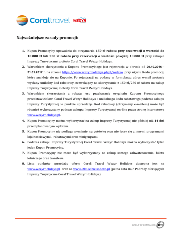 Najważniejsze zasady promocji: 1. Kupon Promocyjny upoważnia do otrzymania 150 zł rabatu przy rezerwacji o wartości do 10 000 zł lub 250 zł rabatu przy rezerwacji o wartości powyżej 10 000 zł przy zakupie Imprezy Turystycznej z oferty Coral Travel Wezyr Holidays. 2. Warunkiem skorzystania z Kuponu Promocyjnego jest rejestracja w okresie od 20.10.2016 – 31.01.2017 r. na stronie https://www.wezyrholidays.pl/pl/sodexo przy użyciu Kodu promocji, który znajduje się na Kuponie. Po rejestracji na podany w formularzu adres e-mail zostanie wysłany unikalny kod rabatowy, zezwalający na skorzystanie z 150 zł/250 zł rabatu na zakup Imprezy Turystycznej z oferty Coral Travel Wezyr Holidays. 3. Warunkiem skorzystania z rabatu jest przekazanie oryginału Kuponu Promocyjnego przedstawicielowi Coral Travel Wezyr Holidays i unikalnego kodu rabatowego podczas zakupu Imprezy Turystycznej w punkcie sprzedaży. Kod rabatowy (otrzymany e-mailem) może być również wykorzystany podczas zakupu Imprezy Turystycznej on-line przez stronę internetową www.wezyrholidays.pl. 4. Kupon Promocyjny można wykorzystać na zakup Imprezy Turystycznej nie później niż 14 dni przed planowanym wylotem. 5. Kupon Promocyjny nie podlega wymianie na gotówkę oraz nie łączy się z innymi programami lojalnościowymi , rabatowymi oraz minigrupami. 6. Podczas zakupu Imprezy Turystycznej Coral Travel Wezyr Holidays można wykorzystać tylko jeden Kupon Promocyjny. 7. Kupon Promocyjny nie może być wykorzystany na zakup samego zakwaterowania, biletu lotniczego oraz transferu. 8. Lista punktów sprzedaży oferty Coral Travel Wezyr Holidays dostępna jest na www.wezyrholidays.pl oraz na www.DlaCiebie.sodexo.pl (pełna lista Biur Podróży oferujących Imprezy Turystyczne Coral Travel Wezyr Holidays)