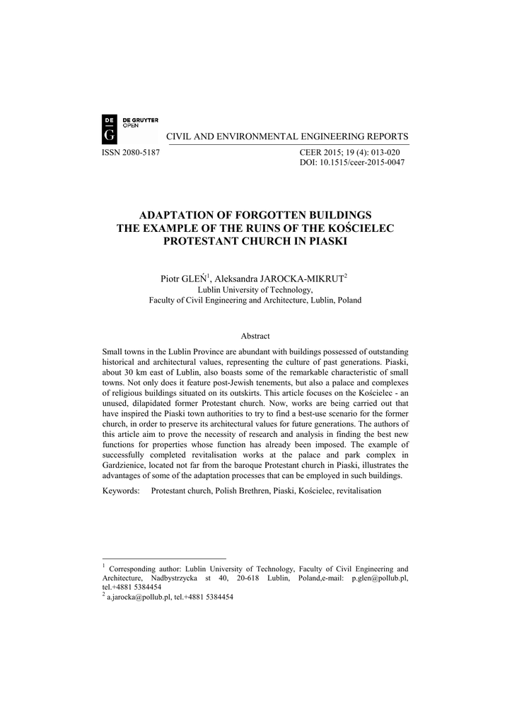 CIVIL AND ENVIRONMENTAL ENGINEERING REPORTS ISSN 2080-5187 CEER 2015; 19 (4): 013-020 DOI: 10.1515/ceer-2015-0047 ADAPTATION OF FORGOTTEN BUILDINGS THE EXAMPLE OF THE RUINS OF THE KOŚCIELEC PROTESTANT CHURCH IN PIASKI Piotr GLEŃ1, Aleksandra JAROCKA-MIKRUT2 Lublin University of Technology, Faculty of Civil Engineering and Architecture, Lublin, Poland Abstract Small towns in the Lublin Province are abundant with buildings possessed of outstanding historical and architectural values, representing the culture of past generations. Piaski, about 30 km east of Lublin, also boasts some of the remarkable characteristic of small towns. Not only does it feature post-Jewish tenements, but also a palace and complexes of religious buildings situated on its outskirts. This article focuses on the Kościelec - an unused, dilapidated former Protestant church. Now, works are being carried out that have inspired the Piaski town authorities to try to find a best-use scenario for the former church, in order to preserve its architectural values for future generations. The authors of this article aim to prove the necessity of research and analysis in finding the best new functions for properties whose function has already been imposed. The example of successfully completed revitalisation works at the palace and park complex in Gardzienice, located not far from the baroque Protestant church in Piaski, illustrates the advantages of some of the adaptation processes that can be employed in such buildings. Keywords: 1 Protestant church, Polish Brethren, Piaski, Kościelec, revitalisation Corresponding author: Lublin University of Technology, Faculty of Civil Engineering and Architecture, Nadbystrzycka st 40, 20-618 Lublin, Poland,e-mail: [email protected], tel.+4881 5384454 2 [email protected], tel.+4881 5384454 14 Piotr GLEŃ, Aleksandra JAROCKA-MIKRUT 1. INTRODUCTION Architecture has surrounded us for centuries. Inevitably, this is partly because over time, buildings appear around us whose best days are long past. This is closely related to how well they have been maintained, as well as what their original purpose was. The authors of this article intend to present such buildings’ as they stand in the present. In the examples used in this paper, both from Poland and abroad, they will present successful attempts to introduce new functionalities to buildings whose original function was completely different. Over the centuries, religion has had a huge influence on the architecture of the world. Sacral architecture is not only about Christian churches, but also the great buildings and monuments in Egypt and Greece that were erected in the name of faith in gods. Some of the greatest architectural wonders were built for this reason, and it triggered the development of architectural styles and the building of ever-larger and richer temples. Competition to create the worthiest temples that could truly be called a House of God, further shaped architectural forms and promoted certain architectural novelties [3]. It is hard to imagine now any city without even one such glorious temple. Despite a general weakening of faith, the number of places for people to gather in its name is huge. In today’s era of civilizational progress, the number of lay buildings deprived of their original function is also rising significantly. These include old industrial buildings, office buildings, as well as small buildings which were either never finished, or that have been abandoned without re-purposing. The reasons for this are many and varied. So, instead of mass-producing new buildings, attention should instead be paid to adapting existing ones, often abandoned, yet sometimes having extraordinary potential. 2. A NEED FOR A NEW FUNCTION Often, the need for new functionality in a building becomes a driving force for further development of the existing architecture. Historic buildings are frequently given modern features, without compromising the historic tissue forming their character and uniqueness. One prime example from overseas of the transformation of a building’s original sacral function to another is the Lumen United Reformed Church & Community Centre URC in London, England (Fig. 1), designed by Theis and Khan Architects [4]. This religious building was adapted to become a place for leisure, a coffee shop. The introduction of the profanum to the sacrum could, at first, be shocking, but with time gives an impression of integral unity. The uniqueness and monumentality that accompanies religious architecture with ADAPTATION OF FORGOTTEN BUILDINGS. THE EXAMPLE OF THE RUINS OF THE KOŚCIELEC PROTESTANT CHURCH IN PIASKI 15 new features complementing and penetrating the existing features, gives additional value to their perception. In this case, this was made possible by addressing a larger, more diverse audience than just member of the church. Adapting the 20th-century church building to the needs of the local community gave it a certain neutrality, significantly changing the perception of its architecture and new functions [4]. Fig. 1. The Lumen United Reformed Church & Community Centre URC in London (author’s photo) Here in Poland, a hint of this kind of adaptation can be seen in the Alfa Shopping Center, at the intersection of A. Mickiewicz and Świętojańska streets in the northeastern city of Białystok. The conversion work done to the area and 19th century buildings of the old Becker factory now distinguishes this shopping centre from hundreds of others (Fig. 2), with historic elements of the former factory preserved and re-used in the new design. This combination of historic buildings with modern materials, so often encountered in many newlyadapted shopping centres, tends to be interesting and successful. The Alfa is an example of respect for an existing, historic structure that forms part of the character of the city. Fig. 2. Alfa Centrum Białystok (author’s photo) 16 Piotr GLEŃ, Aleksandra JAROCKA-MIKRUT Following the 
