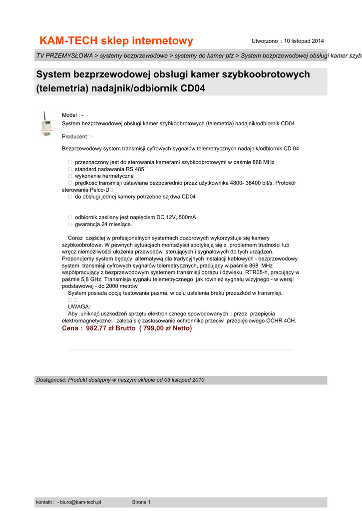 KAM-TECH sklep internetowy Utworzono : 10 listopad 2014 TV PRZEMYSŁOWA > systemy bezprzewodowe > systemy do kamer ptz > System bezprzewodowej obsługi kamer szybk System bezprzewodowej obsługi kamer szybkoobrotowych (telemetria) nadajnik/odbiornik CD04 Model : System bezprzewodowej obsługi kamer szybkoobrotowych (telemetria) nadajnik/odbiornik CD04 Producent : Bezprzewodowy system transmisji cyfrowych sygnałów telemetrycznych nadajnik/odbiornik CD 04 � przeznaczony jest do sterowania kamerami szybkoobrotowymi w paśmie 868 MHz � standard nadawania RS 485 � wykonanie hermetyczne � prędkość transmisji ustawiana bezpośrednio przez użytkownika 4800- 38400 bit/s. Protokół sterowania Pelco-D� � do obsługi jednej kamery potrzebne są dwa CD04 � odbiornik zasilany jest napięciem DC 12V, 500mA � gwarancja 24 miesiące. Coraz częściej w profesjonalnych systemach dozorowych wykorzystuje się kamery szybkoobrotowe. W pewnych sytuacjach montażyści spotykają się z problemem trudności lub wręcz niemożliwości ułożenia przewodów sterujących i sygnałowych do tych urządzeń. Proponujemy system będący alternatywą dla tradycyjnych instalacji kablowych - bezprzewodowy system transmisji cyfrowych sygnałów telemetrycznych, pracujący w paśmie 868 MHz współpracujący z bezprzewodowym systemem transmisji obrazu i dźwięku RTR05-h, pracujący w paśmie 5,8 GHz. Transmisja sygnału telemetrycznego jak również sygnału wizyjnego - w wersji podstawowej - do 2000 metrów System posiada opcję testowania pasma, w celu ustalenia braku przeszkód w transmisji. �� UWAGA: Aby uniknąć uszkodzeń sprzętu elektronicznego spowodowanych�przez przepięcia elektromagnetyczne�zaleca się zastosowanie ochronnika przeciw przepięciowego OCHR 4CH. Cena : 982,77 zł Brutto ( 799,00 zł Netto) Dostępność: Produkt dostępny w naszym sklepie od 03 listopad 2010 kontakt : - [email protected] Strona 1
