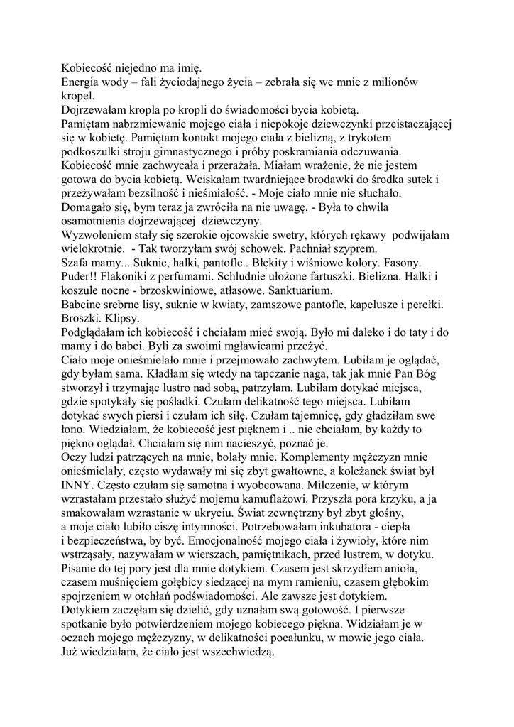 Kobiecość niejedno ma imię. Energia wody – fali życiodajnego życia – zebrała się we mnie z milionów kropel. Dojrzewałam kropla po kropli do świadomości bycia kobietą. Pamiętam nabrzmiewanie mojego ciała i niepokoje dziewczynki przeistaczającej się w kobietę. Pamiętam kontakt mojego ciała z bielizną, z trykotem podkoszulki stroju gimnastycznego i próby poskramiania odczuwania. Kobiecość mnie zachwycała i przerażała. Miałam wrażenie, że nie jestem gotowa do bycia kobietą. Wciskałam twardniejące brodawki do środka sutek i przeżywałam bezsilność i nieśmiałość. - Moje ciało mnie nie słuchało. Domagało się, bym teraz ja zwróciła na nie uwagę. - Była to chwila osamotnienia dojrzewającej dziewczyny. Wyzwoleniem stały się szerokie ojcowskie swetry, których rękawy podwijałam wielokrotnie. - Tak tworzyłam swój schowek. Pachniał szyprem. Szafa mamy... Suknie, halki, pantofle.. Błękity i wiśniowe kolory. Fasony. Puder!! Flakoniki z perfumami. Schludnie ułożone fartuszki. Bielizna. Halki i koszule nocne - brzoskwiniowe, atłasowe. Sanktuarium. Babcine srebrne lisy, suknie w kwiaty, zamszowe pantofle, kapelusze i perełki. Broszki. Klipsy. Podglądałam ich kobiecość i chciałam mieć swoją. Było mi daleko i do taty i do mamy i do babci. Byli za swoimi mgławicami przeżyć. Ciało moje onieśmielało mnie i przejmowało zachwytem. Lubiłam je oglądać, gdy byłam sama. Kładłam się wtedy na tapczanie naga, tak jak mnie Pan Bóg stworzył i trzymając lustro nad sobą, patrzyłam. Lubiłam dotykać miejsca, gdzie spotykały się pośladki. Czułam delikatność tego miejsca. Lubiłam dotykać swych piersi i czułam ich siłę. Czułam tajemnicę, gdy gładziłam swe łono. Wiedziałam, że kobiecość jest pięknem i .. nie chciałam, by każdy to piękno oglądał. Chciałam się nim nacieszyć, poznać je. Oczy ludzi patrzących na mnie, bolały mnie. Komplementy mężczyzn mnie onieśmielały, często wydawały mi się zbyt gwałtowne, a koleżanek świat był INNY. Często czułam się samotna i wyobcowana. Milczenie, w którym wzrastałam przestało służyć mojemu kamuflażowi. Przyszła pora krzyku, a ja smakowałam wzrastanie w ukryciu. Świat zewnętrzny był zbyt głośny, a moje ciało lubiło ciszę intymności. Potrzebowałam inkubatora - ciepła i bezpieczeństwa, by być. Emocjonalność mojego ciała i żywioły, które nim wstrząsały, nazywałam w wierszach, pamiętnikach, przed lustrem, w dotyku. Pisanie do tej pory jest dla mnie dotykiem. Czasem jest skrzydłem anioła, czasem muśnięciem gołębicy siedzącej na mym ramieniu, czasem głębokim spojrzeniem w otchłań podświadomości. Ale zawsze jest dotykiem. Dotykiem zaczęłam się dzielić, gdy uznałam swą gotowość. I pierwsze spotkanie było potwierdzeniem mojego kobiecego piękna. Widziałam je w oczach mojego mężczyzny, w delikatności pocałunku, w mowie jego ciała. Już wiedziałam, że ciało jest wszechwiedzą. Gdy przyszedł czas na oddech, wiedziałam, że jestem odrębna, choć jeszcze nie umiałam z tego korzystać. Potrzeba mi było doświadczeń, by z ziemskości człowieczeństwa przeobrazić się w niebiańskość kobiety, spotykającej się z ogniem ziemi – mężczyzną. Spotkanie z innością mężczyzny otwierało moje trzecie oko, a fale, płynące od wibracji spotkania we dwoje odkrywały we mnie Rajski Ogród. Owocowałam radością przeżywania we dwoje i tak też uczyłam się kobiecości. Kobiecości we mnie. Mój ziemski ogród – ten za domem – uczył mnie ciszy, rozkwitania, owocowania, zbierania, a jego płody przynosiły mi karmę i umiejętność jej doskonalenia. Ziemia zawsze była mi pomocna do odnajdywania swej odrębności. Koiła mnie, gdy na niej się kładłam i przytulałam, jak do prapoczątku istnienia. Często była mi ojcem i matką, powiernicą i pocieszycielem. Jej nauka uczyła mnie siebie. Istoty jeszcze jednej z wielu. Wiedza mojego ciała otwierała mnie na smakowanie duszy mojej, a tam byłam przestrzenią, siłą i mocą tworzenia - we współpracy z Bogiem i mężczyzną, którego kochałam wzajemnie. Brzuch... Jego owocowanie dodawało mi siły i świadomości. Kwitłam w macierzyństwie, przeżywając kolejne dojrzewanie kobiecości. Jego bujność wydała na świat córki. Jedna jest jak wielokrotność niezapominajki, druga, jak soczystość brzoskwini. Takie też są ich kolory aury. Nasze spotkania uczyły nas relacji kobiecości, służyły przypomnieniu macierzyństwa mojej mamy, mojego dziecięctwa, dojrzewania. Czas biegł złotą linią energii życia i nic już nie było takie same. I wtedy uświadomiłam sobie, że życie jest ciągłym dojrzewaniem. Jest jak fala wznosząca się ku wspomnieniom, pulsująca dzisiejszością i wpływająca w przyszłość. Tworzy akwen. Źródło. Uświadomiłam sobie ciągłość, stałość zmienności, która zdąża ku źródłu, wypełniając coraz głębiej i szerzej i wyżej wszechświat, który współtworzę. Praca.- Tworzenie materii. Wypracowanie pieniądza. Realizacja i pogłębianie nauki życia doczesnego. Bycie elementem zespołu. Nauczyłam się transformować wyścig i rywalizację w skupienie wytwarzania. W bycie drobiną, komóreczką, składającą się na całość. Byłam i niezbędna i mała. Uczyłam się pokory. Swojego miejsca. Byłam sobą - kobietą - i z nimi - zespołem. Czułam swą inność i tworzyłam jedność. Uczyłam się współżyć, współpracować mentalnie. Być osobiście i w zjednoczeniu. - Takie doświadczenie też uczyło mnie kobiecości. Cenność każdego doświadczenia tworzyło moje wewnętrzne bogactwo. Zawsze czułam się kobietą. Zdrada. Wyrwała mnie z inkubatora bezpieczeństwa. Piekła wstydem i upokorzeniem. Rozerwała moje ciała subtelne i rozkrwawiła przerwaniem jedności. Umierałam bez niego i łapałam oddech, by przeżyć. I zamykałam swoją przestrzeń, by móc określić s
