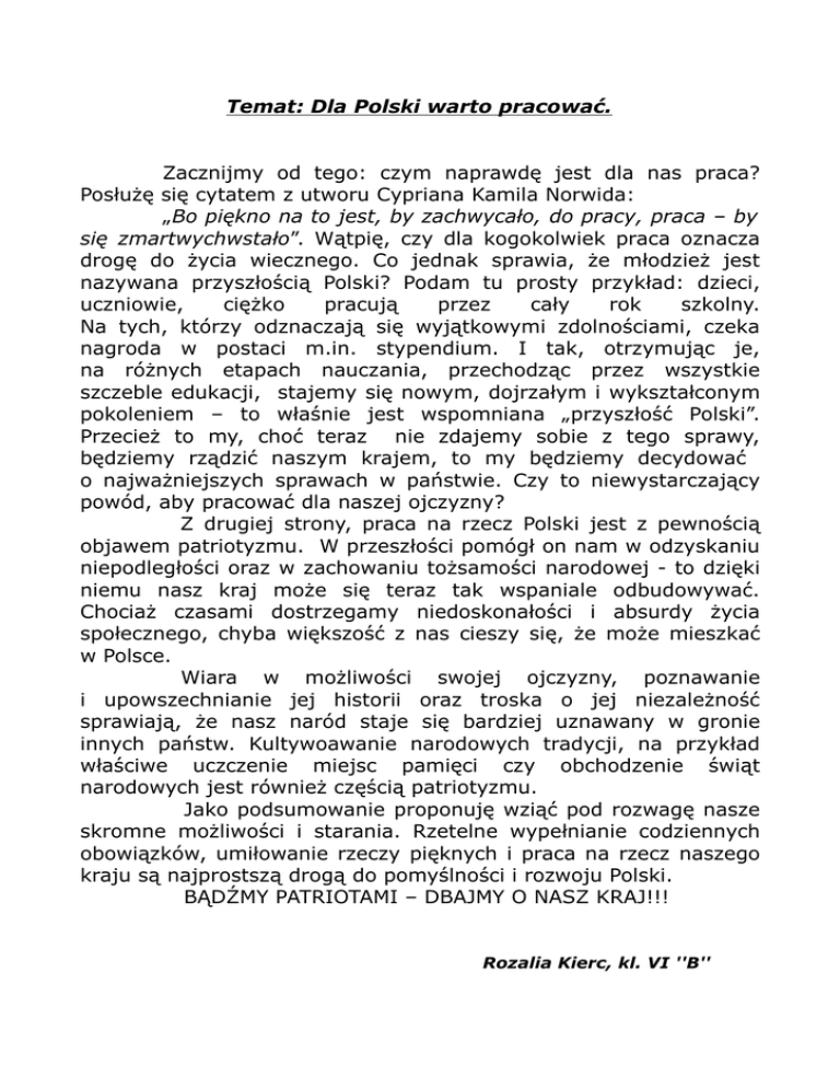Temat: Dla Polski warto pracować. Zacznijmy od tego: czym naprawdę jest dla nas praca? Posłużę się cytatem z utworu Cypriana Kamila Norwida: „Bo piękno na to jest, by zachwycało, do pracy, praca – by się zmartwychwstało”. Wątpię, czy dla kogokolwiek praca oznacza drogę do życia wiecznego. Co jednak sprawia, że młodzież jest nazywana przyszłością Polski? Podam tu prosty przykład: dzieci, uczniowie, ciężko pracują przez cały rok szkolny. Na tych, którzy odznaczają się wyjątkowymi zdolnościami, czeka nagroda w postaci m.in. stypendium. I tak, otrzymując je, na różnych etapach nauczania, przechodząc przez wszystkie szczeble edukacji, stajemy się nowym, dojrzałym i wykształconym pokoleniem – to właśnie jest wspomniana „przyszłość Polski”. Przecież to my, choć teraz nie zdajemy sobie z tego sprawy, będziemy rządzić naszym krajem, to my będziemy decydować o najważniejszych sprawach w państwie. Czy to niewystarczający powód, aby pracować dla naszej ojczyzny? Z drugiej strony, praca na rzecz Polski jest z pewnością objawem patriotyzmu. W przeszłości pomógł on nam w odzyskaniu niepodległości oraz w zachowaniu tożsamości narodowej - to dzięki niemu nasz kraj może się teraz tak wspaniale odbudowywać. Chociaż czasami dostrzegamy niedoskonałości i absurdy życia społecznego, chyba większość z nas cieszy się, że może mieszkać w Polsce. Wiara w możliwości swojej ojczyzny, poznawanie i upowszechnianie jej historii oraz troska o jej niezależność sprawiają, że nasz naród staje się bardziej uznawany w gronie innych państw. Kultywoawanie narodowych tradycji, na przykład właściwe uczczenie miejsc pamięci czy obchodzenie świąt narodowych jest również częścią patriotyzmu. Jako podsumowanie proponuję wziąć pod rozwagę nasze skromne możliwości i starania. Rzetelne wypełnianie codziennych obowiązków, umiłowanie rzeczy pięknych i praca na rzecz naszego kraju są najprostszą drogą do pomyślności i rozwoju Polski. BĄDŹMY PATRIOTAMI – DBAJMY O NASZ KRAJ!!! Rozalia Kierc, kl. VI ''B''
