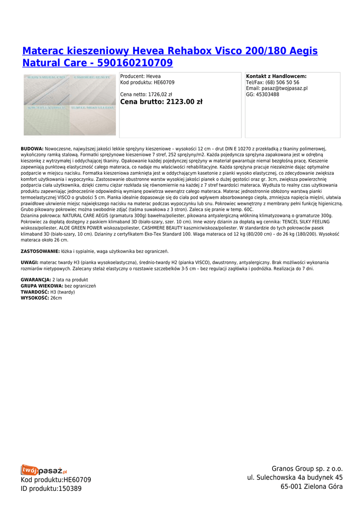 Materac kieszeniowy Hevea Rehabox Visco 200/180 Aegis Natural Care - 590160210709 Producent: Hevea Kod produktu: HE60709 Cena netto: 1726,02 zł Kontakt z Handlowcem: Tel/Fax: (68) 506 50 56 Email: [email protected] GG: 45303488 Cena brutto: 2123.00 zł BUDOWA: Nowoczesne, najwyższej jakości lekkie sprężyny kieszeniowe – wysokości 12 cm – drut DIN E 10270 z przekładką z tkaniny polimerowej, wykończony ramką stalową. Formatki sprężynowe kieszeniowe 7 stref, 252 sprężyny/m2. Każda pojedyncza sprężyna zapakowana jest w odrębną kieszonkę z wytrzymałej i oddychającej tkaniny. Opakowanie każdej pojedynczej sprężyny w materiał gwarantuje niemal bezgłośną pracę. Kieszenie zapewniają punktową elastyczność całego materaca, co nadaje mu właściwości rehabilitacyjne. Każda sprężyna pracuje niezależnie dając optymalne podparcie w miejscu nacisku. Formatka kieszeniowa zamknięta jest w oddychającym kasetonie z pianki wysoko elastycznej, co zdecydowanie zwiększa komfort użytkowania i wypoczynku. Zastosowanie obustronne warstw wysokiej jakości pianek o dużej gęstości oraz gr. 3cm, zwiększa powierzchnię podparcia ciała użytkownika, dzięki czemu ciężar rozkłada się równomiernie na każdej z 7 stref twardości materaca. Wydłuża to realny czas użytkowania produktu zapewniając jednocześnie odpowiednią wymianę powietrza wewnątrz całego materaca. Materac jednostronnie obłożony warstwą pianki termoelastycznej VISCO o grubości 5 cm. Pianka idealnie dopasowuje się do ciała pod wpływem absorbowanego ciepła, zmniejsza napięcia mięśni, ułatwia prawidłowe ukrwienie miejsc największego nacisku na materac podczas wypoczynku lub snu. Pokrowiec wewnętrzny z membrany pełni funkcję higieniczną. Grubo pikowany pokrowiec można swobodnie zdjąć (taśma suwakowa z 3 stron). Zaleca się pranie w temp. 60C. Dzianina pokrowca: NATURAL CARE AEGIS (gramatura 300g) bawełna/poliester, pikowana antyalergiczną włókniną klimatyzowaną o gramaturze 300g. Pokrowiec za dopłatą dostępny z paskiem klimaband 3D (biało-szary, szer. 10 cm). Inne wzory dzianin za dopłatą wg cennika: TENCEL SILKY FEELING wiskoza/poliester, ALOE GREEN POWER wiskoza/poliester, CASHMERE BEAUTY kaszmir/wiskoza/poliester. W standardzie do tych pokrowców pasek klimaband 3D (biało-szary, 10 cm). Dzianiny z certyfikatem Eko-Tex Standard 100. Waga materaca od 12 kg (80/200 cm) – do 26 kg (180/200). Wysokość materaca około 26 cm. ZASTOSOWANIE: łóżka i sypialnie, waga użytkownika bez ograniczeń. UWAGI: materac twardy H3 (pianka wysokoelastyczna), średnio-twardy H2 (pianka VISCO), dwustronny, antyalergiczny. Brak możliwości wykonania rozmiarów nietypowych. Zalecany stelaż elastyczny o rozstawie szczebelków 3-5 cm – bez regulacji zagłówka i podnóżka. Realizacja do 7 dni. GWARANCJA: 2 lata na produkt GRUPA WIEKOWA: bez ograniczeń TWARDOŚĆ: H3 (twardy) WYSOKOŚĆ: 26cm Kod produktu:HE60709 ID produktu:150389 Granos Group sp. z o.o. ul. Sulechowska 4a budynek 45 65-001 Zielona Góra