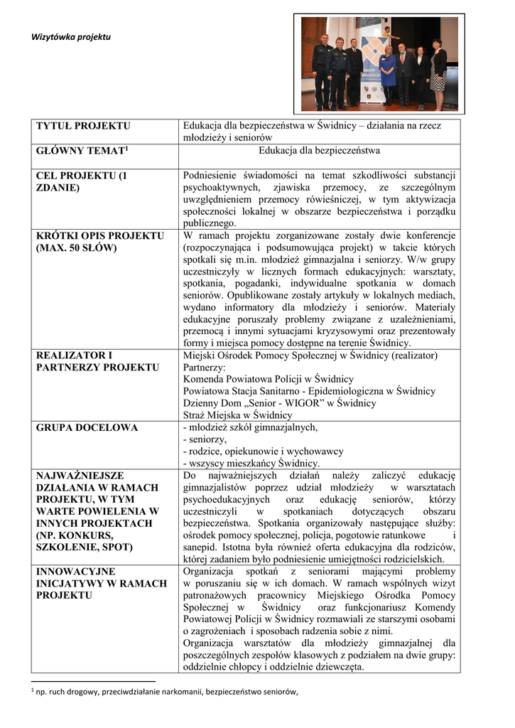 Wizytówka projektu TYTUŁ PROJEKTU GŁÓWNY TEMAT1 CEL PROJEKTU (1 ZDANIE) KRÓTKI OPIS PROJEKTU (MAX. 50 SŁÓW) REALIZATOR I PARTNERZY PROJEKTU GRUPA DOCELOWA NAJWAŻNIEJSZE DZIAŁANIA W RAMACH PROJEKTU, W TYM WARTE POWIELENIA W INNYCH PROJEKTACH (NP. KONKURS, SZKOLENIE, SPOT) INNOWACYJNE INICJATYWY W RAMACH PROJEKTU 1 Edukacja dla bezpieczeństwap.wlogo, Świdnicy plakat – działania na rzecz młodzieży i seniorów Edukacja dla bezpieczeństwa Podniesienie świadomości na temat szkodliwości substancji psychoaktywnych, zjawiska przemocy, ze szczególnym uwzględnieniem przemocy rówieśniczej, w tym aktywizacja społeczności lokalnej w obszarze bezpieczeństwa i porządku publicznego. W ramach projektu zorganizowane zostały dwie konferencje (rozpoczynająca i podsumowująca projekt) w takcie których spotkali się m.in. młodzież gimnazjalna i seniorzy. W/w grupy uczestniczyły w licznych formach edukacyjnych: warsztaty, spotkania, pogadanki, indywidualne spotkania w domach seniorów. Opublikowane zostały artykuły w lokalnych mediach, wydano informatory dla młodzieży i seniorów. Materiały edukacyjne poruszały problemy związane z uzależnieniami, przemocą i innymi sytuacjami kryzysowymi oraz prezentowały formy i miejsca pomocy dostępne na terenie Świdnicy. Miejski Ośrodek Pomocy Społecznej w Świdnicy (realizator) Partnerzy: Komenda Powiatowa Policji w Świdnicy Powiatowa Stacja Sanitarno - Epidemiologiczna w Świdnicy Dzienny Dom „Senior - WIGOR” w Świdnicy Straż Miejska w Świdnicy - młodzież szkół gimnazjalnych, - seniorzy, - rodzice, opiekunowie i wychowawcy - wszyscy mieszkańcy Świdnicy. Do najważniejszych działań należy zaliczyć edukację gimnazjalistów poprzez udział młodzieży w warsztatach psychoedukacyjnych oraz edukację seniorów, którzy uczestniczyli w spotkaniach dotyczących obszaru bezpieczeństwa. Spotkania organizowały następujące służby: ośrodek pomocy społecznej, policja, pogotowie ratunkowe i sanepid. Istotna była również oferta edukacyjna dla rodziców, której zadaniem było podniesienie umiejętności rodzicielskich. Organizacja spotkań z seniorami mającymi problemy w poruszaniu się w ich domach. W ramach wspólnych wizyt patronażowych pracownicy Miejskiego Ośrodka Pomocy Społecznej w Świdnicy oraz funkcjonariusz Komendy Powiatowej Policji w Świdnicy rozmawiali ze starszymi osobami o zagrożeniach i sposobach radzenia sobie z nimi. Organizacja warsztatów dla młodzieży gimnazjalnej dla poszczególnych zespołów klasowych z podziałem na dwie grupy: oddzielnie chłopcy i oddzielnie dziewczęta. np. ruch drogowy, przeciwdziałanie narkomanii, bezpieczeństwo seniorów, 2 ZREALIZOWANE INWESTYCJE2 Nie dotyczy LINKI DO STRON INTERNETOWYCH ZWIĄZANYCH Z PROJEKTEM http://um.swidnica.pl/ftpum/pub/mops/zakonczenie-projekturazem-bezpieczniej/ jeśli dotyczy.