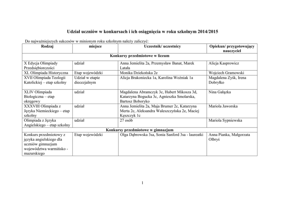 Udział uczniów w konkursach i ich osiągnięcia w roku szkolnym 2014/2015 Do najważniejszych sukcesów w minionym roku szkolnym należy zaliczyć: Rodzaj miejsce Uczestnik/ uczestnicy Opiekun/ przygotowujący nauczyciel Konkursy przedmiotowe w liceum X Edycja Olimpiady Przedsiębiorczości XL Olimpiada Historyczna XVII Olimpiada Teologii Katolickiej – etap szkolny udział XLIV Olimpiada Biologiczna – etap okręgowy XXXVIII Olimpiada z Języka Niemieckiego – etap szkolny Olimpiada z Języka Angielskiego – etap szkolny udział Konkurs przedmiotowy z języka angielskiego dla uczniów gimnazjum województwa warmińsko mazurskiego Etap wojewódzki Udział w etapie diecezjalnym udział udział Anna Jemielita 2a, Przemysław Banat, Marek Latała Monika Dziekońska 2e Alicja Brakoniecka 1a, Karolina Woźniak 1a Alicja Kasprowicz Magdalena Abramczyk 3c, Hubert Mikosza 3d, Katarzyna Bogucka 3c, Agnieszka Smolarska, Bartosz Boboryko Anna Jemielita 2a, Maja Brumer 2c, Katarzyna Merta 2c, Aleksandra Waleszczyńska 2e, Maciej Kęszczyk 1c 27 osób Nina Gałązka Konkursy przedmiotowe w gimnazjum Etap wojewódzki Olga Dąbrowska 3sa, Sonia Sanford 3sa - laureatki 1 Wojciech Gramowski Magdalena Zyśk, Irena Dobryłko Mariola Jaworska Mariola Sypniewska Anna Pianka, Małgorzata Olbryś Konkurs przedmiotowy z języka niemieckiego dla uczniów gimnazjum województwa warmińsko mazurskiego Etap wojewódzki Konkurs „Od pasji do pasji” zorganizowany przez NBP Szkolna internetowa gra giełdowa Ogólnopolska Olimpiada Wiedzy o Janie Pawle II udział Polsko – Ukraiński Konkurs Fizyczny „Lwiątko” Wyróżnienie – tytuł Taona Finał PRAXIS Turnieju Przedsiębiorczości XXIII Okręgowe Mistrzostwa Pierwszej Pomocy Polskiego Czerwonego Krzyża Wojewódzki konkurs fotograficzny „Rzeki Warmii i Mazur” Mazurskie Okręgowe Mistrzostwa Pierwszej Pomocy Polskiego Czerwonego Krzyża Michalina Archacka 2sa, - laureatka Iwona Dziąba Kacper Sęk 3sa - udział Katarzyna Krassowska, Konkursy ogólnopolskie Ewa Borowa 2, Natalia Jackiewicz Alicja Kasprowicz udział Klasa 1a Alicja Kasprowicz udział Oskar Drejka 1sa, Adam Jemielita 1sa, Filip Kowalczyk 1sa, Krzysztof Wlazło 1sa, Michał Krasula 3sa, Karol Wlazło 3sa Klasa 2sa – Michał Wrzosek Magdalena Zyśk, Irena Dobryłko Magdalena Lisewska Klasa 2a – Paweł Burdyński Konkursy wojewódzkie Dawid Przybylski, Mikołaj Szlachetka, Tomasz Cicholski – klasa 3sa Zespół Szkół nr 3 im. Jana III Sobieskiego w Szczytnie Alicja Kasprowicz udział Weronika Małecka - 6 miejsce Kapitan: Emil Barnowski 1b Maja Miszkiewicz Dominika Bancerek Milena Długołęcka 1d Patrycja Pietrzak Lucyna Majewska 2 miejsce udział 2 Lucyna Majewska Międzynarodowy Konkurs Matematyczny Kangur – klasyfikacje wojewódzkie klas ponadgimnazjalnych Międzynarodowy Konkurs Matematyczny Kangur – klasyfikacje wojewódzkie klas gimnazjalnych XIII Warmińsko-Mazurskie Zawody Matematyczne Konkurs „Uruchom serce bliźniemu” – organizowany przez Wojewodę Warmińsko – Mazurskiego Olimpiada wiedzy o zdrowiu PCK 6 miejsce (wyróżnienie) Mateusz Czechowicz 2a Anna Ciszewska 2 miejsce (wynik bardzo dobry) Tomasz Olender 1sa Agnieszka Brzostek 8 miejsce Paweł Burdyński 2a Anna Ciszewska 4 miejsce Zespół Szkół nr 3 im. Jana III Sobieskiego w Szczytnie – kapitan Martyna Pietruczuk 1d Jolanta Mieszała 1d, Aleksandra Czarnecka 1 Lucyna Majewska udział Gabriela Kornowska 3sa Nina Gałązka Międzyszkolny Konkurs Wiedzy o Krajach Anglojęzycznych 1 miejsce Konkursy powiatowe Maja Miszkiewicz, 2 miejsce Magdalena Ossowska 3e 3 miejsce Maciej Kęszczyk 2c wyróżnienie 2 miejsce Arkadiusz Parciak Krzysztof Wlazło 1sa, Konkurs Wiedzy o Św. Janie Pawle II – etap szkolny 3 miejsce XX Wojewódzka Olimpiada 1 miejsce Wiedzy o Obronie Cywilnej – etap powiatowy Anna Pianka, Małgorzata Bogucka, Małgorzata Olbryś, Ewa Enerlich Magdalena Zyśk, Irena Dobryłko Olga Dąbrowska 3sa Jerzy Otulakowski 1c Arkadiusz Żuchowski 1a 3 Lucyna Majewska X Powiatowy Konkurs z Języka Angielskiego „Master of English Spelling” Powiatowy Konkurs z Fizyki 1 miejsce Sonia Sanford 3sa 2 miejsce Olga Dąbrowska 3sa Małgorzata Bogucka, Małgorzata Olbryś, Anna Pianka 2 miejsce Michał Ruszczyk 3sa Magdalena Lisewska XXVIII Konkurs Recytatorski – eliminacje międzygminne Konkurs Wiedzy o Kresach – VI edycja wyróżnienie Zofia Chmielewska 1sa Ewa Gumkowska laureat Anna Jemielita 2a Wojciech Gramowski laureat Natalia Orłowska 2c Elżbieta Weichhaus – Kończyk laureat 2 miejsce Emilia Pilichowska 2c Michalina Archacka 2sa Iwona Dziąba, XIII Powiatowym Konkursie Matematycznym „Rozwiązywanie zadań tekstowych” Warmińsko – Mazurski Młodzieżowy Turniej Motoryzacyjny – etap powiatowy Powiatowy Konkurs Fizyczny 1 miejsce Wiktoria Napiórkowska 2sa, Filip Gleba 2sa Karolina Myślak 1 miejsce Zespół Szkół nr 3 – Rafał Malinowski 2a, Patryk Mikołajewski 2a, Kamil Malinowski 1b Małgorzata Olbryś 2 miejsce Michał Ruszczyk 3sa Magdalena Lisewska „Sitten und Bräuche der Liceum Powiatowy Konkurs z Języka Niemieckiego Konkursy szkolne Katarzyna Krassowska, 4 deutschsprachigen Länder” – VI edycja 1 miejsce Ewa Borowa, Kamila Mieszała, Alicja Brakoniecka 2 miejsce Gabriela Duda 3 miejsce Karolina Roczeń i Kamil Zadroga Anna Kowalska Gimnazjum Konkurs plastyczny zorganizowany w ramach obchodów XIV Dni Papieskich „Jan Paweł II – Świętymi Bądźcie” Olimpiada wiedzy o zdrowiu PCK – etap szkolny 1 miejsce Filip Kowalczyk 2 miejsce Kinga Jaskulska, Aleksandra Lichnerowicz i Adam Jemielita Aleksandra Lichnerowicz 1sa 1 miejsce Magdalena Zyśk Nina Galązka Liceum 1 miejsce Maciej Kęszczyk 1c 2 miejsce Julia Wołek 1c Gimnazjum II Konkurs Wiedzy o Niemczech, Austrii i Szwajcarii pod nazwą 1 miejsce Gabriela Kornowska 3sa 2 miejsce 1 miejsce Natalia Dudek 3sa Maciej Kęszczyk 1c, Wiktoria Ałaj 1c, Maja Miszkiewicz 1c 5 Katarzyna Krassowska, Anna Kowalska