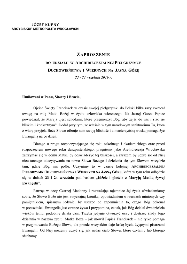 JÓZEF KUPNY ARCYBISKUP METROPOLITA WROCŁAWSKI Z APROSZENIE DO UDZIAŁU W ARCHIDIECEZJALNEJ PIELGRZYMCE DUCHOWIEŃSTWA I WIERNYCH NA JASNĄ GÓRĘ 23 - 24 września 2016 r. Umiłowani w Panu, Siostry i Bracia, Ojciec Święty Franciszek w czasie swojej pielgrzymki do Polski kilka razy zwracał uwagę na rolę Matki Bożej w życiu człowieka wierzącego. Na Jasnej Górze Papież powiedział, że Maryja „jest schodami, które przemierzył Bóg, aby zejść do nas i stać się bliskim i konkretnym”. Dodał przy tym, że właśnie w tym narodowym sanktuarium Ta, która z wiarą przyjęła Boże Słowo oferuje nam swoją bliskość i z macierzyńską troską pomaga żyć Ewangelią na co dzień. Dlatego u progu rozpoczynającego się roku szkolnego i akademickiego oraz przed rozpoczęciem nowego roku duszpasterskiego, pragniemy jako Archidiecezja Wrocławska zatrzymać się w domu Matki, by doświadczyć tej bliskości, a zarazem by uczyć się od Niej nieustannego odczytywania na nowo Słowa Bożego i dzielenia się tym Słowem wszędzie tam, gdzie Bóg nas pośle. Uczynimy to w czasie kolejnej ARCHIDIECEZJALNEJ PIELGRZYMKI DUCHOWIEŃSTWA I WIERNYCH NA JASNĄ GÓRĘ, która w tym roku odbędzie się w dniach 23 i 24 września pod hasłem „Idźcie i głoście z Maryją Matką żywej Ewangelii”. Patrząc w oczy Czarnej Madonny i rozważając tajemnice Jej życia uświadamiamy sobie, że Słowo Boże nie jest zwyczajną kroniką, opowiadaniem o rzeczach minionych czy pamiętnikiem, spisanym jedynie, by ustrzec od zapomnienia to, czego Bóg dokonał w przeszłości. Ewangelia jest zawsze żywa i przypomina, że tak, jak Bóg działał dwadzieścia wieków temu, podobnie działa dziś. Trzeba jedynie otworzyć oczy i dostrzec ślady Jego działania w naszym życiu. Matka Boża – jak mówił Papież Franciszek – nie tylko pomaga w przyjmowaniu Bożego Słowa, ale przede wszystkim daje łaskę bycia żyjącymi pisarzami Ewangelii. Od Niej możemy uczyć się, jak nadać ciało Słowu, które czytamy lub którego słuchamy. 2 Stąd moja prośba: przybądźcie na JASNĄ GÓRĘ, by podziękować Maryi za opiekę nad nami i powierzyć Jej siebie samych, nasze rodziny, parafie, całą Archidiecezję i naszą Ojczyznę. Całonocne czuwanie w kaplicy cudownego obrazu rozpoczniemy Mszą Świętą w bazylice jasnogórskiej o godz. 18.30, której będę przewodniczył. O godz. 21.00 spotkamy się na Apelu Jasnogórskim, a o północy na Eucharystii przed wizerunkiem Czarnej Madonny. Nasze trwanie przed Matką zakończymy Mszą Świętą o godz. 6.00. Mocno ufam, że dane nam będzie spotkać się na Jasnej Górze, by wspólnie pukać do domu Matki i prosić, by pomagała nam stawać się wiarygodnymi świadkami Ewangelii. Dziękując Wam, Bracia Kapłani, za dotychczasowe zaangażowanie w przygotowanie naszego ARCHIDIECEZJALNEGO CZUWANIA, proszę o pomoc w zorganizowaniu wyjazdów dla wiernych, którym posługujecie. Wierzę, że nasze pielgrzymowanie przyniesie wszystkim błogosławione owoce. W tym duchu wszystkim z serca błogosławię + Józef Kupn y Arcybiskup Metropolita Wrocławski ___________________________________ KURIA METROPOLITALNA WROCŁAWSKA L.dz. 1250/2016 Zarządzenie Powyższe ZAPROSZENIE J.E. Księdza Arcybiskupa Metropolity Wrocławskiego należy odczytać we wszystkich kościołach i kaplicach Archidiecezji w niedzielę 11 września i przypomnieć 18 września br. Wrocław, 31.08.2016 r. WIKARIUSZ GENERALNY
