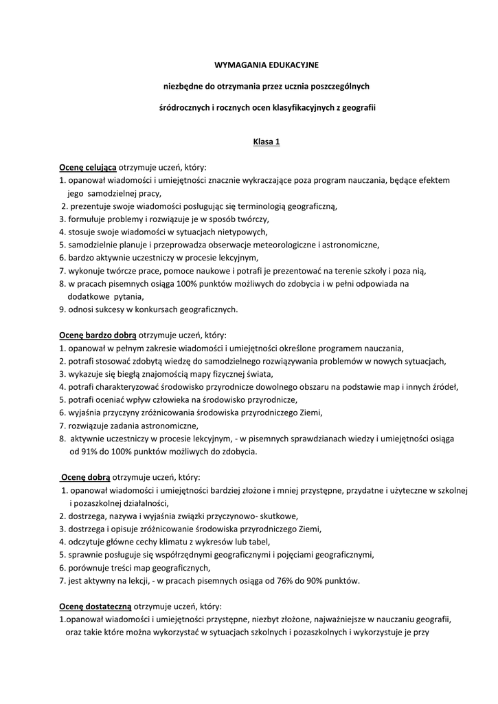 WYMAGANIA EDUKACYJNE niezbędne do otrzymania przez ucznia poszczególnych śródrocznych i rocznych ocen klasyfikacyjnych z geografii Klasa 1 Ocenę celująca otrzymuje uczeń, który: 1. opanował wiadomości i umiejętności znacznie wykraczające poza program nauczania, będące efektem jego samodzielnej pracy, 2. prezentuje swoje wiadomości posługując się terminologią geograficzną, 3. formułuje problemy i rozwiązuje je w sposób twórczy, 4. stosuje swoje wiadomości w sytuacjach nietypowych, 5. samodzielnie planuje i przeprowadza obserwacje meteorologiczne i astronomiczne, 6. bardzo aktywnie uczestniczy w procesie lekcyjnym, 7. wykonuje twórcze prace, pomoce naukowe i potrafi je prezentować na terenie szkoły i poza nią, 8. w pracach pisemnych osiąga 100% punktów możliwych do zdobycia i w pełni odpowiada na dodatkowe pytania, 9. odnosi sukcesy w konkursach geograficznych. Ocenę bardzo dobrą otrzymuje uczeń, który: 1. opanował w pełnym zakresie wiadomości i umiejętności określone programem nauczania, 2. potrafi stosować zdobytą wiedzę do samodzielnego rozwiązywania problemów w nowych sytuacjach, 3. wykazuje się biegłą znajomością mapy fizycznej świata, 4. potrafi charakteryzować środowisko przyrodnicze dowolnego obszaru na podstawie map i innych źródeł, 5. potrafi oceniać wpływ człowieka na środowisko przyrodnicze, 6. wyjaśnia przyczyny zróżnicowania środowiska przyrodniczego Ziemi, 7. rozwiązuje zadania astronomiczne, 8. aktywnie uczestniczy w procesie lekcyjnym, - w pisemnych sprawdzianach wiedzy i umiejętności osiąga od 91% do 100% punktów możliwych do zdobycia. Ocenę dobrą otrzymuje uczeń, który: 1. opanował wiadomości i umiejętności bardziej złożone i mniej przystępne, przydatne i użyteczne w szkolnej i pozaszkolnej działalności, 2. dostrzega, nazywa i wyjaśnia związki przyczynowo- skutkowe, 3. dostrzega i opisuje zróżnicowanie środowiska przyrodniczego Ziemi, 4. odczytuje główne cechy klimatu z wykresów lub tabel, 5. sprawnie posługuje się współrzędnymi geograficznymi i pojęciami geograficznymi, 6. porównuje treści map geograficznych, 7. jest aktywny na lekcji, - w pracach pisemnych osiąga od 76% do 90% punktów. Ocenę dostateczną otrzymuje uczeń, który: 1.opanował wiadomości i umiejętności przystępne, niezbyt złożone, najważniejsze w nauczaniu geografii, oraz takie które można wykorzystać w sytuacjach szkolnych i pozaszkolnych i wykorzystuje je przy niewielkiej pomocy nauczyciela, 2. potrafi określić główne cechy Ziemi jako planety oraz jej miejsca w Układzie Słonecznym, 3. wykazuje zrozumienie podstawowych procesów zachodzących w atmosferze, hydrosferze i litosferze, 4. opisuje klimat regionu w którym znajduje się szkoła, - podaje przykłady prostych związków przyczynowo – skutkowych, - wykonuje wykres na podstawie danych liczbowych, 5. odczytuje informacje z map tematycznych, 6. wykazuje się aktywnością na lekcji w stopniu zadowalającym, - w przypadku prac pisemnych osiąga od 51% do 75% punktów. Ocenę dopuszczającą otrzymuje uczeń, który: 1. opanował jedynie minimum wiedzy i umiejętności określonych programem, ale nie przekreślają one możliwości dalszego kształcenia, 2. większość ćwiczeń i poleceń wykonuje z pomocą nauczyciela, 3. potrafi wymienić planety Układu Społecznego, podać różnice między ruchem obrotowym i obiegowym Ziemi, 4. potrafi wymienić sfery Ziemi, - potrafi w niewielkim stopniu korzystać z mapy, - tylko z pomocą nauczyciela jest w stanie określić współrzędne geograficzne , 5. na pytanie dotyczące mapy, pogody i klimatu, krajobrazów, kontynentów odpowiada jedynie za pomocą nauczyciela, 6. jest mało aktywny na lekcji, 7. w pisemnych sprawdzianach wiedzy i umiejętności osiąga od 31% do 50% punktów. Ocenę niedostateczną otrzymuje uczeń, który: 1. nie opanował wiadomości i umiejętności określanych podstawami programowymi, koniecznymi do dalszego kształcenia, 2. wykazuje się brakiem systematyczności w przyswajaniu wiedzy i wykonywaniu prac domowych, 3. nie podejmuje próby rozwiązywania zadań o elementarnym stopniu trudności nawet przy pomocy nauczyciela, 4. nie potrafi czytać mapy, 5. nie potrafi opisywać pogody, - wykazuje się bierną postawą na lekcji, 6. w przypadku prac pisemnych osiąga od 0% do 30% punktów. Klasa 2 Ocenę celująca otrzymuje uczeń, który: 1.opanował wiadomości i umiejętności znacznie wykraczające poza program nauczania, będące efektem jego samodzielnej pracy, 2.prezentuje swoje wiadomości posługując się terminologią geograficzną, 3.formułuje problemy i rozwiązuje je w sposób twórczy, 4.stosuje swoje wiadomości w sytuacjach nietypowych, 5.samodzielnie planuje i przeprowadza obserwacje meteorologiczne i astronomiczne, bardzo aktywnie uczestniczy w procesie lekcyjnym, 6.wykonuje twórcze prace, pomoce naukowe i potrafi je prezentować na terenie szkoły i poza nią, 7.w pracach pisemnych osiąga 100% punktów możliwych do zdobycia i w pełni odpowiada na dodatkowe pytania , 8.odnosi sukcesy w konkursach geograficznych. Ocenę bardzo dobrą otrzymuje uczeń, który: 1. opanował w pełnym zakresie wiadomości i umiejętności określone programem nauczania, 2. potrafi stosować zdobytą wiedzę do samodzielnego rozwiązywania problemów w nowych sytuacjach, 3. wykazuje się biegłą znajomością mapy fizycznej świata, 4. potrafi charakteryzować środowisko przyrodnicze dowolnego obszaru świata na podstawie map i innych źródeł, 5. charakteryzuje poziom rozwoju społeczno – gospodarczego i struktury gospodarki na podstawie danych statystycznych, 6. potrafi oceniać wpływ człowieka na środowisko przyrodnicze, 7. dostrzega pozytywne i negatywne skutki globalizacji, 8. szacuje nasilenie problemów społecznych występujących na świecie, 9. rozwiązuje zadania astronomiczne, 10. aktywnie uczestniczy w procesie lekcyjnym, 11. w pisem
