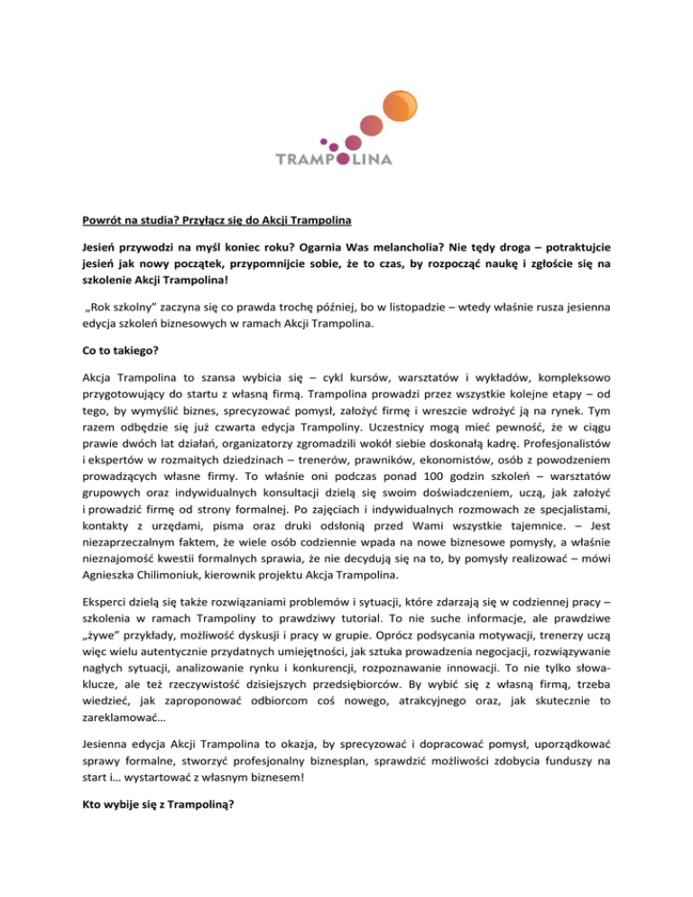 Powrót na studia? Przyłącz się do Akcji Trampolina Jesień przywodzi na myśl koniec roku? Ogarnia Was melancholia? Nie tędy droga – potraktujcie jesień jak nowy początek, przypomnijcie sobie, że to czas, by rozpocząć naukę i zgłoście się na szkolenie Akcji Trampolina! „Rok szkolny” zaczyna się co prawda trochę później, bo w listopadzie – wtedy właśnie rusza jesienna edycja szkoleń biznesowych w ramach Akcji Trampolina. Co to takiego? Akcja Trampolina to szansa wybicia się – cykl kursów, warsztatów i wykładów, kompleksowo przygotowujący do startu z własną firmą. Trampolina prowadzi przez wszystkie kolejne etapy – od tego, by wymyślić biznes, sprecyzować pomysł, założyć firmę i wreszcie wdrożyć ją na rynek. Tym razem odbędzie się już czwarta edycja Trampoliny. Uczestnicy mogą mieć pewność, że w ciągu prawie dwóch lat działań, organizatorzy zgromadzili wokół siebie doskonałą kadrę. Profesjonalistów i ekspertów w rozmaitych dziedzinach – trenerów, prawników, ekonomistów, osób z powodzeniem prowadzących własne firmy. To właśnie oni podczas ponad 100 godzin szkoleń – warsztatów grupowych oraz indywidualnych konsultacji dzielą się swoim doświadczeniem, uczą, jak założyć i prowadzić firmę od strony formalnej. Po zajęciach i indywidualnych rozmowach ze specjalistami, kontakty z urzędami, pisma oraz druki odsłonią przed Wami wszystkie tajemnice. – Jest niezaprzeczalnym faktem, że wiele osób codziennie wpada na nowe biznesowe pomysły, a właśnie nieznajomość kwestii formalnych sprawia, że nie decydują się na to, by pomysły realizować – mówi Agnieszka Chilimoniuk, kierownik projektu Akcja Trampolina. Eksperci dzielą się także rozwiązaniami problemów i sytuacji, które zdarzają się w codziennej pracy – szkolenia w ramach Trampoliny to prawdziwy tutorial. To nie suche informacje, ale prawdziwe „żywe” przykłady, możliwość dyskusji i pracy w grupie. Oprócz podsycania motywacji, trenerzy uczą więc wielu autentycznie przydatnych umiejętności, jak sztuka prowadzenia negocjacji, rozwiązywanie nagłych sytuacji, analizowanie rynku i konkurencji, rozpoznawanie innowacji. To nie tylko słowaklucze, ale też rzeczywistość dzisiejszych przedsiębiorców. By wybić się z własną firmą, trzeba wiedzieć, jak zaproponować odbiorcom coś nowego, atrakcyjnego oraz, jak skutecznie to zareklamować… Jesienna edycja Akcji Trampolina to okazja, by sprecyzować i dopracować pomysł, uporządkować sprawy formalne, stworzyć profesjonalny biznesplan, sprawdzić możliwości zdobycia funduszy na start i… wystartować z własnym biznesem! Kto wybije się z Trampoliną? Szkolenia Akcji Trampolina są skierowane do studentów i świeżo upieczonych absolwentów, którzy stawiają swoje pierwsze zawodowe kroki w różnych dziedzinach, a swoją przyszłość widzą raczej w pracy dla siebie niż w korporacyjnym wyścigu szczurów… Również dla pracowników naukowych i doktorantów – którzy podczas pracy ze studentami czują przypływ kreatywnych mocy i mają pomysł, jak spożytkować je z zyskiem. Do tej pory odbyły się trzy edycje „Trampolin”, z których wybiły się takie firmy, jak pracownia szkoleniowa dla nauczycieli i pedagogów – Sentire, Mikroprecyzja – superprecyzyjnie zajmująca się metrologią przemysłową, PlusVet – profesjonalna i przyjazna przychodnia weterynaryjna, czy Aquamind, firma specjalizująca się w zakładaniu i obsłudze akwariów oraz oczek wodnych. Akcja Trampolina realizowana jest w projekcie „MPTW II - Mazowiecki Program Transferu Wiedzy II”, współfinansowanym ze środków Unii Europejskiej w ramach Europejskiego Funduszu Społecznego