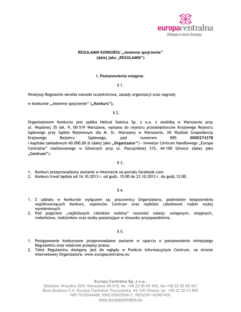 REGULAMIN KONKURSU „Jesienne spojrzenie” (dalej jako „REGULAMIN”) I. Postanowienia wstępne. § 1. Niniejszy Regulamin określa warunki uczestnictwa, zasady organizacji oraz nagrody w konkursie „Jesienne spojrzenie” („Konkurs”). § 2. Organizatorem Konkursu jest spółka Helical Sośnica Sp. z o.o. z siedzibą w Warszawie przy ul. Wspólnej 35 lok. 9, 00-519 Warszawa, wpisana do rejestru przedsiębiorców Krajowego Rejestru Sądowego przy Sądzie Rejonowym dla M. St. Warszawy w Warszawie, XII Wydział Gospodarczy Krajowego Rejestru Sądowego, pod numerem KRS 0000274378 i kapitale zakładowym 60.000,00 zł (dalej jako „Organizator”) - Inwestor Centrum Handlowego „Europa Centralna” realizowanego w Gliwicach przy ul. Pszczyńskiej 315, 44-100 Gliwice (dalej jako „Centrum”). § 3. 1. Konkurs przeprowadzony zostanie w Internecie na portalu facebook.com. 2. Konkurs trwał będzie od 16.10.2013 r. od godz. 15:00 do 23.10.2013 r. do godz.12:00. § 4. 1. Z udziału w Konkursie wyłączeni są: pracownicy Organizatora, podmiotów bezpośrednio współtworzących Konkurs, najemców Centrum oraz najbliżsi członkowie rodzin wyżej wymienionych. 2. Pod pojęciem „najbliższych członków rodziny” rozumieć należy: wstępnych, zstępnych, rodzeństwo, małżonków oraz osoby pozostające w stosunku przysposobienia. § 5. 1. Postępowanie konkursowe przeprowadzane zostanie w oparciu o postanowienia niniejszego Regulaminu oraz właściwe przepisy prawa. 2. Tekst Regulaminu dostępny jest do wglądu w Punkcie Informacyjnym Centrum, na stronie internetowej Organizatora: www.europacentralna.eu Europa Centralna Sp. z o.o., Siedziba: Wspólna 35/9, Warszawa 00-519, tel. +48 22 55 65 400, fax +48 22 55 65 401 Biuro Budowy C.H. Europa Centralna: Pszczyńska, 44-100 Gliwice, tel. +48 32 32 01 893 NIP 7010244486, KRS 0000359411, REGON 142467400 www.europacentralna.eu II Uczestnicy konkursu § 6. Prawo do udziału w Konkursie na warunkach określonych w niniejszym Regulaminie, przysługuje wyłącznie osobom fizycznym posiadającym pełną zdolność do czynności prawnych. III Zasady przeprowadzenia Konkursu § 7. 1. Udział w konkursie wziąć można poprzez wysłanie zdjęcia na adres e-mail: [email protected], które będą publikowane na fanpage’u C.H. Europa Centralna facebook.com pod adresem: facebook.com/europa.centralna.eu 2. Warunkiem udziału w Konkursie jest: a) przesyłanie na e-mail: [email protected] zdjęcia makijażu wykonanego przez siebie wraz z krótkim opisem. Zdjęcia zostaną opublikowane w galerii na fan page Centrum, a fani będą głosować na zdjęcie, które spodobało się najbardziej poprzez klikanie przycisku „Lubię to!”. Wygrywa zdjęcie, które uzyska największa ilość głosów (ilość kliknięć „Lubię to!”). b) podanie przez Uczestnika swoich danych osobowych tj. imienia, nazwiska, adresu zamieszkania oraz adresu e-mail, w tym podstawowych danych osobowych Pani, o której mowa w lit. a) powyżej (tj. imię, nazwisko, adres zamieszkania). 3. Przesłanie zdjęcia jest równoznaczne z wyrażeniem zgody na jego publikację na fanpage’u C.H. Europa Centralna facebook.com pod adresem: facebook.com/europa.centralna.eu. 4. Podając swoje dane osobowe tj. imię, nazwisko, Uczestnik konkursu wyraża zgodę na warunki dotyczące przetwarzania danych osobowych zawarte w niniejszym regulaminie. 5. Zdjęcia należy wysłać mailem najpóźniej do godz. 17.00 w dniu 21.10.2013 r. Po tym terminie zgłoszenia nie będą brały udziału w Konkursie. 6. Głosowanie na najładniejsze zdjęcie trwać będzie od 16.10.2013 r. od godz. 15:00 do 23.10.2013 r. do godz. 12:00. 7 . Przesłanie zdjęcia przez Uczestnika Konkursu na adres e-mail [email protected] jest równoznaczne z akceptacją przez Uczestnika postanowień niniejszego Regulaminu w całości. Uczestnik Konkursu zobowiązuje się do przestrzegania określonych w Regulaminie zasad, jak również potwierdza, iż spełnia wszystkie warunki, które uprawniają go do udziału w Konkursie. 8. Przesłanie zdjęcia oznacza wyrażenie zgody na publikację wizerunku uczestnika konkursu na fanpage’u C.H. Europa Centralna facebook.com pod adresem: facebook.com/europa.centralna.eu. IV. Ocena zgłoszeń i wyłonienie Zwycięzcy § 8. 1. Oceny nadesłanych zdjęć będą dokonywać Fani profilu C.H. Europa Centralna (facebook.com pod adresem: facebook.com/europa.centralna.eu) głosując poprzez klikanie przycisku „Lubię to!” przy wybranym zdjęciu. Zwycięzcami zostaną osoby, których zdjęcie zbierze największą ilość oddanych w ten sposób głosów. § 9. Europa Centralna Sp. z o.o., Siedziba: Wspólna 35/9, Warszawa 00-519, tel. +48 22 55 65 400, fax +48 22 55 65 401 Biuro Budowy C.H. Europa Centralna: Pszczyńska, 44-100 Gliwice, tel. +48 32 32 01 893 NIP 7010244486, KRS 0000359411, REGON 142467400 www.europacentralna.eu 1. Ogłoszenie wyników Konkursu nastąpi w dniu 23.10.2013 r. o godz. 14:00 na portalu Facebook.com. 2. Organizator zastrzega, iż ww. ogłoszenie wyników konkursu jest jedyną formą poinformowania Uczestników konkursu o rozstrzygnięciu Komisji. 3. Warunkiem odbioru nagrody jest okazanie przez danego Zwycięzcę dokumentu potwierdzającego tożsamość. Z chwilą odbioru Nagrody Zwycięzca staje się jej właścicielem. § 10. Organizator nie ponosi odpowiedzialności za podanie przez Uczestnika nieprawidłowych danych, utrudniających lub uniemożliwiających wywołanie Uczestnika konkursu, jak również za inne przyczyny uniemożliwiające kontakt z Uczestnikiem. V Nagrody § 11. 1. Organizator przewidział następujące nagrody dla Zwycięzców Konkursu: 1. Miejsce I - zestaw: Balsam do Ciała, lakier do paznokci, błyszczy do ust, kredka do oczu , puder sypki - -produkty pełnowartościowe - o łącznej wartości 450 zł, dodatkowo - miniatura tuszu do rzęs, miniatura perfum 2. Miejsce II - zestaw: lakier do paznokci , kredka do oczu - produkty pełnowartościowe 