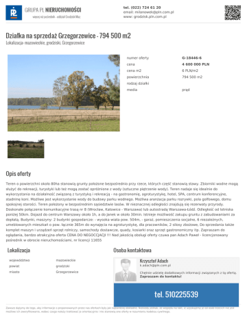 tel. (022) 724 61 20 email: [email protected] www: grodzisk.pln.com.pl Działka na sprzedaż Grzegorzewice - 794 500 m2 Lokalizacja: mazowieckie, grodziski, Grzegorzewice numer oferty G-18446-6 cena 4 600 000 PLN cena m2 6 PLN/m2 powierzchnia 794 500 m2 rodzaj działki media prąd Opis oferty Teren o powierzchni około 80ha stanowią grunty położone bezpośrednio przy rzece, których część stanowią stawy. Zbiorniki wodne mogą służyć do rekreacji, turystyki lub też mogą zostać opróżnione z wody (sztuczne piętrzenie wody). Teren nadaje się idealnie do wykorzystania na działalność związaną z turystyką i rekreacją - na gastronomię, agroturystykę, hotel, SPA, centrum konferencyjne, stadninę koni. Możliwe jest wykorzystanie wody do budowy parku wodnego. Możliwa aranżacja parku rozrywki, pola golfowego, domu spokojnej starości. Teren położony w bezpośrednim sąsiedztwie lasów. W nieznacznej odległości znajdują się rezerwaty przyrody. Doskonałe połączenie komunikacyjne trasą nr 8 (Wrocław, Katowice - Warszawa) lub autostradą Warszawa-Łódź. Odległość od lotniska poniżej 50km. Dojazd do centrum Warszawy około 1h, a do Janek w około 30min. Istnieje możliwość zakupu gruntu z zabudowaniami za dopłatą. Budynki, maszyny: 2 budynki gospodarcze: - wysoka wiata pow. 504m, - garaż, pomieszczenia socjalne, 6 niezależnych, umeblowanych mieszkań o pow. łącznie 365m do wynajęcia na agroturystykę, dla pracowników, 2 silosy zbożowe, Do sprzedania także komplet maszyn i urządzeń sprzęt rolniczy, samochody dostawcze, quady, kosiarki oraz sprzęt gastronomiczny itp. Zapraszam do oglądania, bardzo atrakcyjna oferta CENA DO NEGOCCJACJI !!! Nad jakością obsługi oferty czuwa pan Adach Paweł - licencjonowany pośrednik w obrocie nieruchomościami, nr licencji 11655 Lokalizacja Osoba kontaktowa Krzysztof Adach województwo mazowieckie powiat grodziski [email protected] miasto Grzegorzewice Chętnie udzielę dodatkowych informacji związanych z tą ofertą. Zapraszam do kontaktu! tel. 510225539 Zawsze dążymy do tego, aby informacje o proponowanych przez nas ofertach były jak najbardziej dokładne. Niekiedy jednak, ze względu na fakt, iż uzyskujemy je od osób trzecich nie jest możliwe ich zweryfikowanie, wobec czego należy traktować je orientacyjnie i nie stanowią one oferty w rozumieniu kodeksu cywilnego.