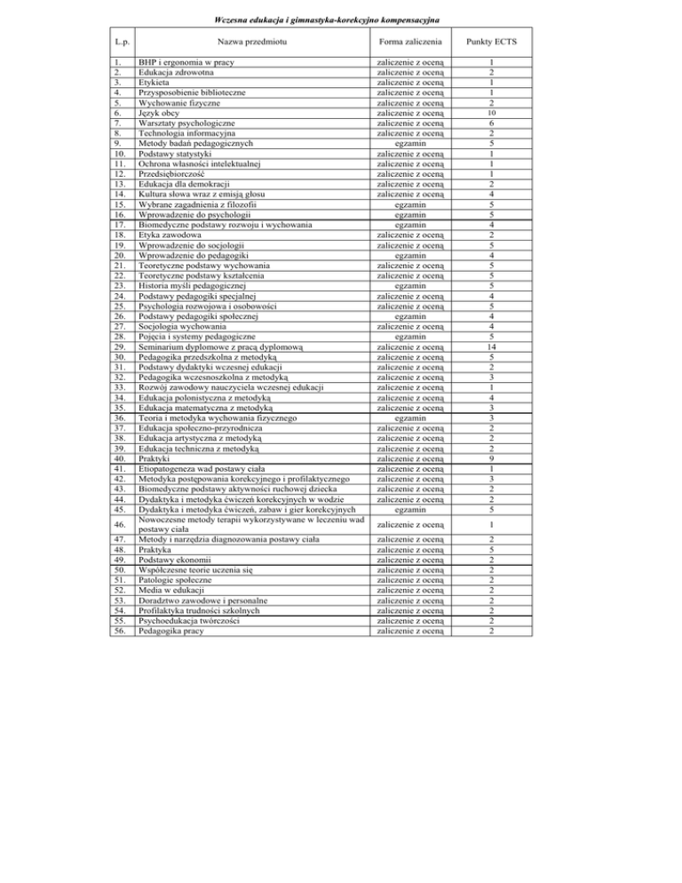Wczesna edukacja i gimnastyka-korekcyjno kompensacyjna L.p. Nazwa przedmiotu Forma zaliczenia Punkty ECTS 1. 2. 3. 4. 5. 6. 7. 8. 9. 10. 11. 12. 13. 14. 15. 16. 17. 18. 19. 20. 21. 22. 23. 24. 25. 26. 27. 28. 29. 30. 31. 32. 33. 34. 35. 36. 37. 38. 39. 40. 41. 42. 43. 44. 45. BHP i ergonomia w pracy Edukacja zdrowotna Etykieta Przysposobienie biblioteczne Wychowanie fizyczne Język obcy Warsztaty psychologiczne Technologia informacyjna Metody badań pedagogicznych Podstawy statystyki Ochrona własności intelektualnej Przedsiębiorczość Edukacja dla demokracji Kultura słowa wraz z emisją głosu Wybrane zagadnienia z filozofii Wprowadzenie do psychologii Biomedyczne podstawy rozwoju i wychowania Etyka zawodowa Wprowadzenie do socjologii Wprowadzenie do pedagogiki Teoretyczne podstawy wychowania Teoretyczne podstawy kształcenia Historia myśli pedagogicznej Podstawy pedagogiki specjalnej Psychologia rozwojowa i osobowości Podstawy pedagogiki społecznej Socjologia wychowania Pojęcia i systemy pedagogiczne Seminarium dyplomowe z pracą dyplomową Pedagogika przedszkolna z metodyką Podstawy dydaktyki wczesnej edukacji Pedagogika wczesnoszkolna z metodyką Rozwój zawodowy nauczyciela wczesnej edukacji Edukacja polonistyczna z metodyką Edukacja matematyczna z metodyką Teoria i metodyka wychowania fizycznego Edukacja społeczno-przyrodnicza Edukacja artystyczna z metodyką Edukacja techniczna z metodyką Praktyki Etiopatogeneza wad postawy ciała Metodyka postępowania korekcyjnego i profilaktycznego Biomedyczne podstawy aktywności ruchowej dziecka Dydaktyka i metodyka ćwiczeń korekcyjnych w wodzie Dydaktyka i metodyka ćwiczeń, zabaw i gier korekcyjnych Nowoczesne metody terapii wykorzystywane w leczeniu wad postawy ciała Metody i narzędzia diagnozowania postawy ciała Praktyka Podstawy ekonomii Współczesne teorie uczenia się Patologie społeczne Media w edukacji Doradztwo zawodowe i personalne Profilaktyka trudności szkolnych Psychoedukacja twórczości Pedagogika pracy zaliczenie z oceną zaliczenie z oceną zaliczenie z oceną zaliczenie z oceną zaliczenie z oceną zaliczenie z oceną zaliczenie z oceną zaliczenie z oceną egzamin zaliczenie z oceną zaliczenie z oceną zaliczenie z oceną zaliczenie z oceną zaliczenie z oceną egzamin egzamin egzamin zaliczenie z oceną zaliczenie z oceną egzamin zaliczenie z oceną zaliczenie z oceną egzamin zaliczenie z oceną zaliczenie z oceną egzamin zaliczenie z oceną egzamin zaliczenie z oceną zaliczenie z oceną zaliczenie z oceną zaliczenie z oceną zaliczenie z oceną zaliczenie z oceną zaliczenie z oceną egzamin zaliczenie z oceną zaliczenie z oceną zaliczenie z oceną zaliczenie z oceną zaliczenie z oceną zaliczenie z oceną zaliczenie z oceną zaliczenie z oceną egzamin 1 2 1 1 2 6 2 5 1 1 1 2 4 5 5 4 2 5 4 5 5 5 4 5 4 4 5 14 5 2 3 1 4 3 3 2 2 2 9 1 3 2 2 5 zaliczenie z oceną 1 zaliczenie z oceną zaliczenie z oceną zaliczenie z oceną zaliczenie z oceną zaliczenie z oceną zaliczenie z oceną zaliczenie z oceną zaliczenie z oceną zaliczenie z oceną zaliczenie z oceną 2 5 2 2 2 2 2 2 2 2 46. 47. 48. 49. 50. 51. 52. 53. 54. 55. 56. 10