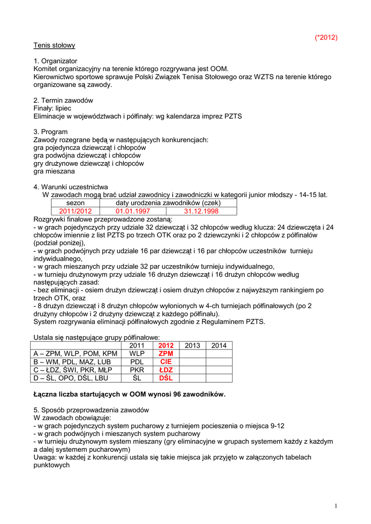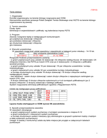 (*2012) Tenis stołowy 1. Organizator Komitet organizacyjny na terenie którego rozgrywana jest OOM. Kierownictwo sportowe sprawuje Polski Związek Tenisa Stołowego oraz WZTS na terenie którego organizowane są zawody. 2. Termin zawodów Finały: lipiec Eliminacje w województwach i półfinały: wg kalendarza imprez PZTS 3. Program Zawody rozegrane będą w następujących konkurencjach: gra pojedyncza dziewcząt i chłopców gra podwójna dziewcząt i chłopców gry drużynowe dziewcząt i chłopców gra mieszana 4. Warunki uczestnictwa W zawodach mogą brać udział zawodnicy i zawodniczki w kategorii junior młodszy - 14-15 lat. sezon daty urodzenia zawodników (czek) 2011/2012 01.01.1997 31.12.1998 Rozgrywki finałowe przeprowadzone zostaną: - w grach pojedynczych przy udziale 32 dziewcząt i 32 chłopców według klucza: 24 dziewczęta i 24 chłopców imiennie z list PZTS po trzech OTK oraz po 2 dziewczynki i 2 chłopców z półfinałów (podział poniżej), - w grach podwójnych przy udziale 16 par dziewcząt i 16 par chłopców uczestników turnieju indywidualnego, - w grach mieszanych przy udziale 32 par uczestników turnieju indywidualnego, - w turnieju drużynowym przy udziale 16 drużyn dziewcząt i 16 drużyn chłopców według następujących zasad: - bez eliminacji - osiem drużyn dziewcząt i osiem drużyn chłopców z najwyższym rankingiem po trzech OTK, oraz - 8 drużyn dziewcząt i 8 drużyn chłopców wyłonionych w 4-ch turniejach półfinałowych (po 2 drużyny chłopców i 2 drużyny dziewcząt z każdego półfinału). System rozgrywania eliminacji półfinałowych zgodnie z Regulaminem PZTS. Ustala się następujące grupy półfinałowe: 2012 2011 ZPM A – ZPM, WLP, POM, KPM WLP CIE B – WM, PDL, MAZ, LUB PDL ŁDZ C – ŁDZ, ŚWI, PKR, MŁP PKR DŚL D – ŚL, OPO, DŚL, LBU ŚL 2013 2014 Łączna liczba startujących w OOM wynosi 96 zawodników. 5. Sposób przeprowadzenia zawodów W zawodach obowiązuje: - w grach pojedynczych system pucharowy z turniejem pocieszenia o miejsca 9-12 - w grach podwójnych i mieszanych system pucharowy - w turnieju drużynowym system mieszany (gry eliminacyjne w grupach systemem każdy z każdym a dalej systemem pucharowym) Uwaga: w każdej z konkurencji ustala się takie miejsca jak przyjęto w załączonych tabelach punktowych 1 Program (minimum 8 stołów + 2 rozgrzewkowe) przyjazd do kolacji, trening, weryfikacja, konferencja techniczna, losowanie turniejów drużynowych I dzień - I, II i III runda turnieju drużynowego K i M, półfinały turnieju drużynowego K i M II dzień - finały turnieju drużynowego, losowanie turniejów indywidualnych I i II runda turnieju indywidualnego K i M, I i II runda turnieju pocieszenia K i M losowanie gier mieszanych i podwójnych III dzień - I i II runda gier podwójnych K i M, I, II i III runda gier mieszanych III runda turnieju indywidualnego, III runda turnieju pocieszenia turniej indywidualny K i M - o miejsca 9-12, gra podwójna K i M - półfinały gra mieszana - półfinały IV dzień - gra pojedyncza K i M - półfinały, gra mieszana - finał gra podwójna K i M - finały, gra pojedyncza K i M. - finały wręczenie medali - zakończenie OOM, wyjazd po obiedzie liczba uczestników: zawodników - 96, trenerów - 45, sędziów - 20, pzs - 2 6. Zgłoszenia Zgłoszenie do zawodów należy nadsyłać w terminie określonym w komunikacie organizacyjnym Nr 1 dla danej imprezy. 7. Punktacja Zawodnik może zdobywać punkty najwyżej w 2 konkurencjach. gry pojedyncze Lok. 1 2 3-4 5-8 9-12 13-16 17-24 25-32 PKT 9 7 6 5 4 3 2 1 100 półfinały gra pojedyncza Lok. 3-8 PKT 1 4x6 gry podwójne i miksty Lok. 1 2 3-4 5-8 9-16 PKT 9 7 5 4 3 66 gry drużynowe Lok. 1 2 3 4 5-8 9-12 13-16 PKT 9 7 6 5 4 3 2 63 półfinały gry drużynowe Lok. 3-8 PKT 1 6x4 2 D. System ocen Tenis stołowy I. Młodzieżowe Mistrzostwa Polski K/M-19-21 lat 1. Program K/M - gra pojedyncza, gra podwójna, mikst 2. Punktacja gry pojedyncze Lok. 1 2 3-4 5-8 9-12 13-16 17-24 25-32 PKT 25 21 18 15 12 8 4 2 270 gry podwójne, mikst Lok. 1 2 3-4 5-8 9-16 PKT 25 21 17 10 6 168 II. Mistrzostwa Polski Juniorów K/M-16-18 lat 1. Program K/M - gra pojedyncza, gra podwójna, gra drużynowa, mikst 2. Punktacja gry pojedyncze Lok. 1 2 3-4 5-8 9-12 13-16 17-24 25-32 PKT 15 12 10 8 6 4 2 1 143 półfinały gra pojedyncza Lok. 3-8 PKT 1 4x6 gry podwójne Lok. 1 2 3-4 5-8 9-16 PKT 15 12 10 6 3 95 gry drużynowe Lok. 1 2 3 4 5-8 9-12 13-16 PKT 15 12 10 8 5 3 2 85 półfinały gry drużynowe Lok. 3-8 PKT 1 6x4 III. Olimpiada Młodzieży-Mistrzostwa Polski Juniorów młodszych K/M-14-15 lat 1. Program K/M - gra pojedyncza, gra podwójna, gra drużynowa, mikst 2. Punktacja gry pojedyncze Lok. 1 2 3-4 5-8 9-12 13-16 17-24 25-32 PKT 9 7 6 5 4 3 2 1 100 półfinały gra pojedyncza Lok. 3-8 PKT 1 4x6 gry podwójne i miksty Lok. 1 2 3-4 5-8 9-16 PKT 9 7 5 4 3 66 gry drużynowe Lok. 1 2 3 4 5-8 9-12 13-16 PKT 9 7 6 5 4 3 2 63 półfinały gry drużynowe Lok. 3-8 PKT 1 6x4 3 Eliminacje do OOM – ranking PZTS oraz półfinały 2012 2011 2013 ZPM A – ZPM, WLP, POM, KPM WLP CIE B – WM, PDL, MAZ, LUB PDL ŁDZ C – ŁDZ, ŚWI, PKR, MŁP PKR DŚL D – ŚL, OPO, DŚL, LBU ŚL IV. Międzywojewódzkie Mistrzostwa Młodzików 1. Program K/M - gra pojedyncza, gra podwójna 2. Punktacja Lok. 1 2-3 4-8 PKT 3 2 1 12 2014 K/M – do 13 lat Strefy A – WLP-ZPM B – POM-KPM C – MAZ-WM D – DŚL-LBU E – ŁDZ-ŚWI F – LUB-PDL G – ŚL-OPO H – MŁP-PKR E. Roczniki młodzieżowcy juniorzy juniorzy młodsi młodzicy 2011 ZPM KPM WM DŚL ŚWI LUB ŚL MŁP 2012 WLP POM MAZ LBU ŁDZ PDL ŚL PKR 2013 2014 19-21 lata (w 2012 roku urodzeni 01.01.1991 – 31.12.1993) 16-18 lat (w 2012 roku urodzeni 01.01.1994 – 31.12.1996) 14-15 lat (w 2012 roku urodzeni 01.01.1997 – 31.12.1998) do 13 lat (w 2012 roku urodzeni 01.01.1999 i młodsi) Przypominamy: - w zawodach uczestniczą kluby posiadające licencję wydaną przez właściwy polski związek, - zawodn