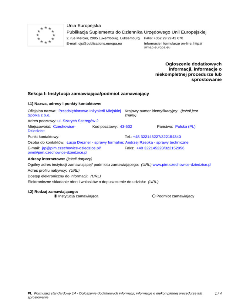 Unia Europejska Publikacja Suplementu do Dziennika Urzędowego Unii Europejskiej 2, rue Mercier, 2985 Luxembourg, Luksemburg Faks: +352 29 29 42 670 E-mail: [email protected] Informacje i formularze on-line: http:// simap.europa.eu Ogłoszenie dodatkowych informacji, informacje o niekompletnej procedurze lub sprostowanie Sekcja I: Instytucja zamawiająca/podmiot zamawiający I.1) Nazwa, adresy i punkty kontaktowe: Oficjalna nazwa: Przedsiębiorstwo Inżynierii Miejskiej Krajowy numer identyfikacyjny: (jeżeli jest Spółka z o.o. znany) _____ Adres pocztowy: ul. Szarych Szeregów 2 Miejscowość: CzechowiceDziedzice Kod pocztowy: 43-502 Punkt kontaktowy: _____ Państwo: Polska (PL) Tel.: +48 322145227/322154340 Osoba do kontaktów: Łucja Drezner - sprawy formalne; Andrzej Rzepka - sprawy techniczne E-mail: [email protected]/ [email protected] Faks: +48 322145228/322152956 Adresy internetowe: (jeżeli dotyczy) Ogólny adres instytucji zamawiającej/ podmiotu zamawiającego: (URL) www.pim.czechowice-dziedzice.pl Adres profilu nabywcy: (URL) _____ Dostęp elektroniczny do informacji: (URL) _____ Elektroniczne składanie ofert i wniosków o dopuszczenie do udziału: (URL) _____ I.2) Rodzaj zamawiającego: Instytucja zamawiająca Podmiot zamawiający PL Formularz standardowy 14 - Ogłoszenie dodatkowych informacji, informacje o niekompletnej procedurze lub sprostowanie 1/4 Sekcja II: Przedmiot zamówienia II.1.1) Nazwa nadana zamówieniu: Kontrakt XV - Wykonanie dokumentacji projektowej w ramach Projektu: „Regulacja gospodarki wodnościekowej w gminie Czechowice-Dziedzice” dla budowy kanalizacji sanitarnej – do realizacji w ramach robót uzupełniających II.1.2) Krótki opis zamówienia lub zakupu: (podano w pierwotnym ogłoszeniu) Przedmiot niniejszego zamówienia stanowią następujące usługi: a) Wykonanie projektów budowlanych zgodnie z ustawą z dnia 7 lipca 1994 r. – Prawo budowlane (tekst jednolity Dz.U. 2010 nr 243 poz. 1623 z późn. zm.) w zakresie sieci kanalizacyjnej wraz z uzyskaniem stosownych prawomocnych decyzji o pozwoleniu na budowę. b) Pełnienie nadzoru autorskiego dla zaprojektowanego zakresu sieci kanalizacyjnej w trakcie realizacji robót budowlanych zgodnie z ustawą Prawo budowlane z dnia 7 lipca 1994 r. (tekst jednolity Dz. U. z 2010 r. Nr 243, poz. 1623 z późn. zm.). c) Wykonanie dokumentacji projektowej, o której mowa w Rozporządzeniu Ministra Infrastruktury z dnia 2 września 2004 r. (Dz. U. Nr 202, poz. 2072 z późn. zm.), służącej do opisu przedmiotu zamówienia na wykonanie robót budowlanych. d) Sporządzenie dokumentacji umożliwiającej udzielenie zamówień uzupełniających na roboty budowlane zgodnie z wymogami ustawy z dnia 29 stycznia 2004 r. Prawo zamówień publicznych (Dz. U. z 2010 r. Nr 113, poz. 759 z późn. zm.), oraz Warunkami Kontraktowymi FIDIC „Czerwona Książka". e) Udzielanie wszelkich niezbędnych odpowiedzi Wykonawcom robót budowlanych dotyczących dokumentacji projektowej. Wykonanie projektów budowlano-wykonawczych sięgaczy kanalizacyjnych wraz z niezbędnymi odcinkami sieci kanalizacyjnej dla działek położonych w gminie Czechowice-Dziedzice (Czechowice-Dziedzice, Zabrzeg i Ligota) na obszarze objętym realizacją następujących Kontraktów: Kontrakt K-IX: Budowa sieci kanalizacyjnej w centrum miasta Czechowice-Dziedzice Kontrakt K-X: Budowa sieci kanalizacyjnej w południowej części miasta Czechowice-Dziedzice Kontrakt K-XI: Budowa kanalizacji i wymiana sieci wodociągowej na terenie sołectwa Zabrzeg Kontrakt K-XII: Budowa kanalizacji i wymiana sieci wodociągowej na terenie sołectwa Ligota a nie uwzględnionych w zakresach projektów budowlano-wykonawczych w/w Kontraktów. Przewidywana ilość sięgaczy: - minimalnie 83 szt, - maksymalnie 300 szt. Szczegółowy opis przedmiotu zamówienia znajduje się w SIWZ - TOM III - OPZ. II.1.3) Wspólny Słownik Zamówień (CPV) Główny przedmiot Dodatkowe przedmioty Słownik główny 71320000 71520000 71318000 Słownik uzupełniający (jeżeli dotyczy) PL Formularz standardowy 14 - Ogłoszenie dodatkowych informacji, informacje o niekompletnej procedurze lub sprostowanie 2/4 Sekcja IV: Procedura IV.1)Rodzaj procedury (podano w pierwotnym ogłoszeniu) Otwarta Ograniczona Ograniczona przyspieszona Negocjacyjna Negocjacyjna przyspieszona Dialog konkurencyjny Negocjacyjna z uprzednim ogłoszeniem Negocjacyjna bez uprzedniego ogłoszenia Negocjacyjna z publikacją ogłoszenia o zamówieniu Negocjacyjna bez publikacji ogłoszenia o zamówieniu Udzielenie zamówienia bez uprzedniej publikacji ogłoszenia o zamówieniu w Dzienniku Urzędowym Unii Europejskiej IV.2)Informacje administracyjne IV.2.1)Numer referencyjny: (podano w pierwotnym ogłoszeniu) 22/FS/2013 IV.2.2)Dane referencyjne ogłoszenia w przypadku ogłoszeń przesłanych drogą elektroniczną: Pierwotne ogłoszenie przesłane przez eNotices TED eSender Login: ENOTICES_pimczdz Dane referencyjne ogłoszenia: 2013-067050 rok i numer dokumentu IV.2.3)Ogłoszenie, którego dotyczy niniejsza publikacja: Numer ogłoszenia w Dz.U.: 2013/S 096-164177 z dnia: 18/05/2013 (dd/mm/rrrr) IV.2.4)Data wysłania pierwotnego ogłoszenia: 17/05/2013 (dd/mm/rrrr) PL Formularz standardowy 14 - Ogłoszenie dodatkowych informacji, informacje o niekompletnej procedurze lub sprostowanie 3/4 Sekcja VI: Informacje uzupełniające VI.1) Ogłoszenie dotyczy: Procedury niepełnej Sprostowania Informacji dodatkowych VI.2) Informacje na temat niepełnej procedury udzielenia zamówienia: Postępowanie o udzielenie zamówienia zostało przerwane Postępowanie o udzielenie zamówienia uznano za nieskuteczne Zamówienia nie udzielono Zamówienie może być przedmiotem ponownej publikacji VI.3) Informacje do poprawienia lub dodania : VI.3.1) Zmiana oryginalnej informacji podanej przez instytucję zamawiającą Publikacja w witrynie TED niezgodna z oryginalną informacją, przekazaną przez instytucję zamawiającą Oba przypadki VI.3.2) W og