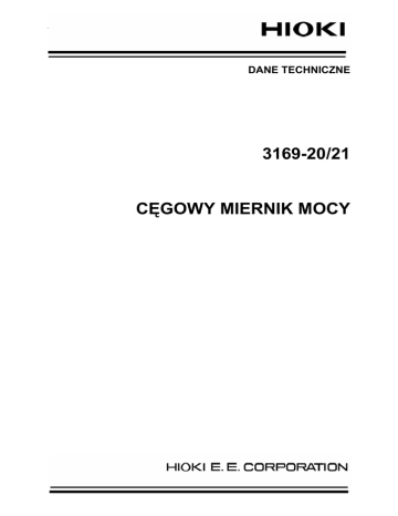 * DANE TECHNICZNE 3169-20/21 CĘGOWY MIERNIK MOCY Dane techniczne dotyczące otoczenia oraz bezpieczeństwa obsługi Otoczenie pracy Zakres temperatur i wilgotności względnych składowania Zakres temperatur i wilgotności względnych pracy Natężenie pola elektrycznego (50/60 Hz przez 15 s) Zasilacz sieciowy Maksymalna moc znamionowa Wymiary Masa Dotyczące normy Pomieszczenia zamknięte, wysokość < 2000 m n.p.m. od -10˚C do +50˚C (od -14˚F do +122˚F), ≤ 80% (brak kondensacji) od 0˚C do +40˚C (od +32˚F do +104˚F), ≤ 80% (brak kondensacji) 5,55 kVsk (czułość prądowa 1 mA) Między gniazdami (wejściami) pomiarowymi napięcia i obudową przyrządu. 3,32 kVsk (czułość prądowa 1 mA) Między gniazdami (wejściami) pomiarowymi napięcia i prąd, między zewnętrznymi wyprowadzeniami interfejsu. 2,3 kVsk (czułość prądowa 1 mA) Między zasilaczem a obudową przyrządu. 1,39 kVsk (czułość prądowa 10 mA) Między zasilaczem a gniazdami (wejściami) pomiarowymi prądu, między zewnętrznymi wyprowadzeniami interfejsu. Znamionowe napięcie zasilania: od 100 do 240 V a.c. Znamionowa częstotliwość zasilania: 50/60 Hz (Są uwzględniane zmiany napięcia równe ±10% znamionowego napięcia zasilania). 30 VA ok. 210 (długość) x 160 (szerokość) x 60 (wysokość) [mm], nie uwzględniają wymiarów elementów wystających). ok. 1,2 kg (3169-20/21) Bezpieczeństwo: EN61010-1:2001 Stopień zanieczyszczenia środowiska 2, kategoria pomiarowa III (przewidywane przepięcia przejściowe: 6000 V) Kompatybilność elektromagnetyczna (EMC): EN61326:1997+A1:1998+A2:2001 klasa A EN61000-3-2:2000 EN61000-3-3:1995+A1:2001 Dane techniczne stopnia wejściowego Typ testowanej instalacji Liczba testowanych układów Częstotliwość testowanej instalacji Izolacja wejść pomiarowych Metoda pomiaru Źródło w kanale synchronizowane PLL Zakres częstotliwości synchronizacji PLL Częstotliwość próbkowania Rozdzielczość przetwornika a/c Rezystancja wejściowa (50/60 Hz) Maksymalne napięcie wejściowe Maksymalne napięcie znamionowe względem ziemi Jednofazowa, dwuprzewodowa (1P2W); jednofazowa, trójprzewodowa (1P3W); trójfazowa, trójprzewodowa (3P3W2M, 3P3W3M) lub trójfazowa, czteroprzewodowa (3P4W, 3P4W4I) 4 układy (1P2W), 2 układy (1P3W, 3P3W2M), 1 układ (3P3W3M, 3P4W, 3P4W4I). Napięcie jest takie same. 50/60 Hz Napięcie: Izolowane wejścia (Brak izolacji między U1, U2, U3 i N). Prąd: Wejścia izolowane przez czujnik cęgów prądowych. Jednoczesne, cyfrowe próbkowanie napięcia i prądu. Synchronizacja PLL lub zegar synchronizowany 50/60 Hz Napięcie U1 Od 45 do 66 Hz 128 punktów / okres 16 bitów Napięcie: 2,0 MΩ ±10% (praca różnicowa) Prąd: 200 kΩ ±10% Wejścia napięciowe: 780 Vsk, 1103 Vp Wejścia prądowe: 1,7 V sk, 2,4 Vp Gniazda wejściowe napięcia: 600 V sk (50/60 Hz) 2 Mierzone parametry Mierzone parametry Napięcie, prąd, moc czynna, moc bierna, moc pozorna, współczynnik mocy, całka mocy czynnej, całka mocy biernej, częstotliwość, harmoniczne. Wyświetlacz Szybkość odświeżania wyświetlacza Zakres wyświetlania Efektywny zakres pomiarowy Język wyświetlania Wyświetlacz Podświetlenie Kontrast Ok. 0,5 s (z wyj. momentu realizacji dostępu do karty PC lub pamięci wewnętrznej lub w trakcie transmisji danych przez łącze RS-232C) Napięcie / prąd: od 0,4% do 130% podzakresu (poniżej 0,4% tłumienie wskazania do zera) Moc: od 0 do 130% podzakresu (gdy napięcie lub prąd jest równy 0, tłumienie wskazania do zera) Poziom harmonicznych: od 0 do 130% zakresu Od 5 do 110% podzakresu Japoński / Angielski Ciekłokrystaliczny, monochromatyczny, typu STN, przekątna 5,7 cala (rozdzielczość 320 x 240 punktów) Automatyczne wyłączenie / włączenie / wyłączenie Regulacja pokrętłem Dodatkowe parametry pomiarowe Pomiar napięcia / prądu Metoda pomiaru Zakres pomiaru Wybór podzakresu Dokładność pomiaru Współczynnik szczytu Rzeczywista wartość skuteczna (True RMS) Napięcie: 150,00/300,00/600,00 V Prąd: Gdy używa się cęgów 9669 (0,5 mV/A): 100,00/200,00/1,0000 kA Gdy używa się cęgów 9661/9695-03 (1 mV/A): 5,0000/10,000/50,000 100,00/500,00 A Gdy używa się cęgów 9660 (1 mV/A): 5,0000/10,000/50,000/100,00 A Gdy używa się cęgów 9667 zakres 5000 A (0,1 mV/A): 5,0000 kA Gdy używa się cęgów 9667 zakres 500 A (1 mV/A): 500,00 A Gdy używa się cęgów 9694 (10 mV/A): 500,00 m/1,0000/5,0000 A Gdy używa się cęgów 9695-02 (10 mV/A): 500,00 m/1,0000/5,0000/ 10,000/50,000 A (wybieranych oddzielnie dla każdego układu) Ręczny (oddzielny podzakres prądowy wybierany dla każdego układu) Napięcie: ±0,2 w.w. ±0,1% w.p. Prąd: ±0,2 w.w. ±0,1% w.p. + wyspecyfikowana dokładność cęgów prądowych Napięcie: 2 lub mniej (sygnał wejściowy o wartości pełnozakresowej) Prąd: 4 lub mniej (sygnał wejściowy o wartości pełnozakresowej, 2 lub mniej przy wybranych podzakresach 500 A, 1 kA i 5 kA) Pomiar mocy czynnej Zakres pomiaru Dokładność pomiaru Zależy od kombinacji podzakresów napięcie x prąd ±0,2% w.w. + 0,1% w.p. + wyspecyfikowana dokładność cęgów prądowych (współczynnik mocy = 1) Wpływ współczynnika mocy ±1,0% w.w. (od 45 do 66 Hz, współczynnik mocy = 0,5) Wyświetlanie polaryzacji Dla mocy pobieranej – brak wyświetlonego symbolu Dla mocy oddawanej – wyświetlony symbol „-„ Pomiar mocy biernej Zakres pomiaru Metoda pomiaru miernikiem mocy biernej Dokładność pomiaru Zależy od kombinacji podzakresów napięcie x prąd Nie używana: Obliczanie na podstawie wyników pomiaru napięcia, prądu i mocy czynnej Używana: Bezpośredni pomiar mocy biernej metodą miernika mocy biernej. Gdy nie jest zastosowana metoda miernika mocy biernej: Każdy obliczony wynik ±1 cyfra 3 Wpływ współczynnika mocy biernej Wyświetlanie polaryzacji Gdy jest zastosowana metoda miernika mocy biernej: ±0,2% wskazania ±0,1% wartości pełnozakresowej + wyspecyfikowana dokładność cęgów prądow