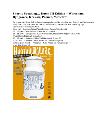 Shortly Speaking… Dutch III Edition – Warschau, Bydgoszcz, Kraków, Poznan, Wrocław De organisatie Kino Lab in Warschau organiseert elke twee jaar een festival met Nederlandse korte films. Dit jaar vindt het festival plaats van 22 april tot en met 30 mei op vijf verschillende lokaties in Polen. Kino Lab - Centrum Sztuki Współczesnej Zamek Ujazdowski 22 - 25 april - Warschau - Kino Lab, ul. Jazdów 2 23 - 25 april - Bydgoszcz - Kino w Muzeum, Muzeum Okręgowe im. Leona Wyczółkowskiego, ul. Gdańska 4 10 - 12 mei - Kraków - Kino Pod Baranami, Rynek 27 7 – 13 mei - Poznan - Kino Rialto, ul. Dąbrowskiego 38 Data nog onbekend - Wrocław - Kino Atom, ul. Piłsudskiego 74 www.kinolab.art.pl